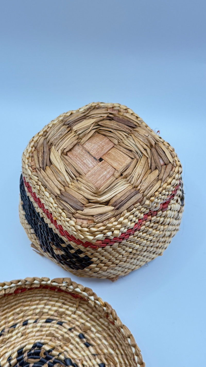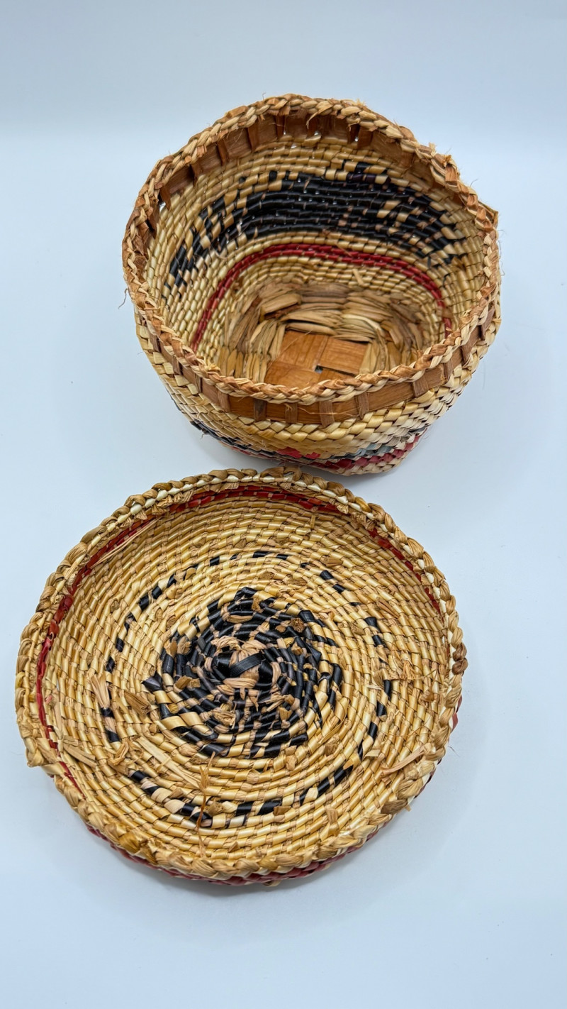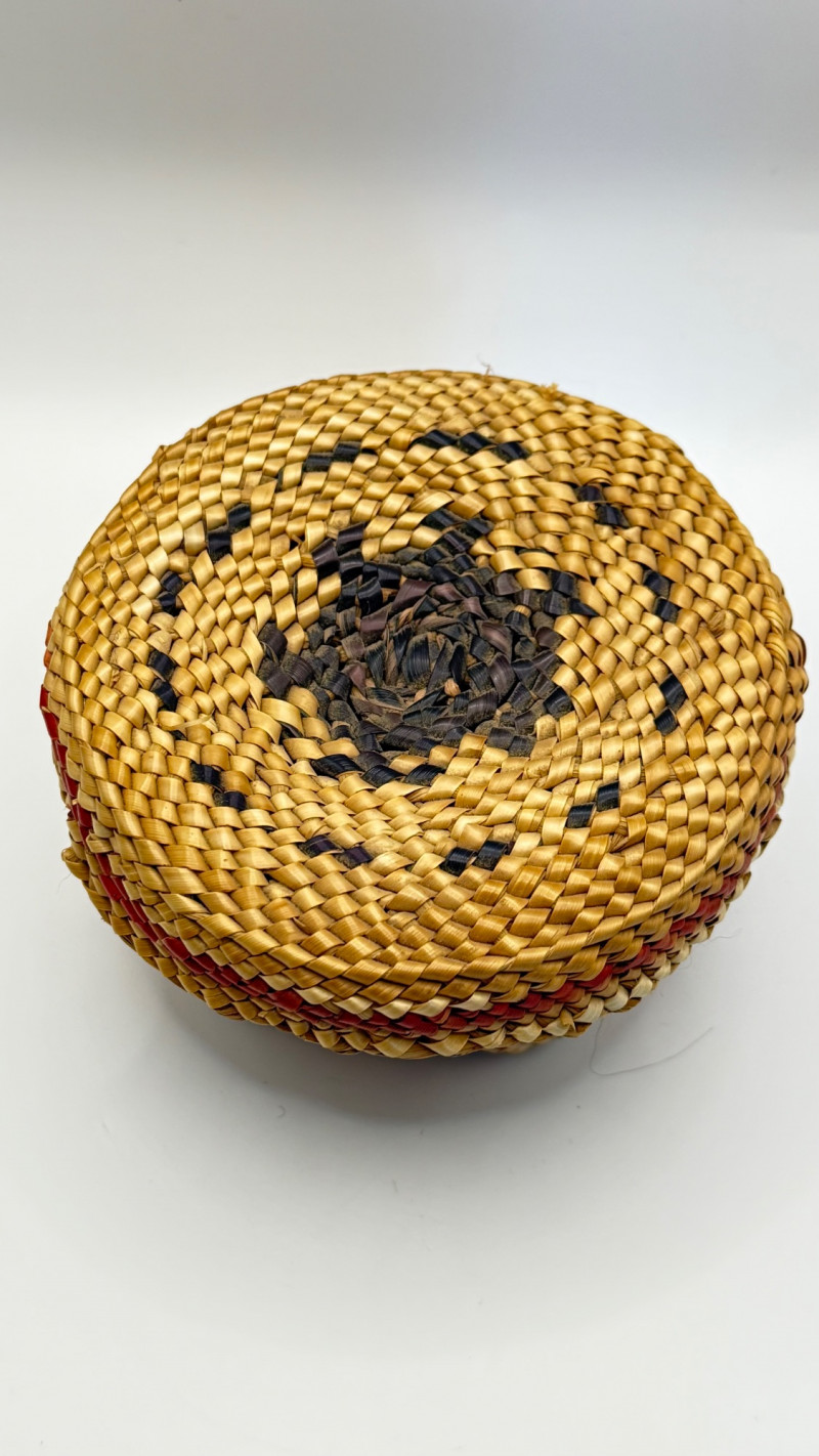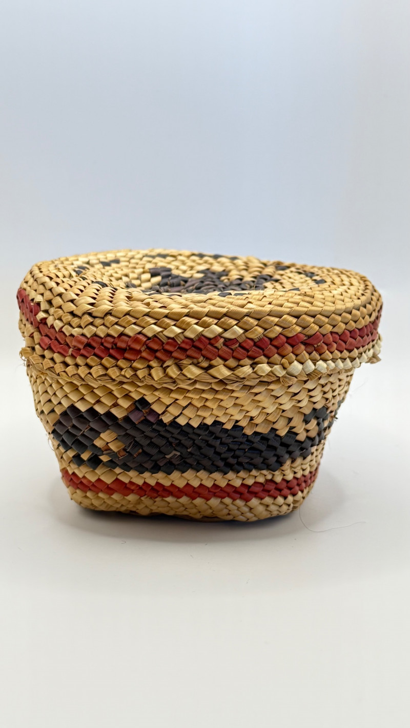 This is a hand‑woven Makah basket made from split Western red cedar with cedar bark and dyed weft elements. The Makah Tribe (Neah Bay, Washington) is renowned for its finely woven cedar baskets, often incorporating geometric patterns and tight, durable stitching. This basket is signed “L. Jones”, which corresponds to a known family name among Makah weavers.