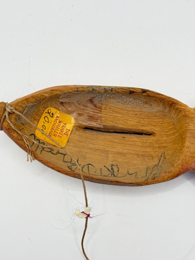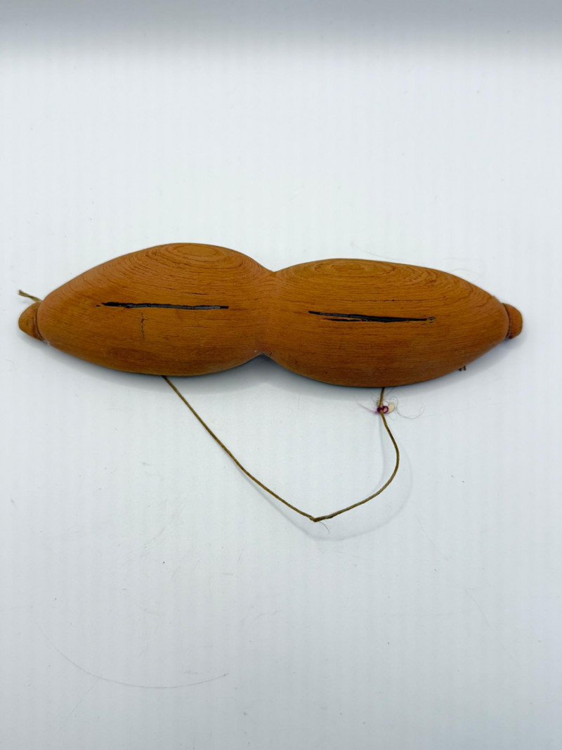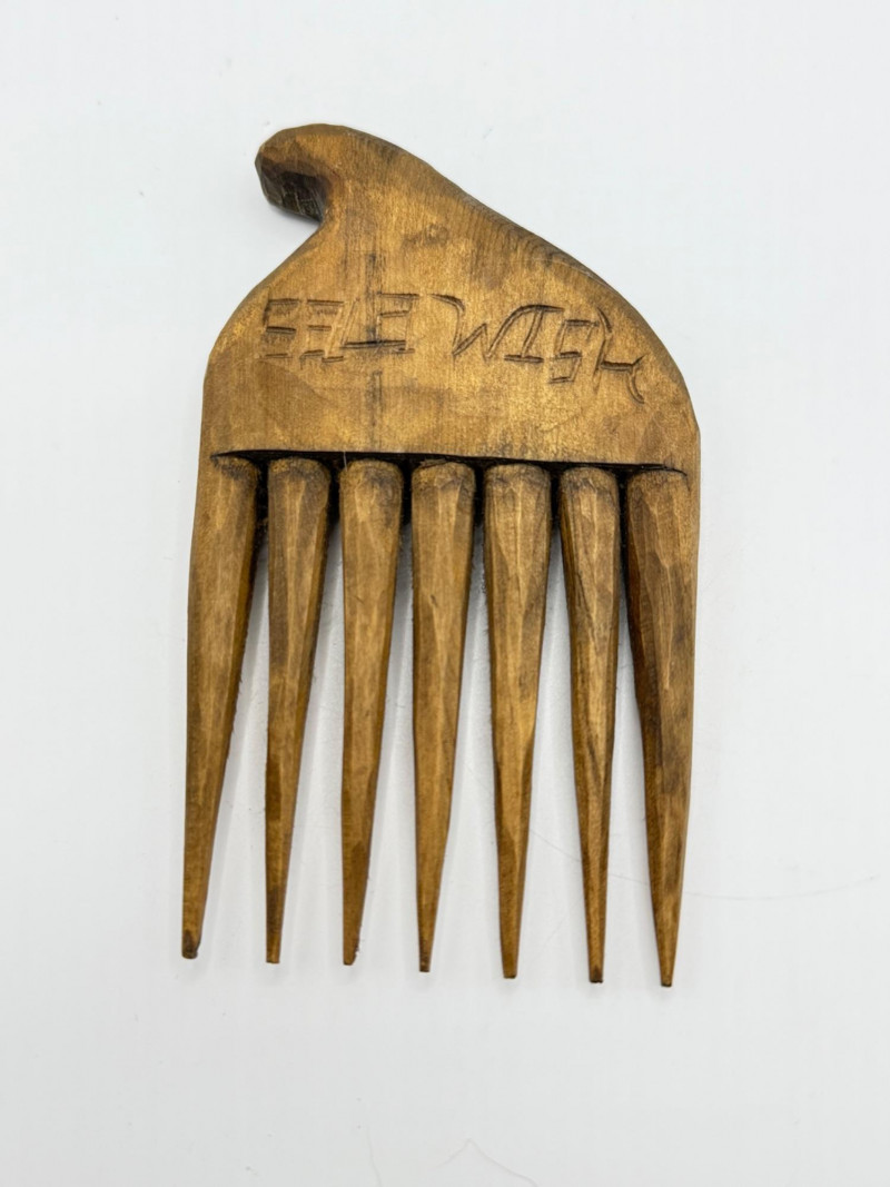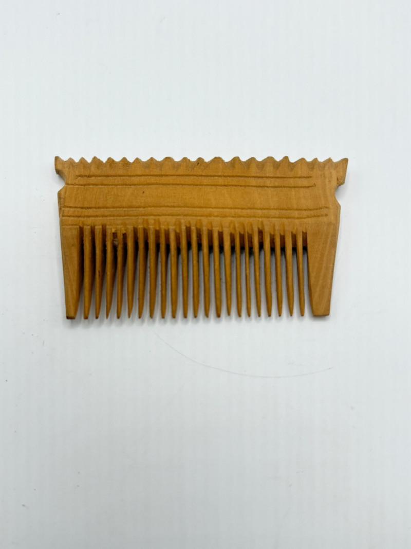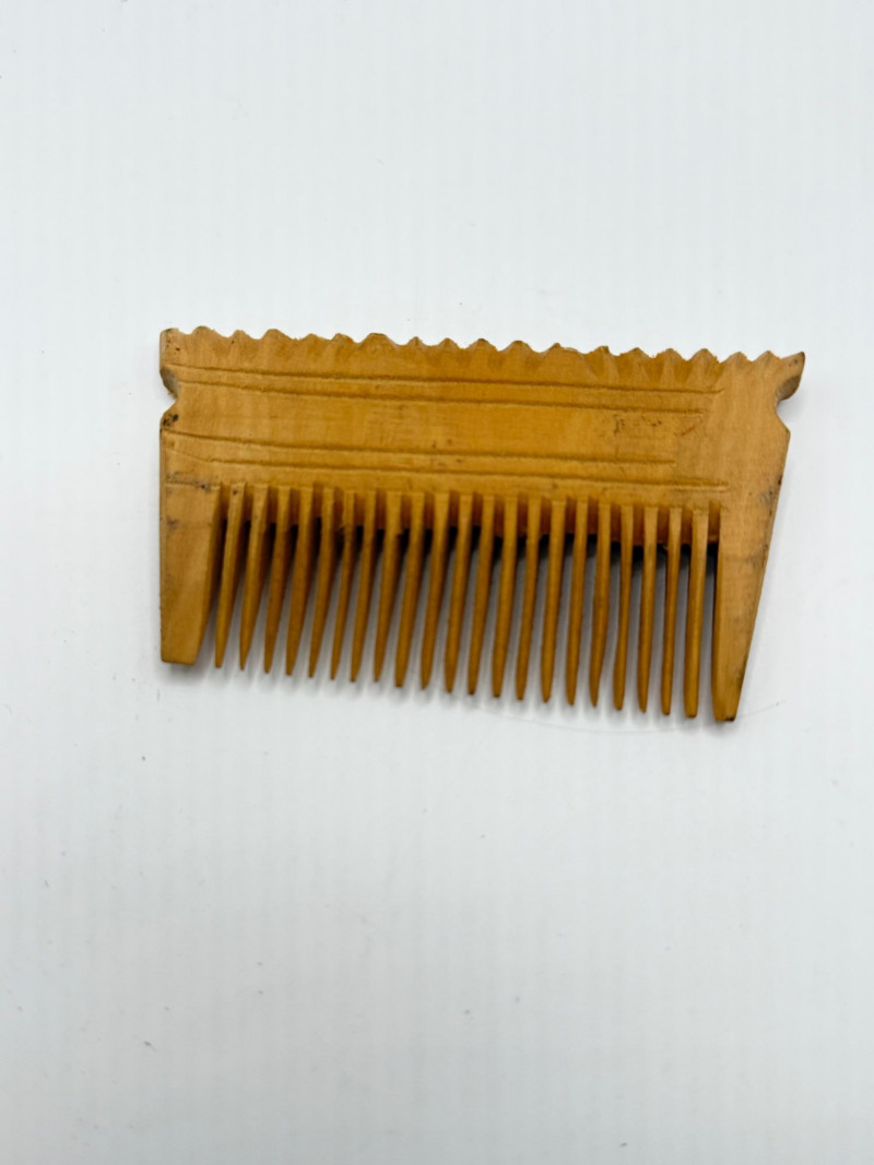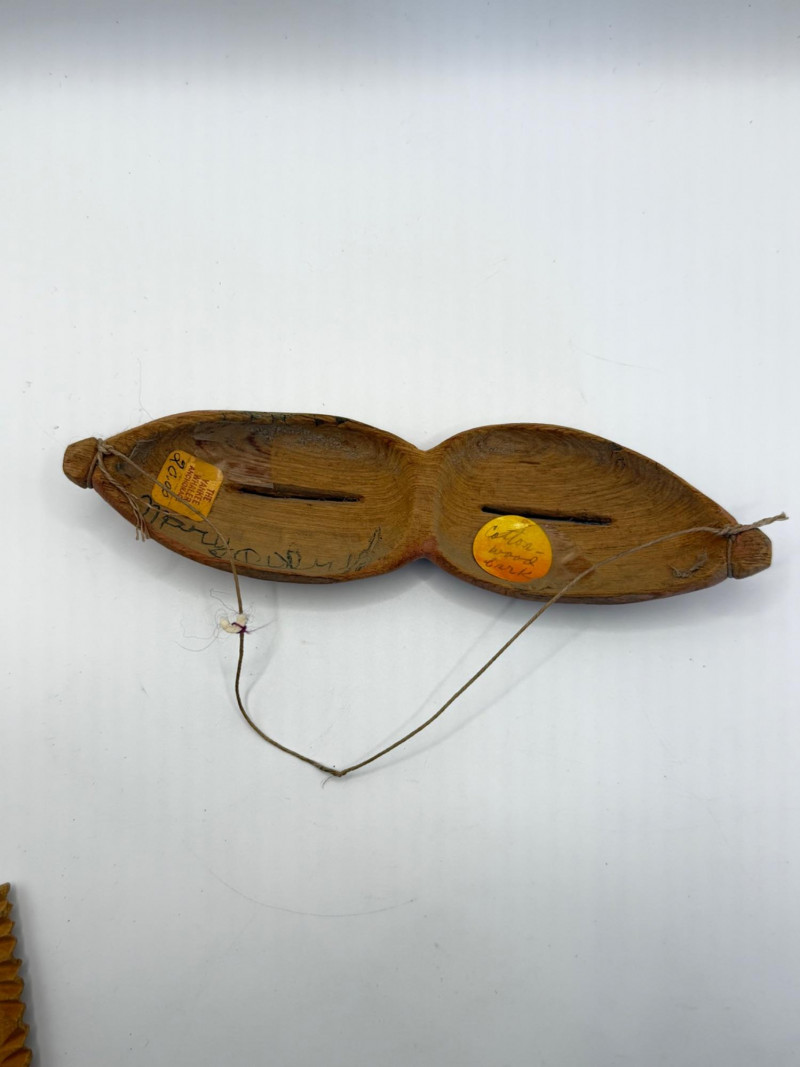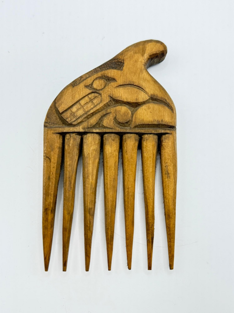 1. Snow Goggles (Top Piece)This carved wooden piece is modeled after traditional Inuit/Yup’ik snow goggles, which use narrow slits to reduce glare from sun on snow. This example includes: Carved wood body. Two narrow horizontal slits. Attached cord. Stylized mask‑like shape. 2. Large Carved Wooden Comb (Left)This comb features: Wide, long teeth. A carved face or mask motif at the top. A rustic, hand‑tooled finish. The style resembles Northwest Coast–inspired folk carving. Without tribal attribution, list it as a Native‑style carved wood comb. 3. Small Fine‑Toothed Wooden Comb (Right)This comb includes: Fine, closely spaced teeth. A decorative carved crest. Smooth, polished finish.