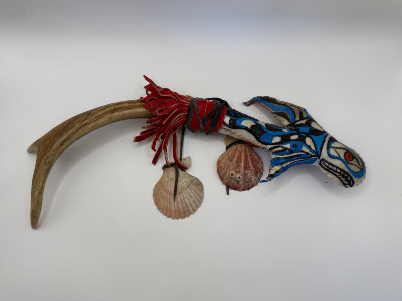 This piece is a decorative antler rattle featuring a painted whale or sea‑creature motif in a style inspired by Northwest Coast Native art. The bold black, red, blue, and white formline‑style painting reflects the visual language of tribes such as the Tlingit, Haida, or Kwakwaka’wakw, though the carving itself appears to be a contemporary, Native‑style artisan piece, not a traditional or ceremonial tribal artifact.