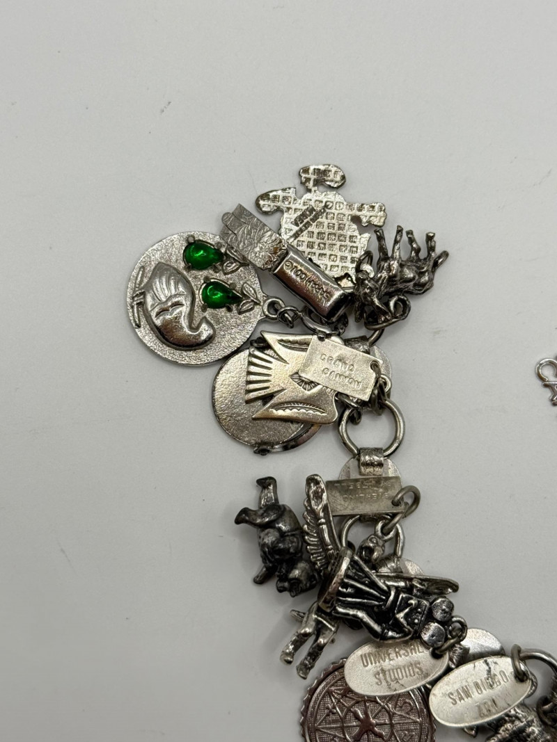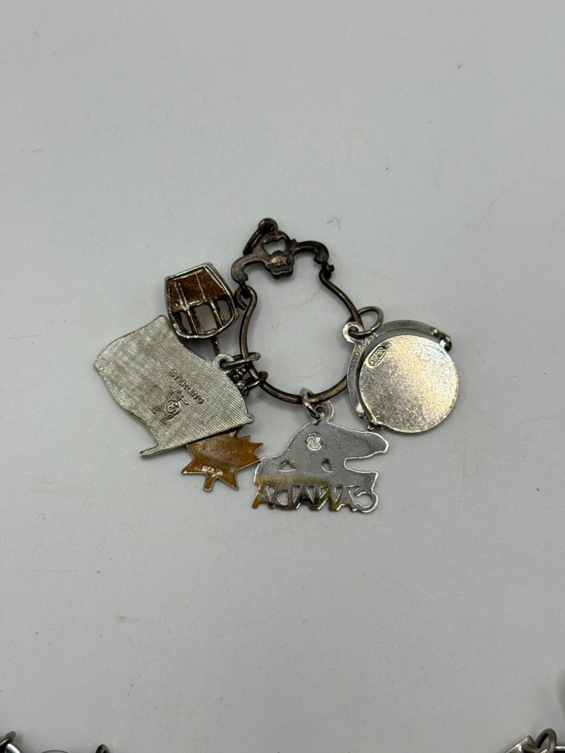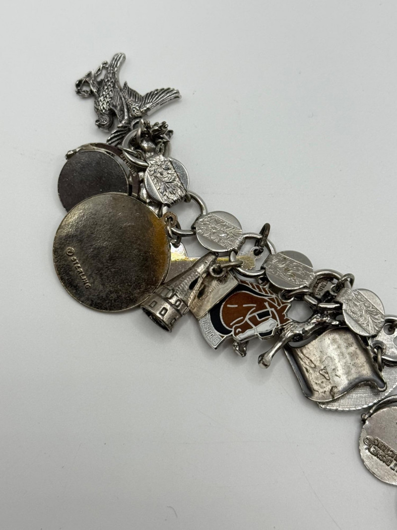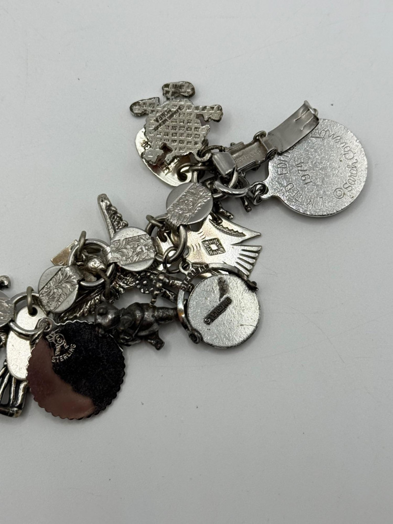 Most of the charms appear to be sterling. The bracelet is Sarah Coventry.