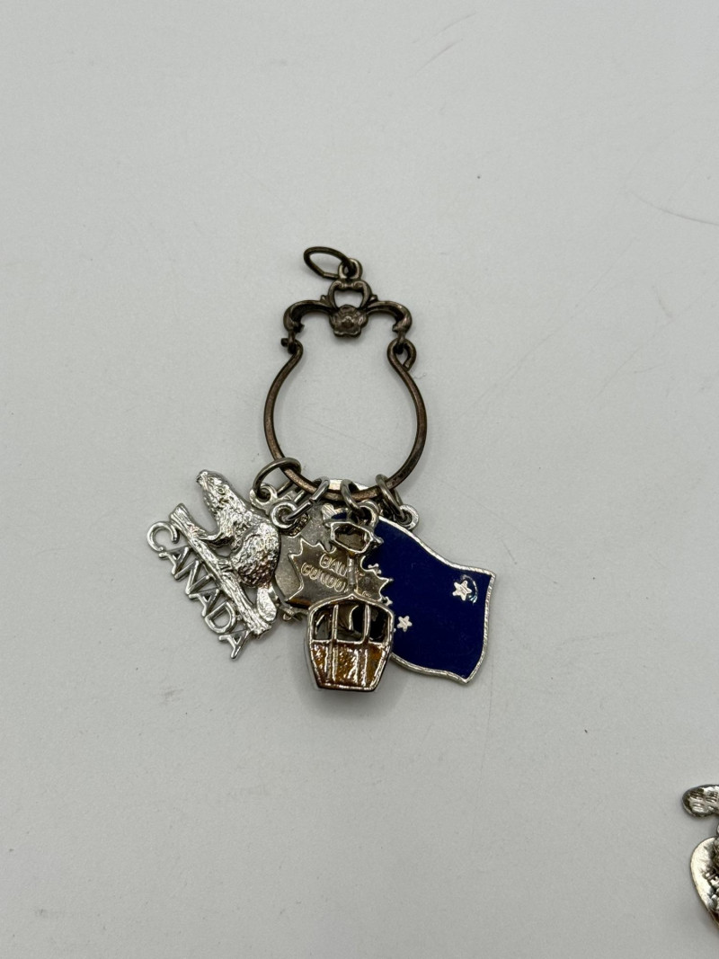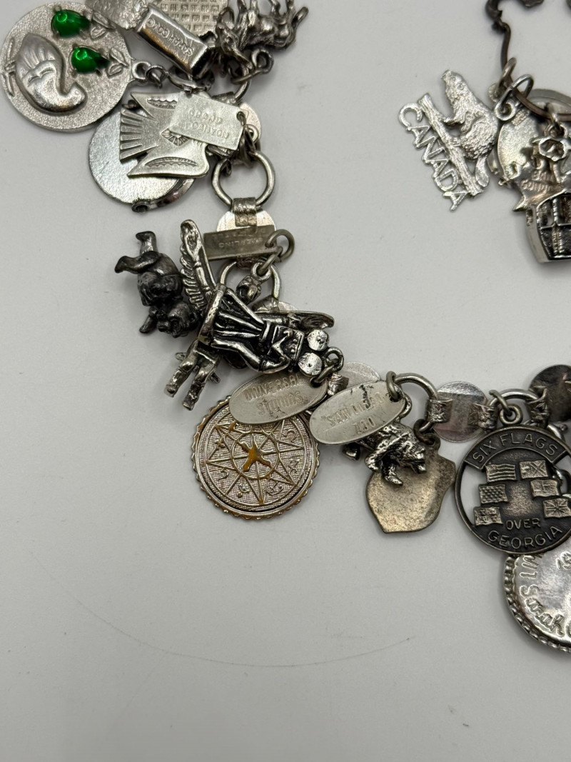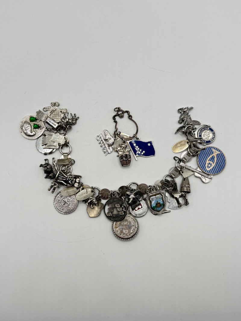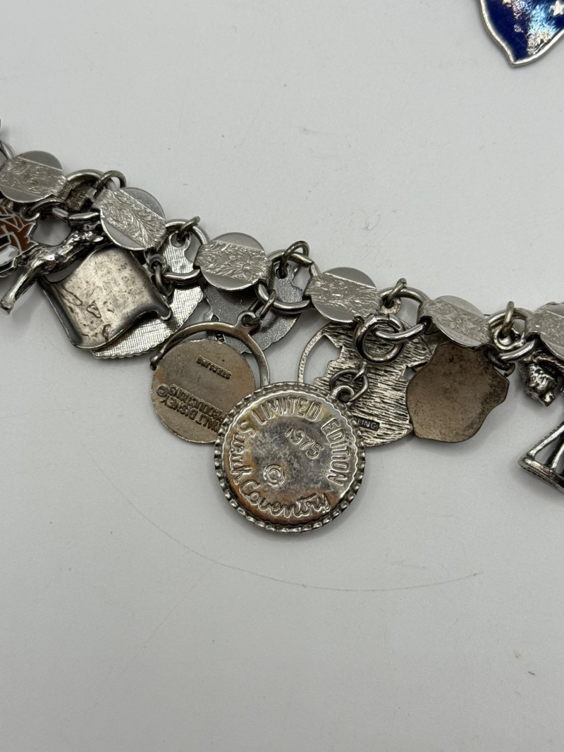 Most of the charms appear to be sterling. The bracelet is Sarah Coventry.