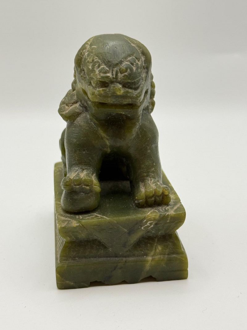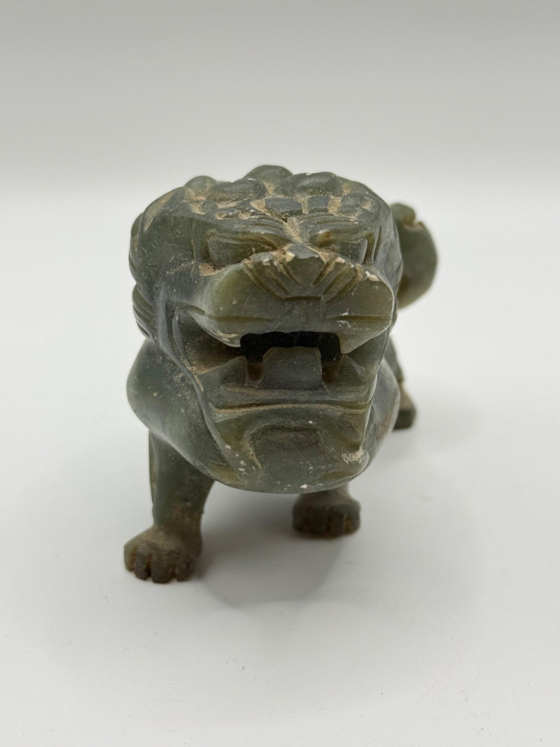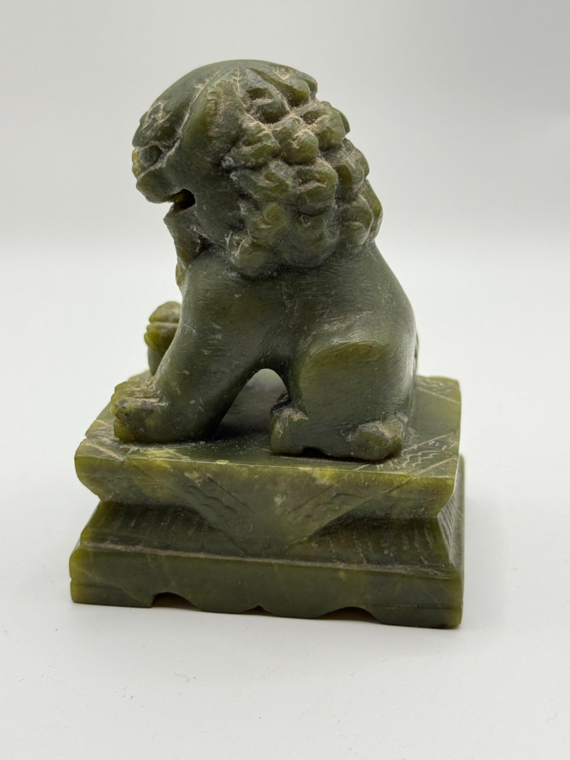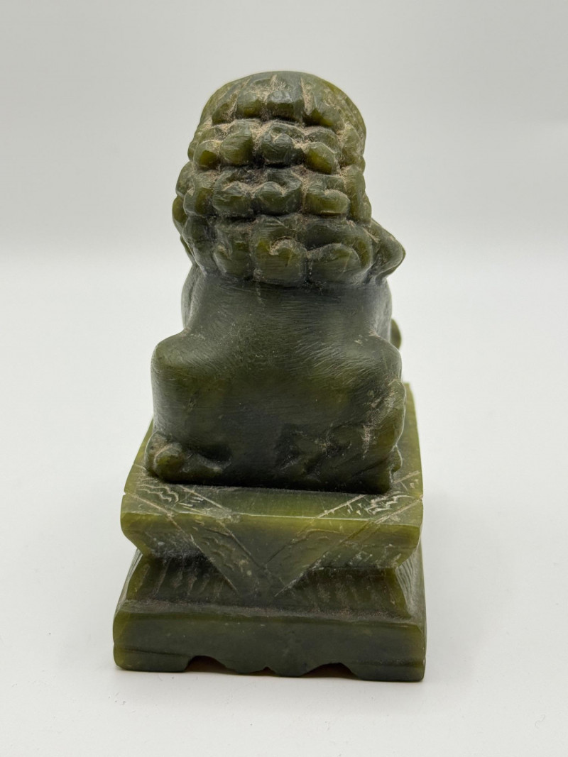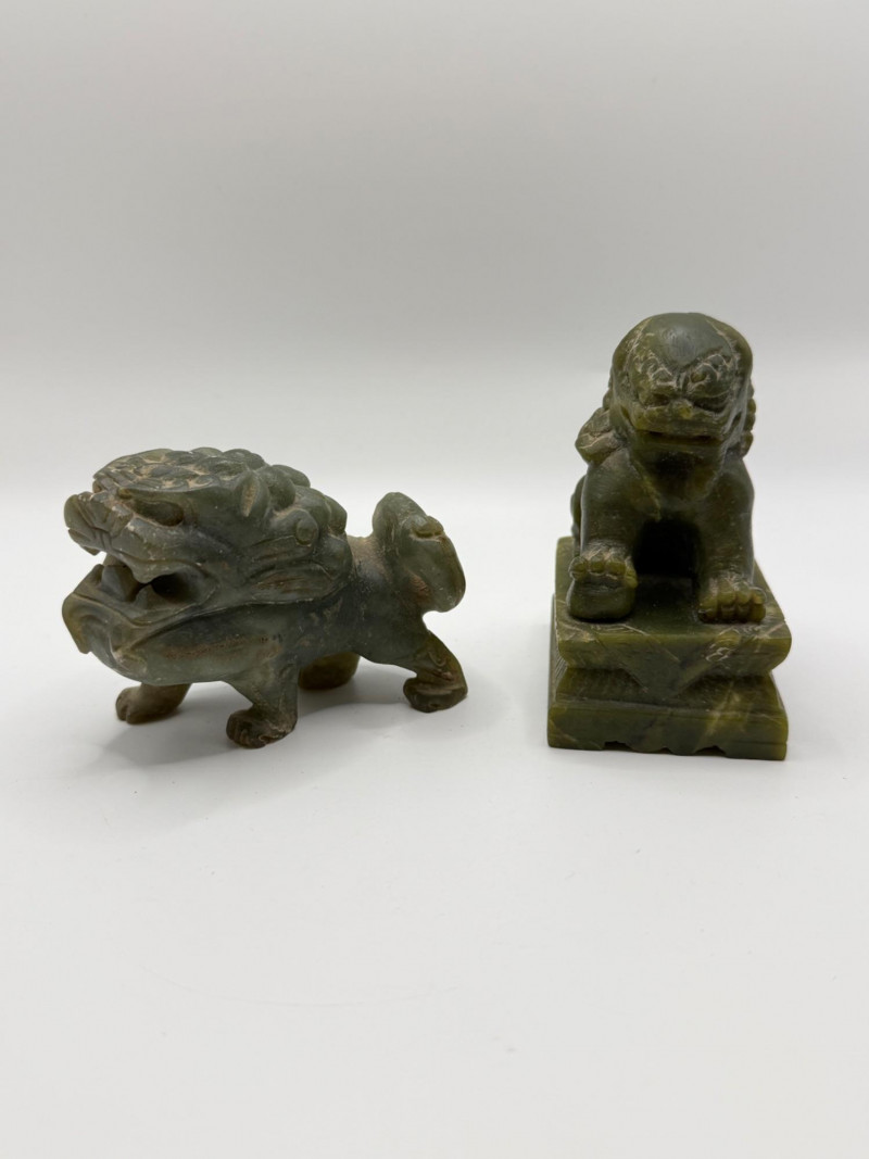 Small carved stone guardian lions, each rendered in a traditional Chinese style with detailed manes, expressive faces, and protective postures. One lion stands on all fours with an open mouth, while the other sits upright on a square plinth with one paw raised. Both pieces are carved from mottled green stone with natural variations and a smooth finish.