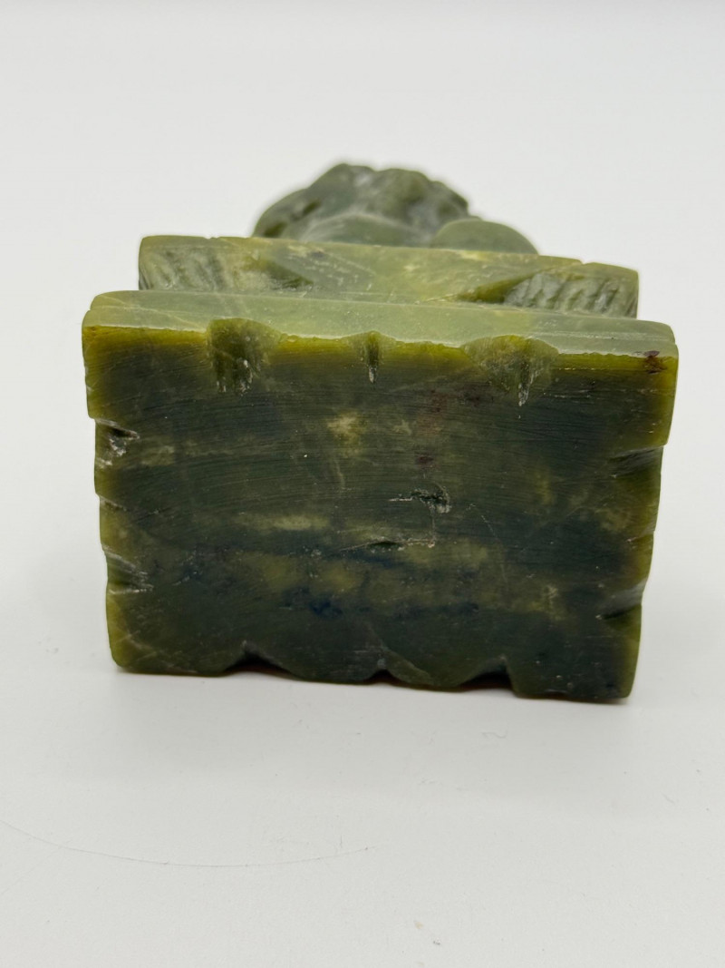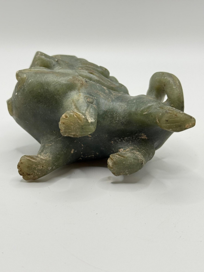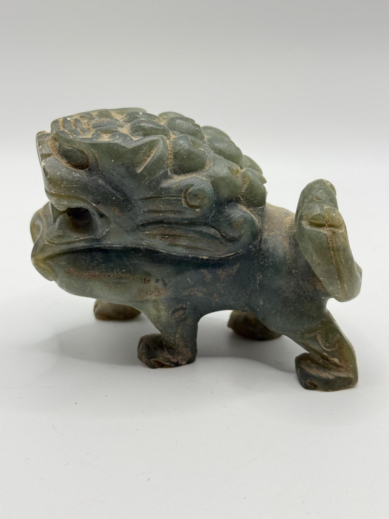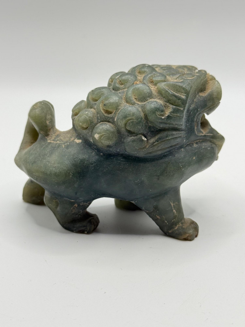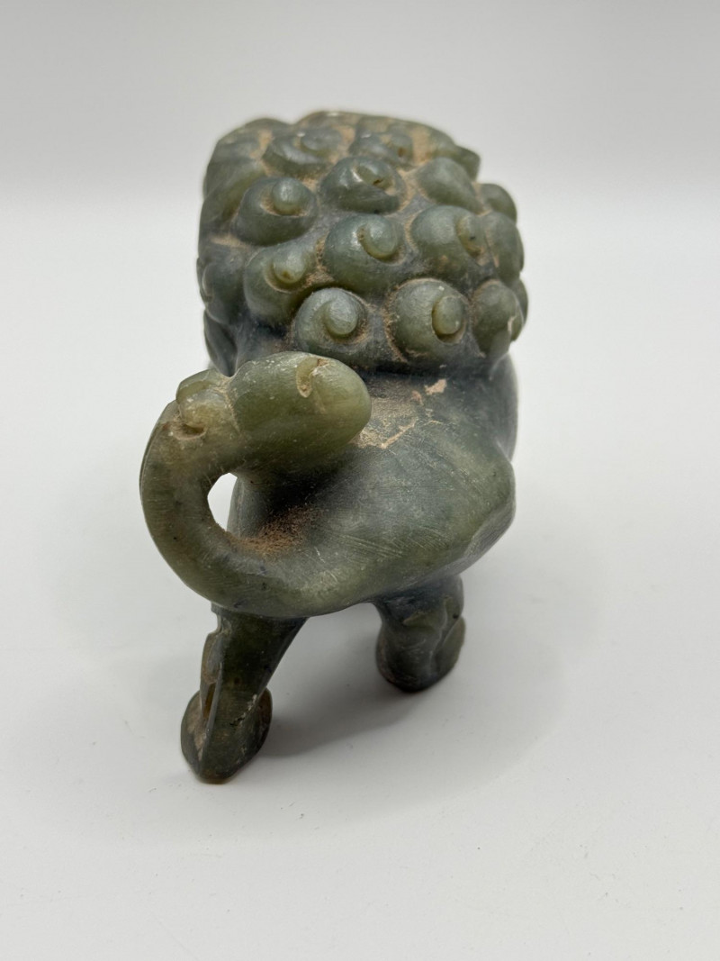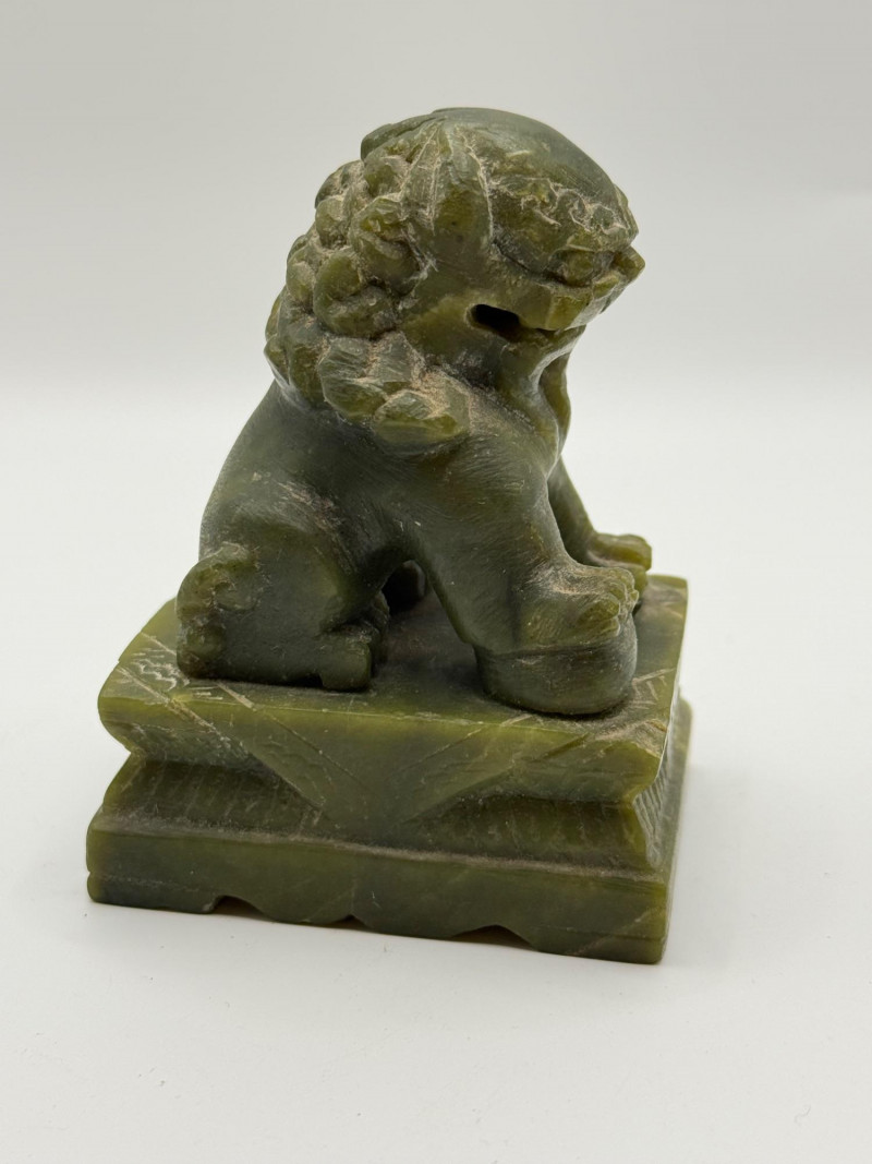 Small carved stone guardian lions, each rendered in a traditional Chinese style with detailed manes, expressive faces, and protective postures. One lion stands on all fours with an open mouth, while the other sits upright on a square plinth with one paw raised. Both pieces are carved from mottled green stone with natural variations and a smooth finish.