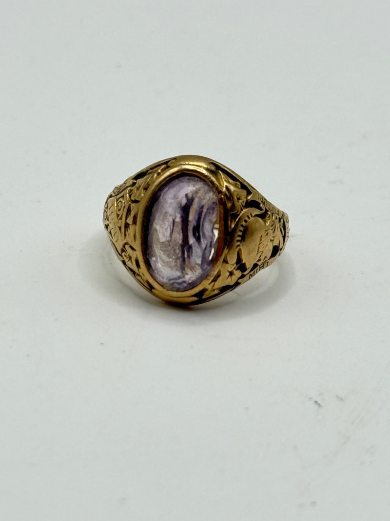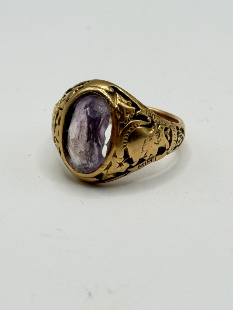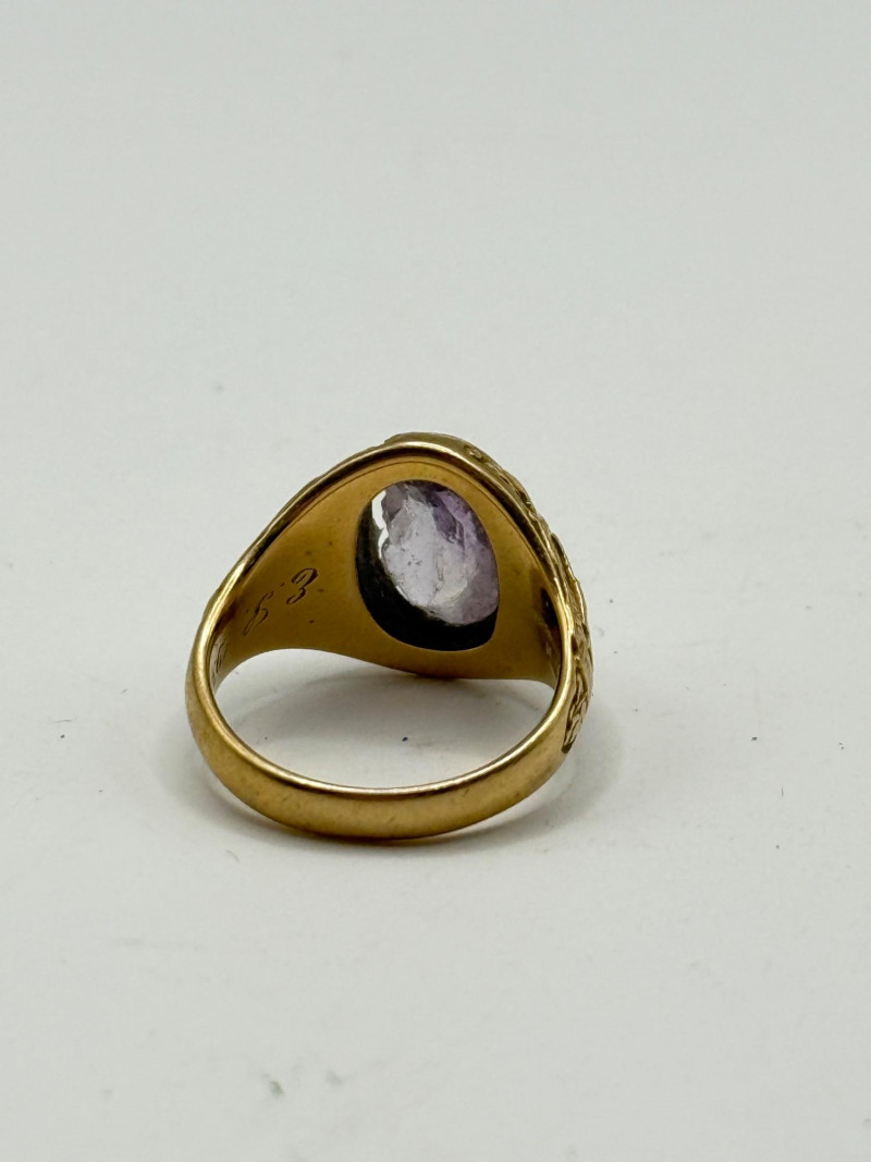 Tiffany & Co. 14k gold ring set with an oval amethyst. The stone shows visible flaws. The ring weighs 7.5 grams and is about a size 5. Classic Tiffany styling with engraved decorative details along the band. Overall wear consistent with age and use.