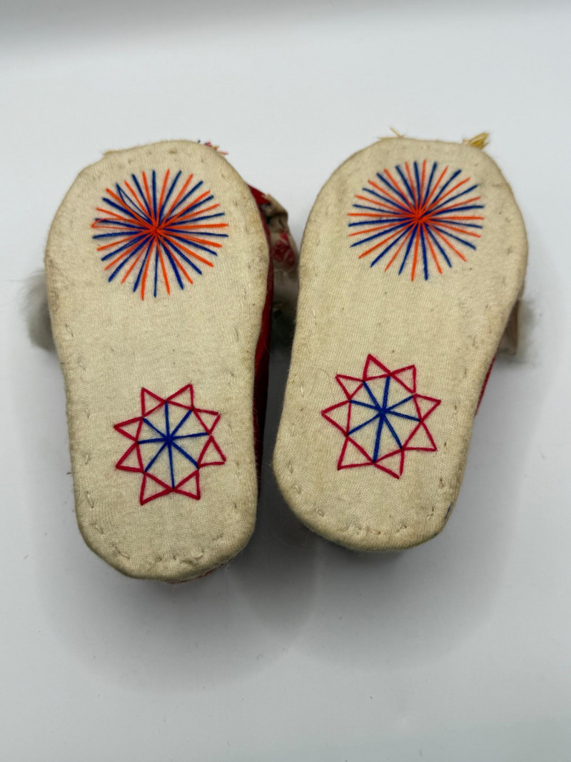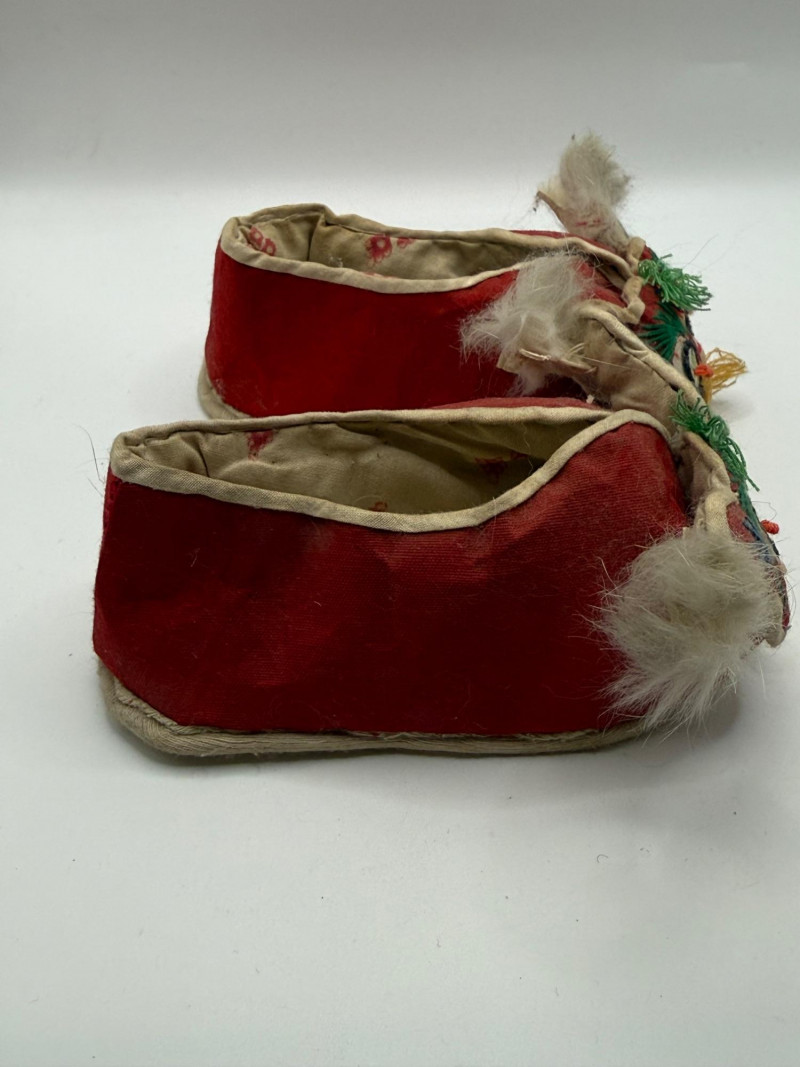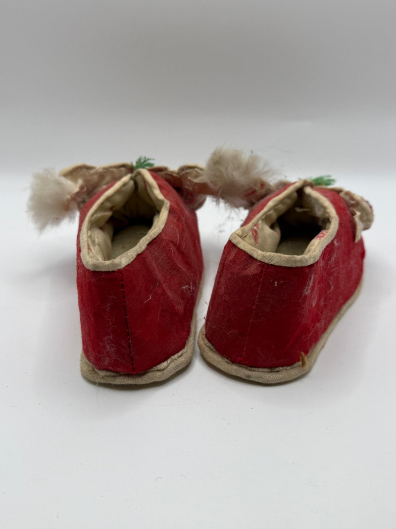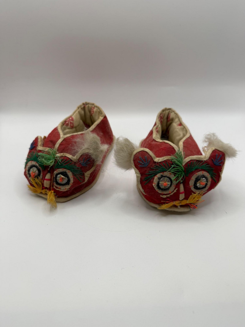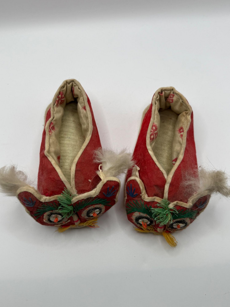Pair of traditional Chinese children’s “tiger shoes,” crafted from red fabric with embroidered facial features, including stitched eyes, whiskers, and decorative threadwork. Designed in the style of protective folk shoes meant to symbolize strength and ward off harm. Each shoe includes applied fabric details and white faux‑fur accents. Shows light wear consistent with age and handling.