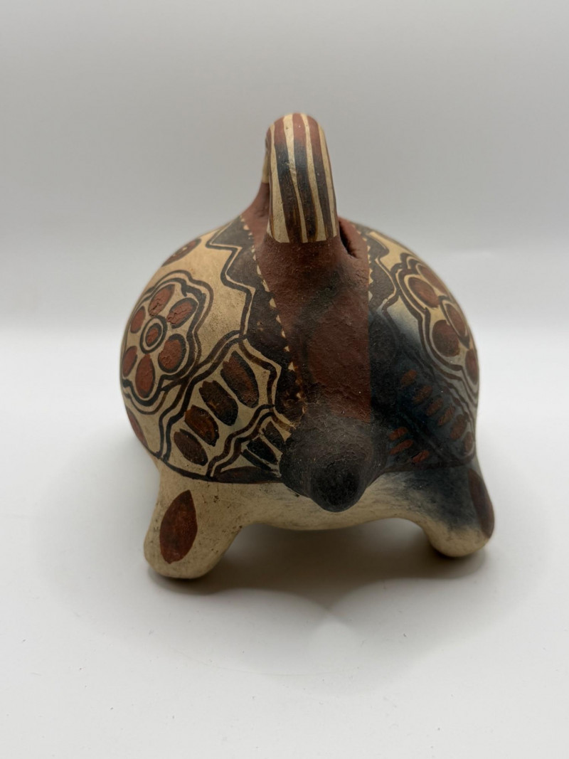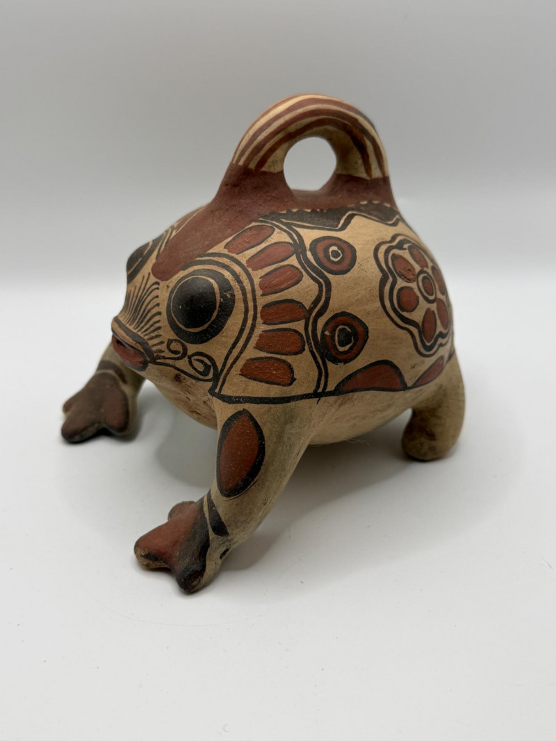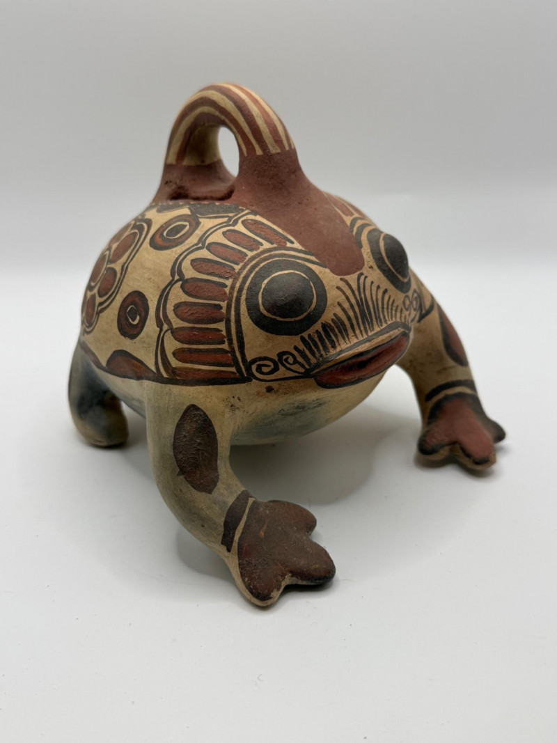 Handcrafted ceramic vessel in the form of a frog, featuring four sculpted legs, a rounded body, and an arched handle. Decorated with painted geometric and circular motifs in earthy red, brown, and beige tones. The piece displays a folk‑art or Indigenous‑inspired style and has a matte surface with natural variations from hand‑forming and firing. Appears in good overall condition with light wear consistent with age and handling.