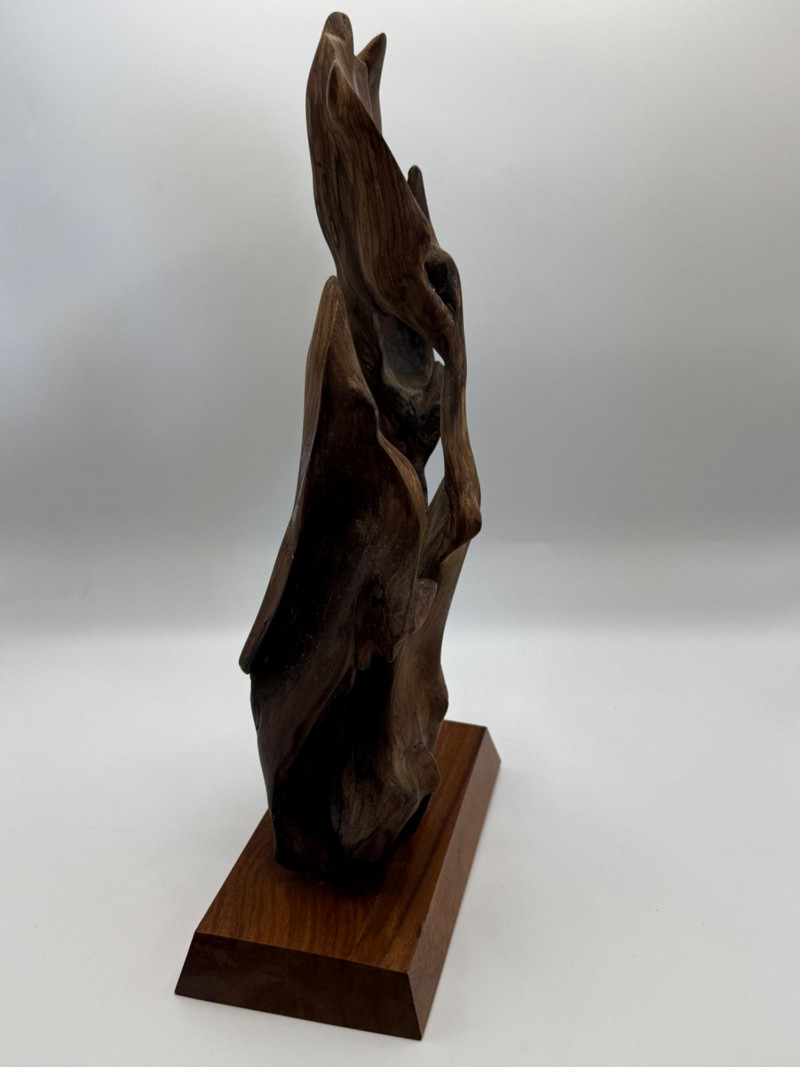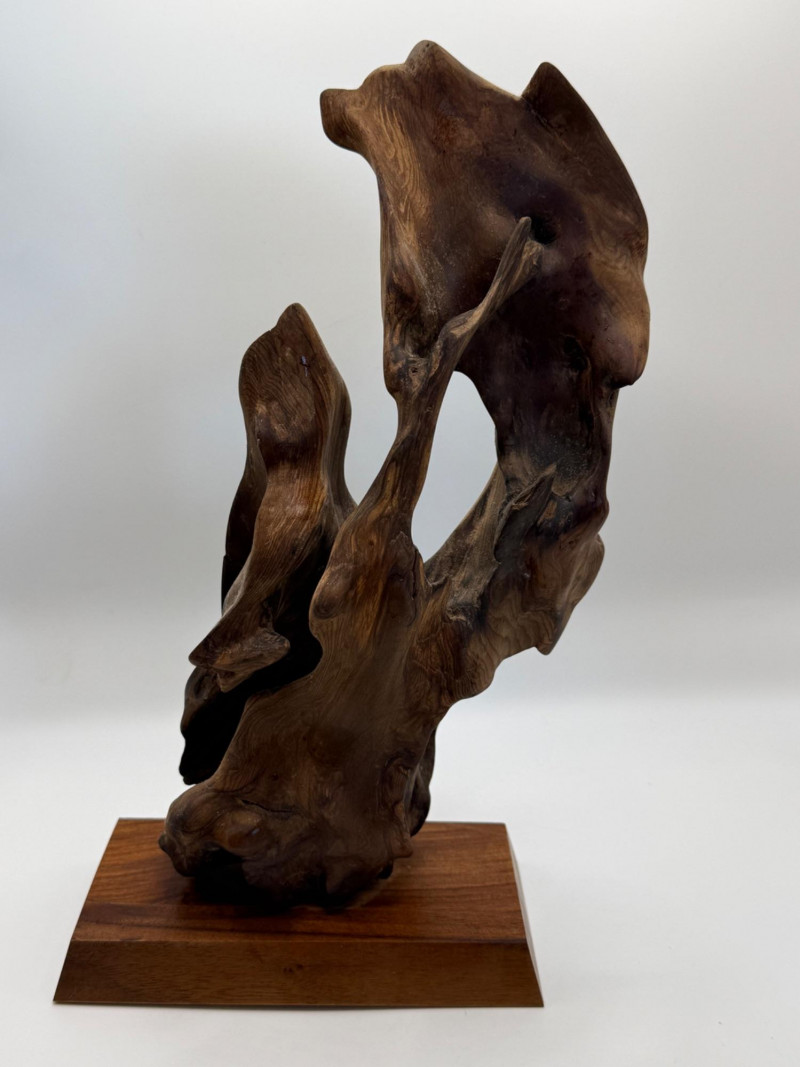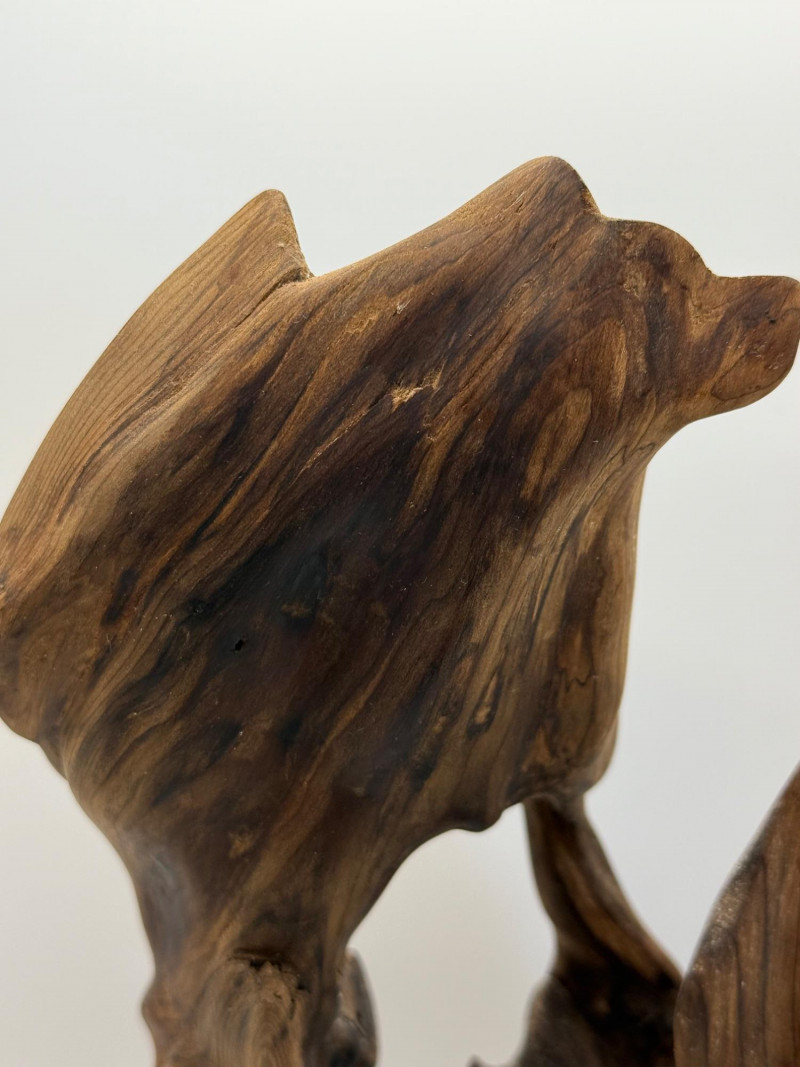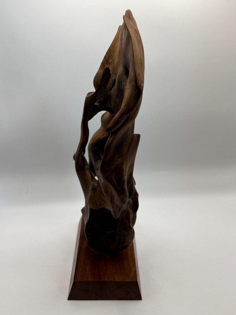 A natural wood sculpture mounted on a rectangular wooden base. The form is abstract and organic, resembling driftwood or a naturally weathered root. Materials & Finish Solid natural wood Smooth, polished surface with visible grain Darker natural inclusions and texture variations Mounted on a matching wood base for stability Design Notes Organic, free‑form shape with flowing curves Emphasizes the natural character of the wood Contemporary decorative style — suitable for shelf, desk, or art display One‑of‑a‑kind piece due to natural formation