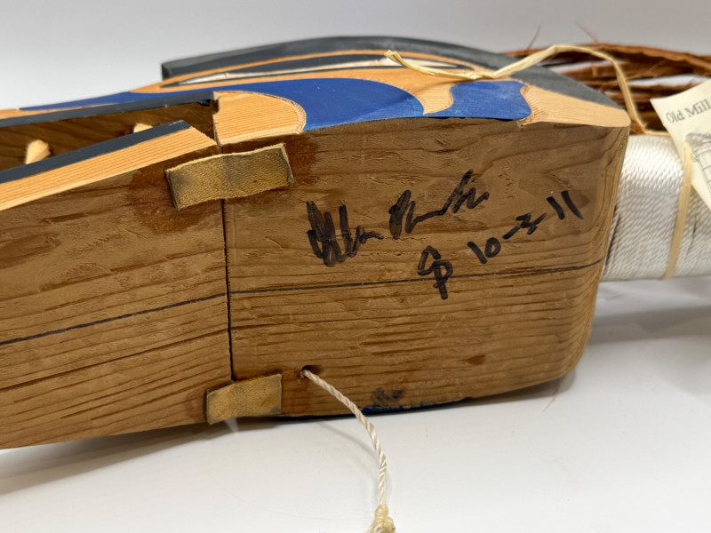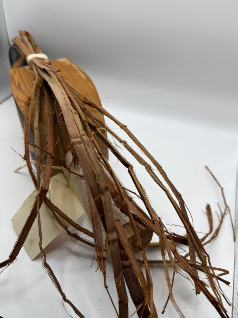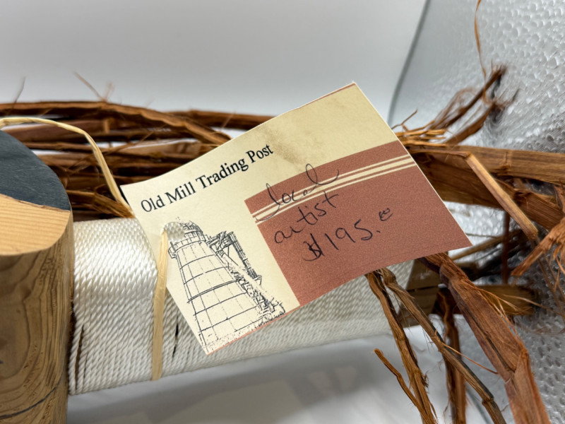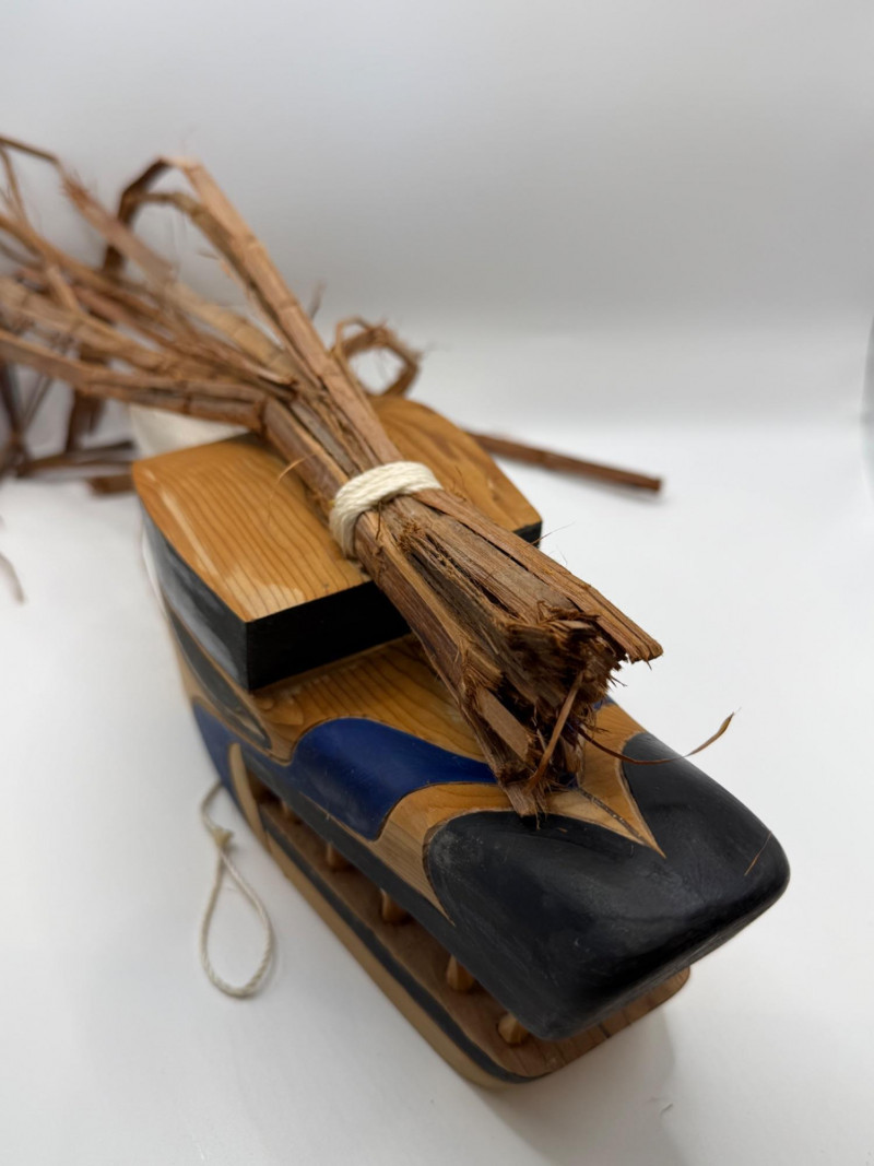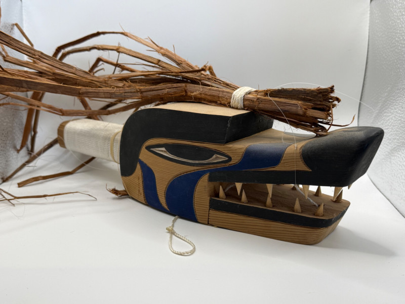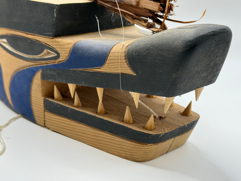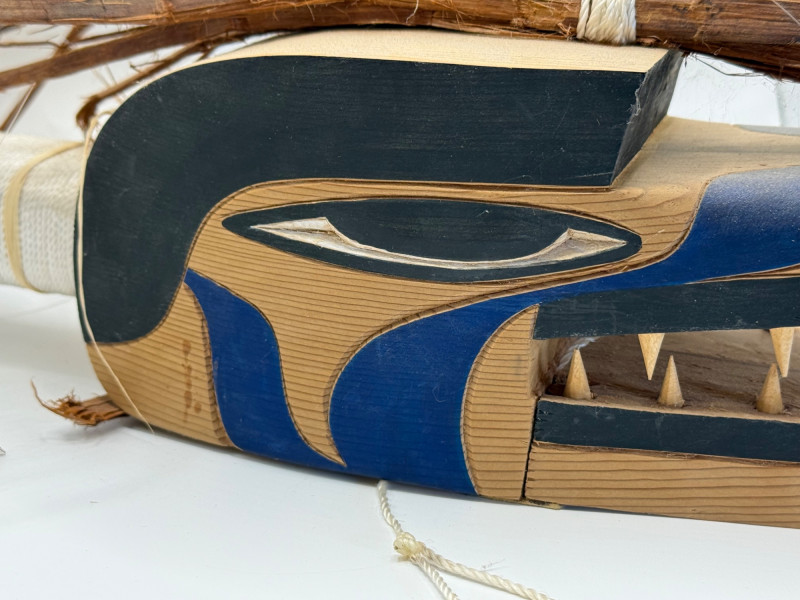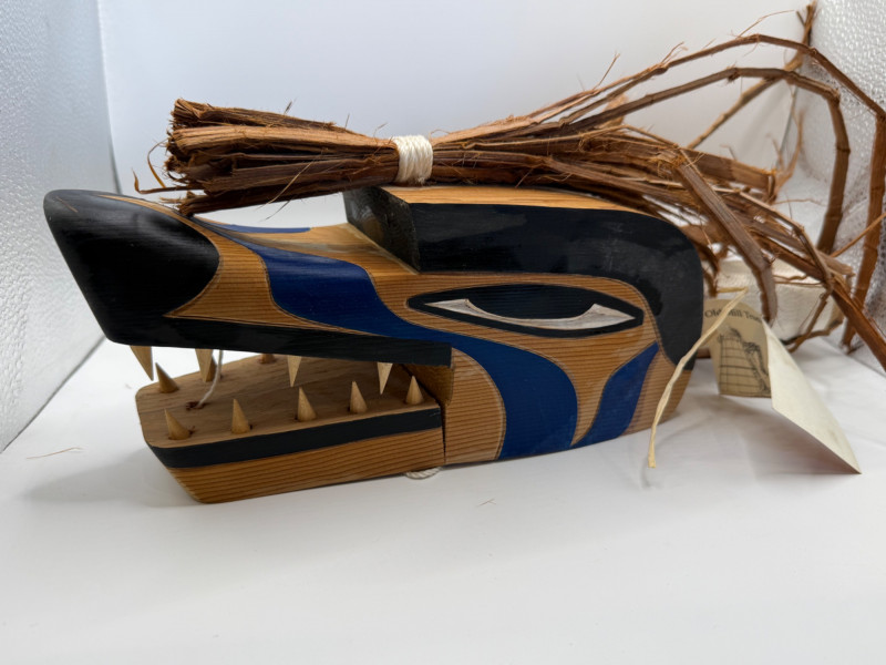A hand‑carved wooden puppet head or mask in the style of Indigenous Northwest Coast storytelling figures. These types of pieces are often used in educational, cultural, or theatrical storytelling settings rather than as ceremonial regalia. Key Features Carved from a single piece of wood Stylized animal head (wolf/canine‑type form) Painted details in black and blue around eyes and mouth Open mouth with carved wooden teeth Natural plant fibers/bark tied to the top for hair or crest Hanging cord attached for display or manipulation Tag present (likely identifying maker or origin) Storytelling puppets and masks like this are commonly made by Native and Native‑inspired carvers for: Teaching traditional stories Demonstrating animal characters Decorative or collector purposes Tourist and gallery markets Because it includes stylized features and mixed materials, it fits the category of Native‑style folk art rather than a documented ceremonial object.