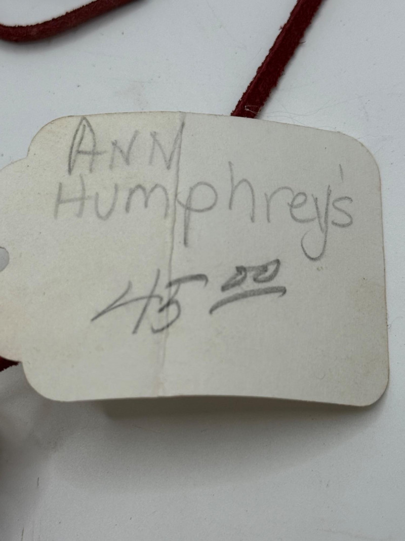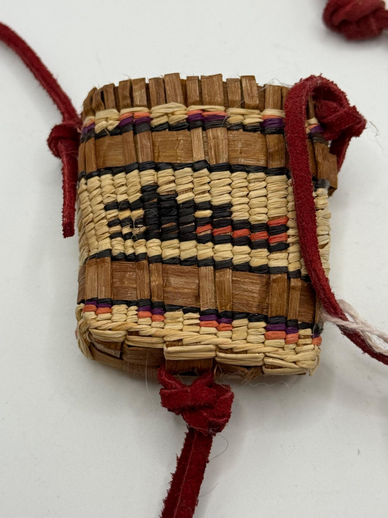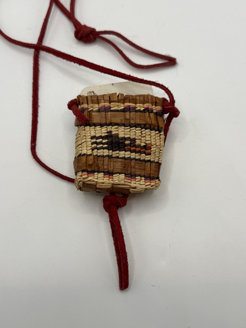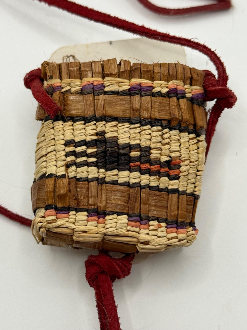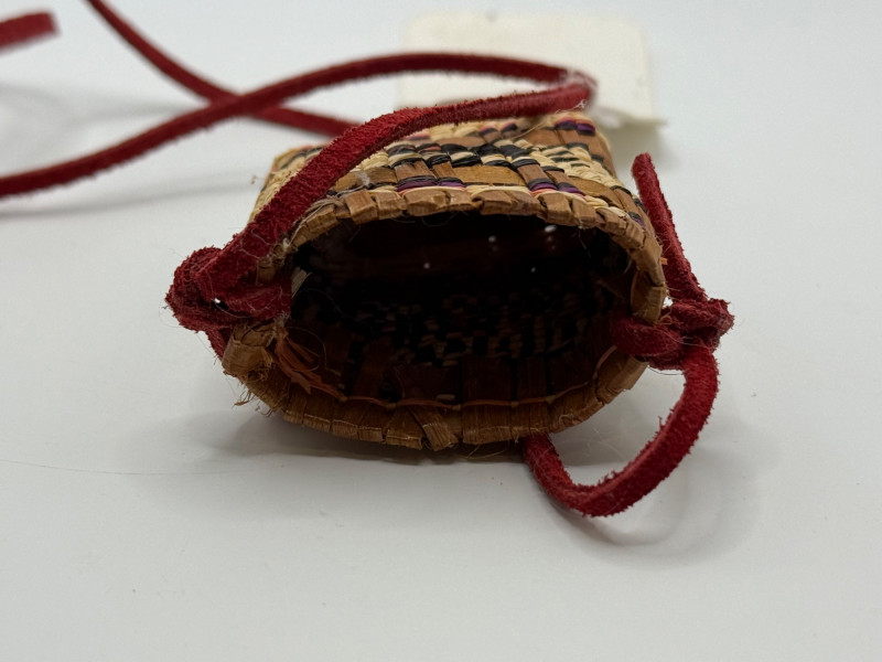 A small hand‑woven pouch created by fiber artist Ann Humphreys, known for using natural materials and traditional weaving techniques in contemporary craft pieces. Materials & Construction Natural plant fibers woven in alternating light and dark tones Accents in reddish and purple‑dyed fibers Red cord or leather tie wrapped around the pouch for closure and display Compact, tightly woven structure with decorative patterning