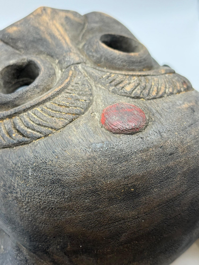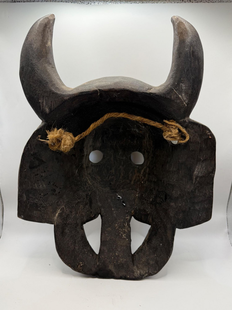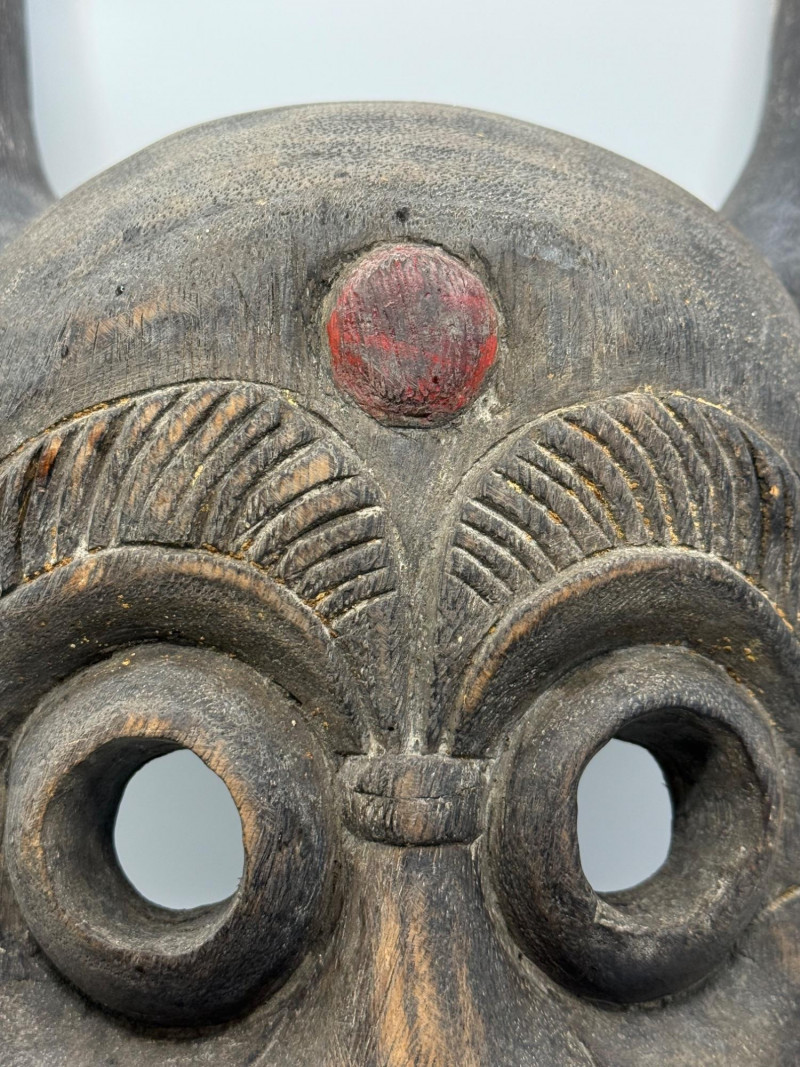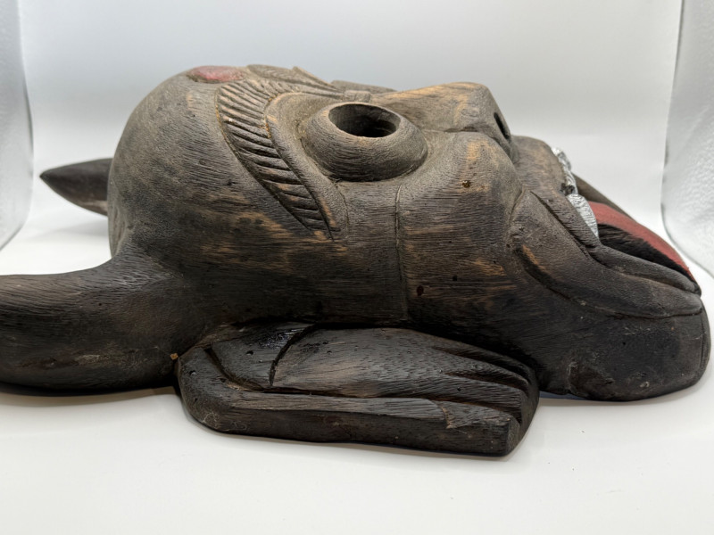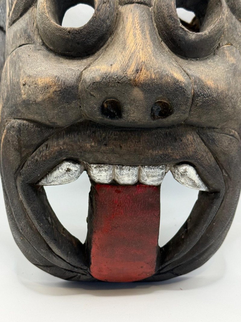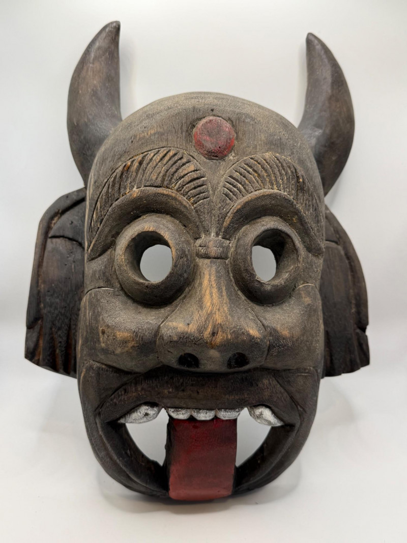 A hand‑carved wooden mask featuring a horned, mythical or demon‑like face. This style is commonly associated with folk‑art traditions, festival masks, and theatrical storytelling pieces. Materials & Construction Solid carved wood with dark stained finish Two carved horns at the top Large round eye openings Broad carved nose Open mouth with white painted teeth and a red protruding tongue Red circular mark on the forehead Incised texture lines above the eyes for expressive detail