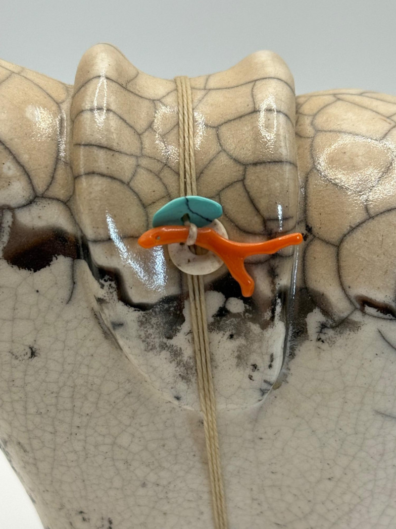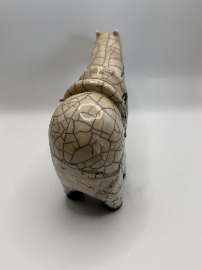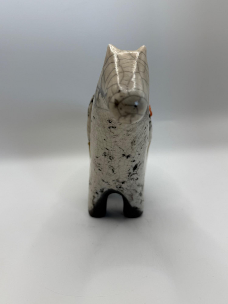 A handmade ceramic sculpture of a stylized horse with a small, colorful rider figure on its back. The form is whimsical and modern, with simplified shapes and playful proportions. Materials & Finish High‑fire ceramic Glossy crackle‑glaze surface in white and gray tones Turquoise and coral accent Four short, sturdy legs and an abstracted body shape Design Notes Contemporary folk‑art or studio‑art style Crackle glaze adds texture and visual depth Decorative tabletop sculpture suitable for display in many settings