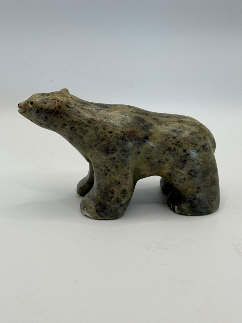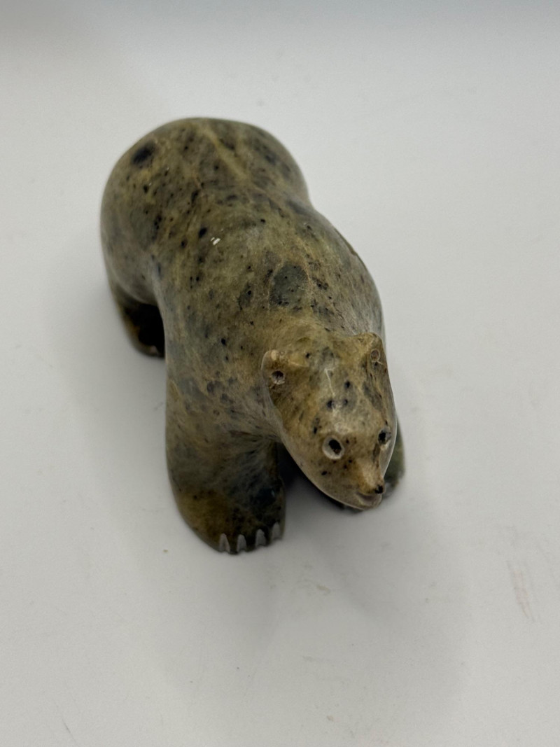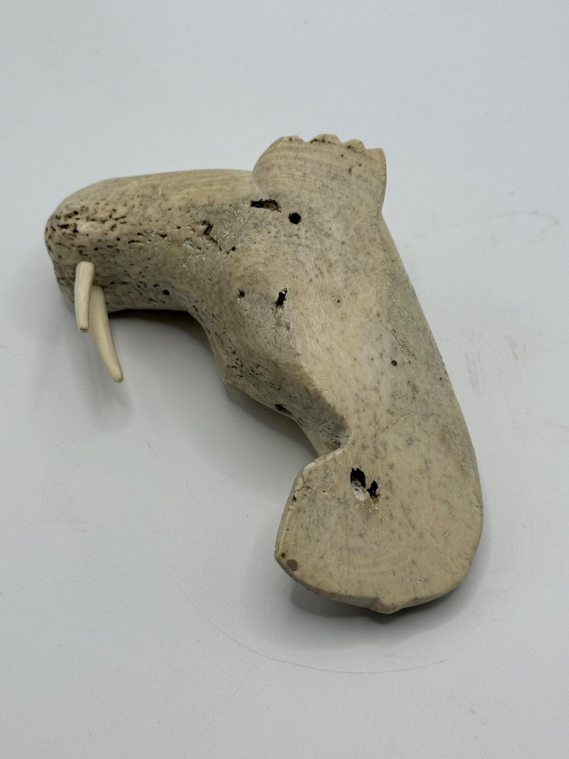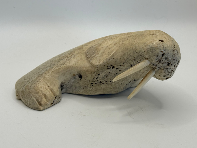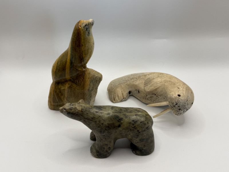 Includes one carved bone walrus and two carved stone figures: a seal and a polar bear. The walrus is hand‑carved from bone with shaped tusks and a smooth, polished finish. The seal is carved from dark stone in an upright pose with rounded contours. The polar bear is carved from light stone in a simplified standing form. All pieces show hand‑worked surfaces and are in a contemporary Arctic‑inspired folk‑art style.