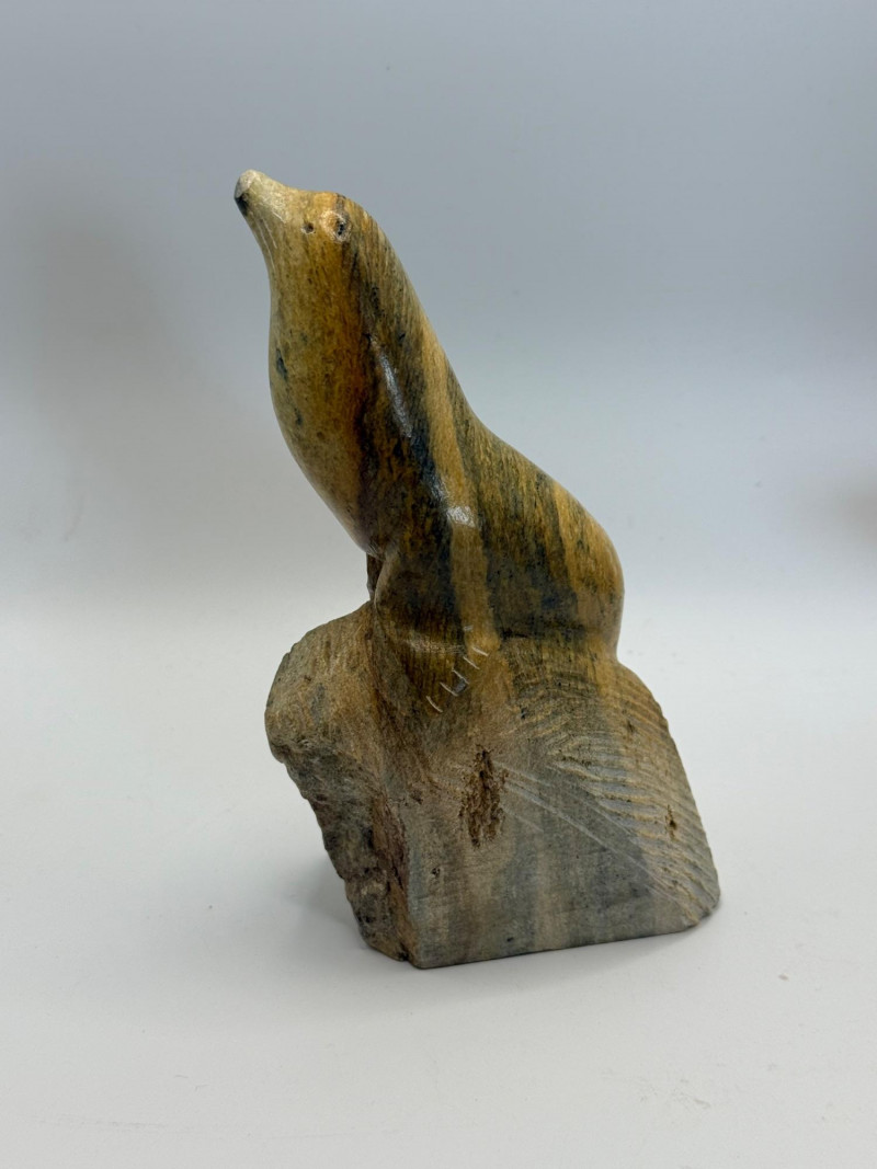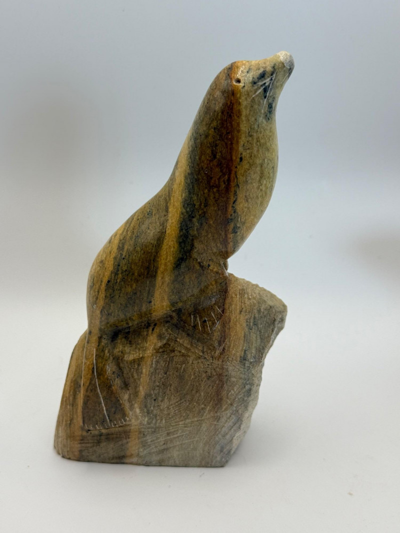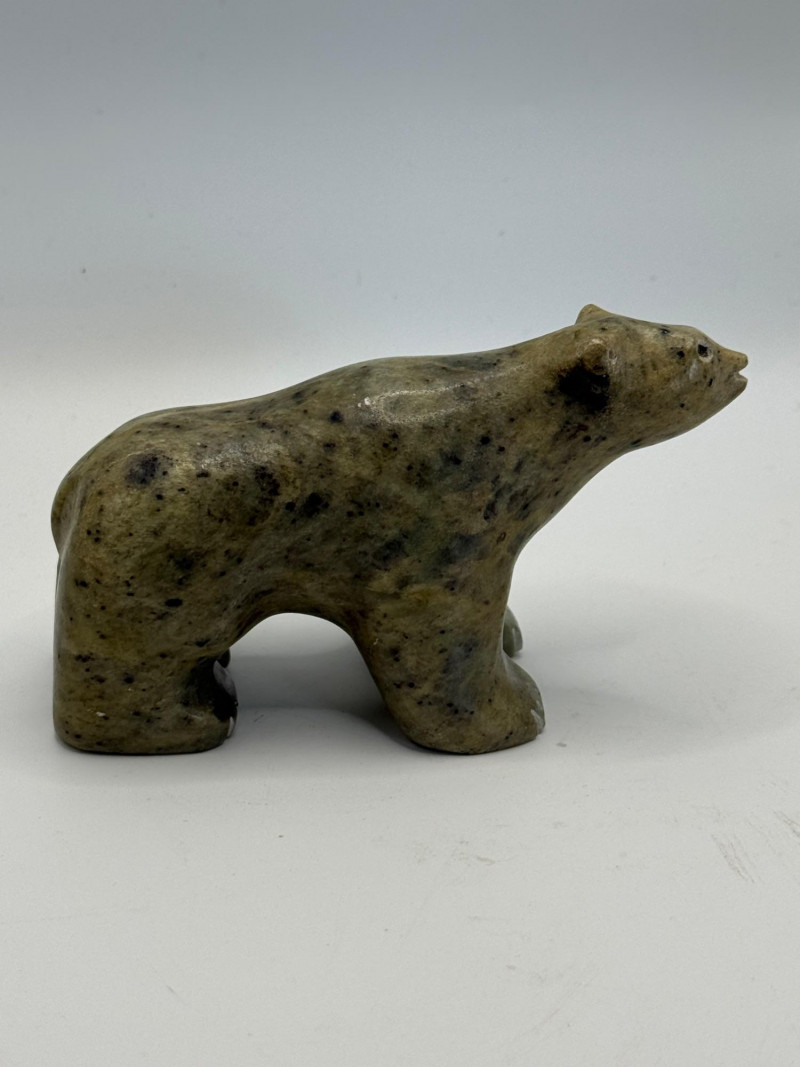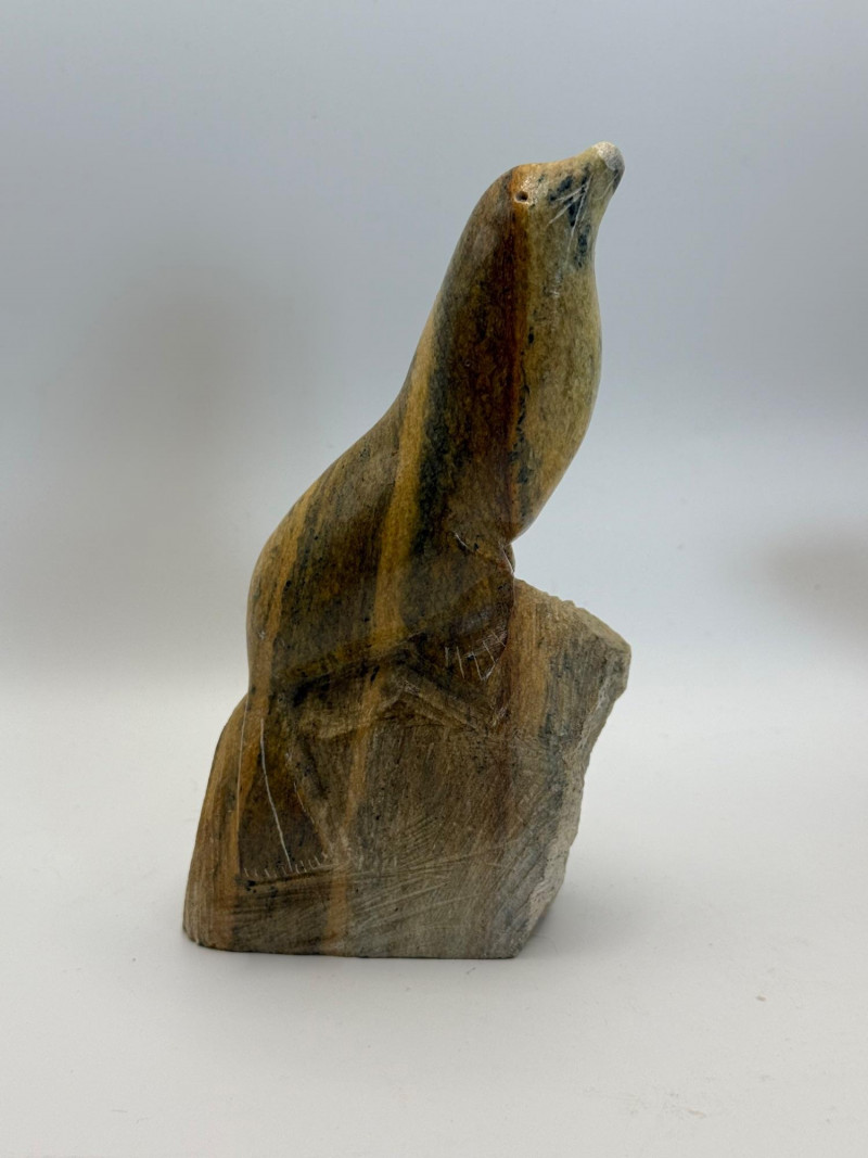 Includes one carved bone walrus and two carved stone figures: a seal and a polar bear. The walrus is hand‑carved from bone with shaped tusks and a smooth, polished finish. The seal is carved from dark stone in an upright pose with rounded contours. The polar bear is carved from light stone in a simplified standing form. All pieces show hand‑worked surfaces and are in a contemporary Arctic‑inspired folk‑art style.