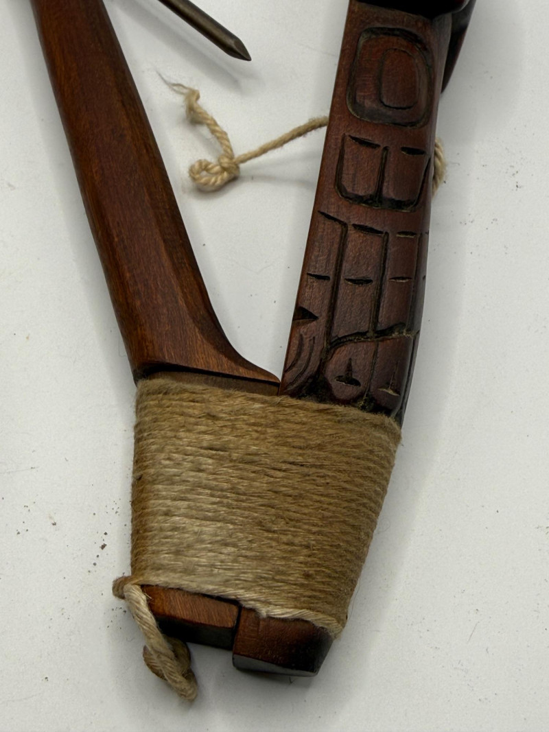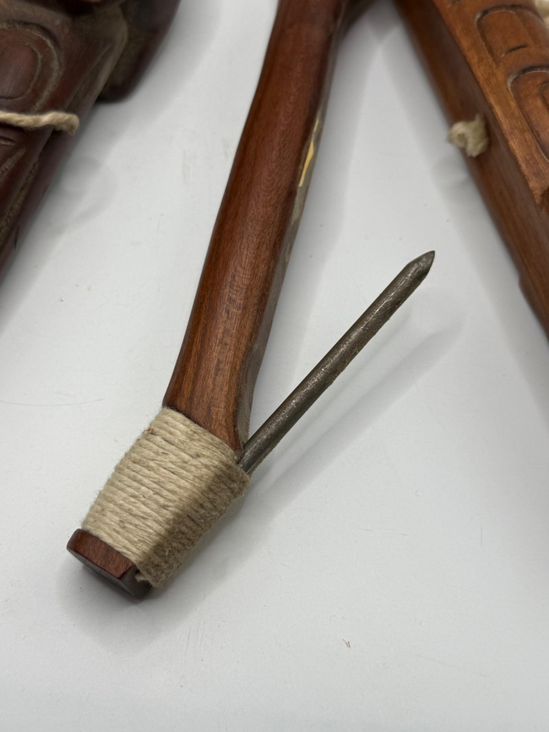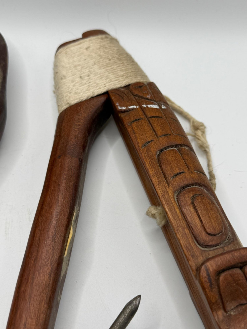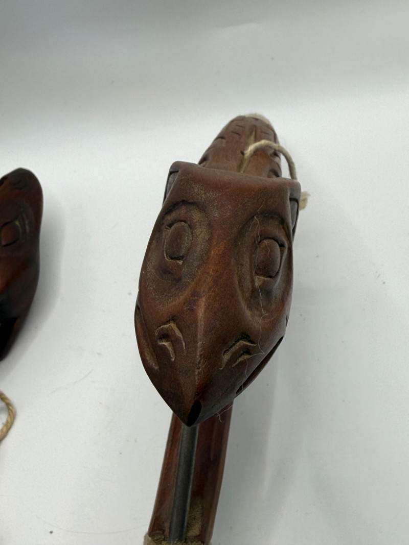 Two hand‑carved wooden objects featuring V‑shaped frames, stylized faces, and wrapped cord handles. Each piece has a metal spike extending from one end. The carvings show a folk‑art or tribal‑inspired aesthetic, with symmetrical facial motifs and decorative linework.
