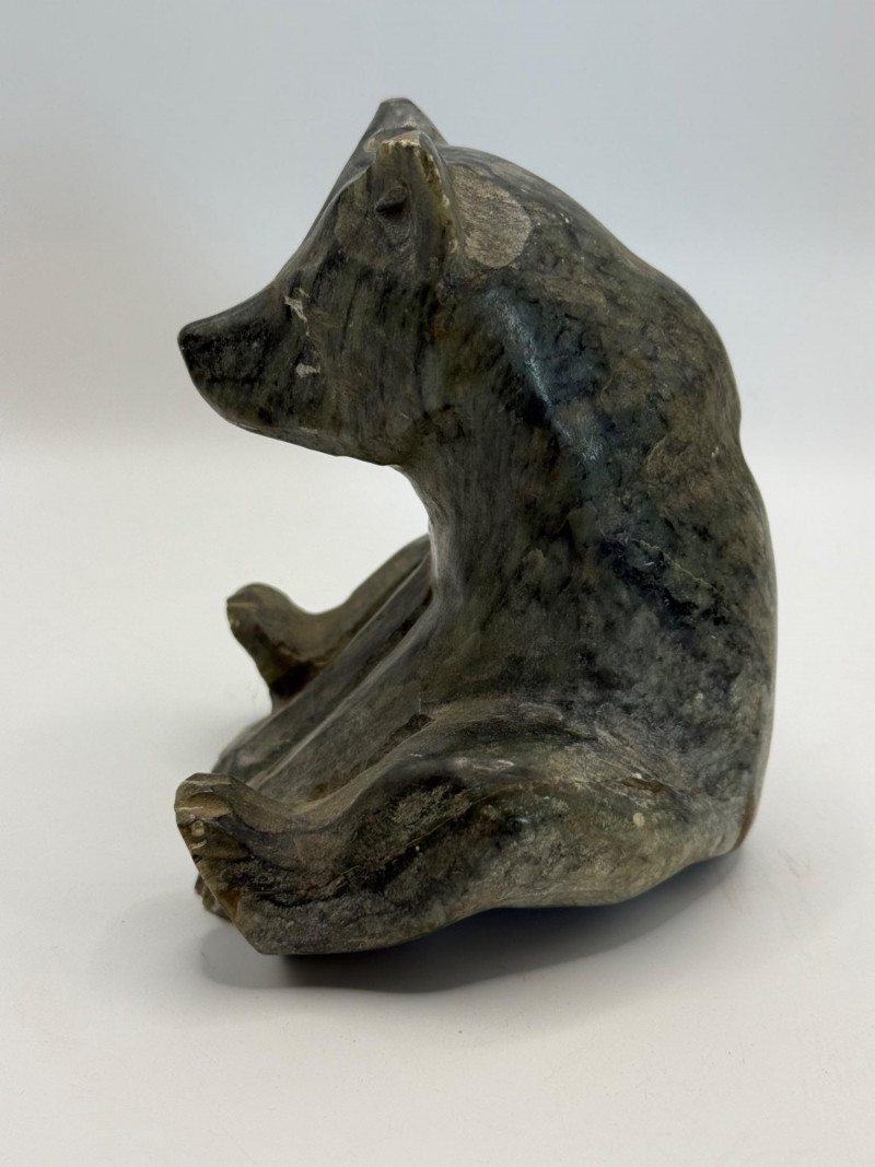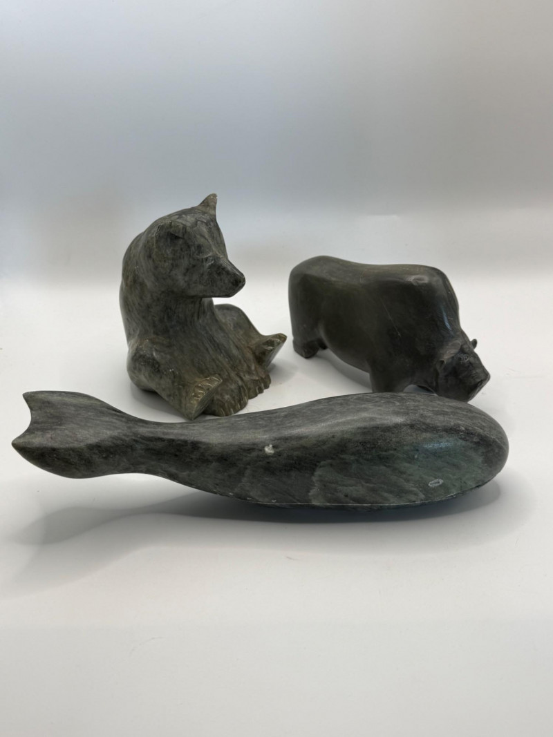 Group of three carved soapstone animals including a sitting bear, a musk‑ox style figure, and a whale. All are carved from grey‑green stone with smooth, rounded shapes. Contemporary decorative pieces with minimal detailing.