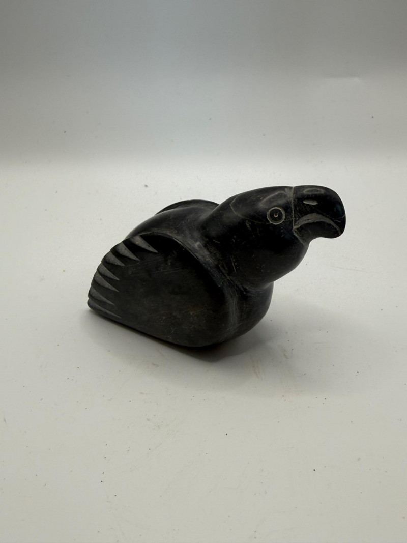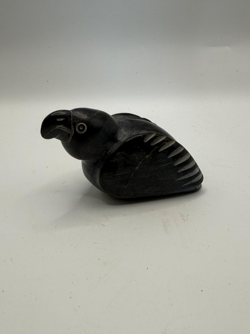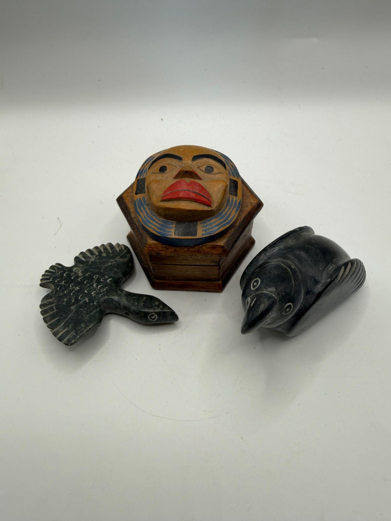 Group includes a small wooden box with a carved and painted face on the lid, along with two carved stone bird figures. The box shows hand‑painted details in red, black, and blue. The birds are carved from dark stone, one with outstretched wings and one with wings folded. All pieces are handmade decorative carvings.