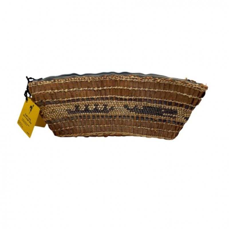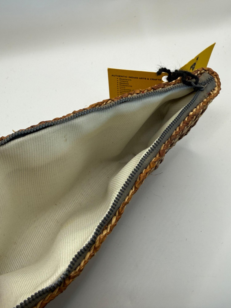 Hand‑woven cedar natural‑fiber pouch with a zippered top. Features horizontal bands in light and dark tones with a central diamond pattern. Made by textile artist Anita Durham and finished with a small tag at the zipper pull.