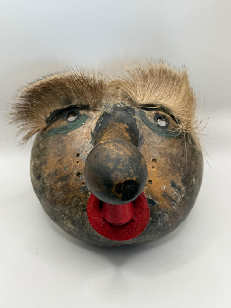 Hand‑carved gourd mask with exaggerated facial features, including a large round nose, painted eyes, fur eyebrows, and an open red mouth with a protruding tongue. Rustic surface with visible hand‑worked texture. Folk‑art style piece likely made for decorative or cultural display.