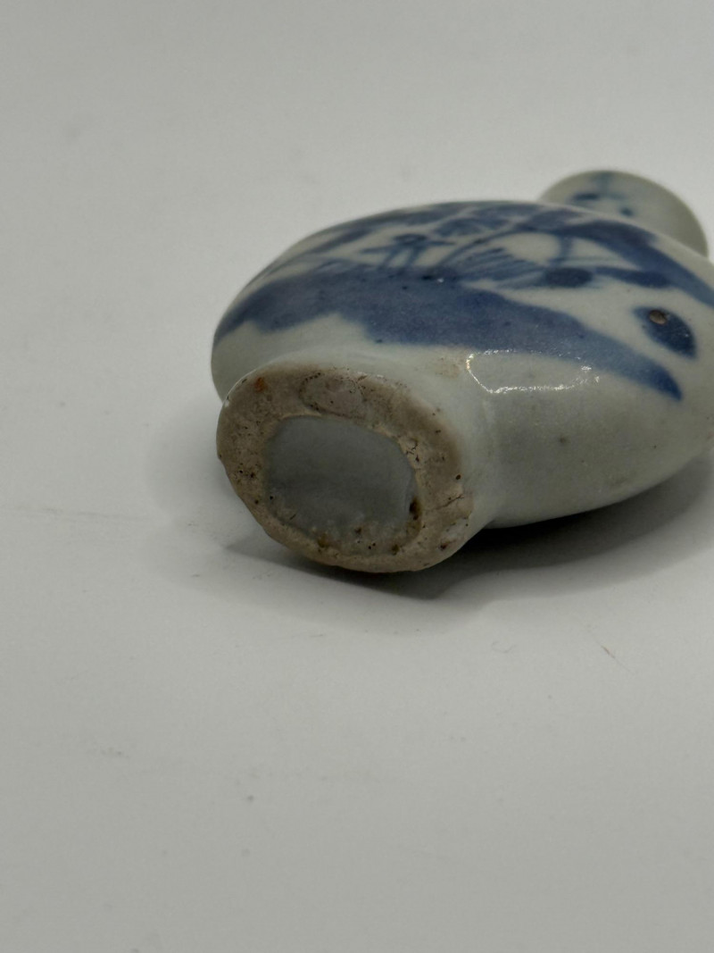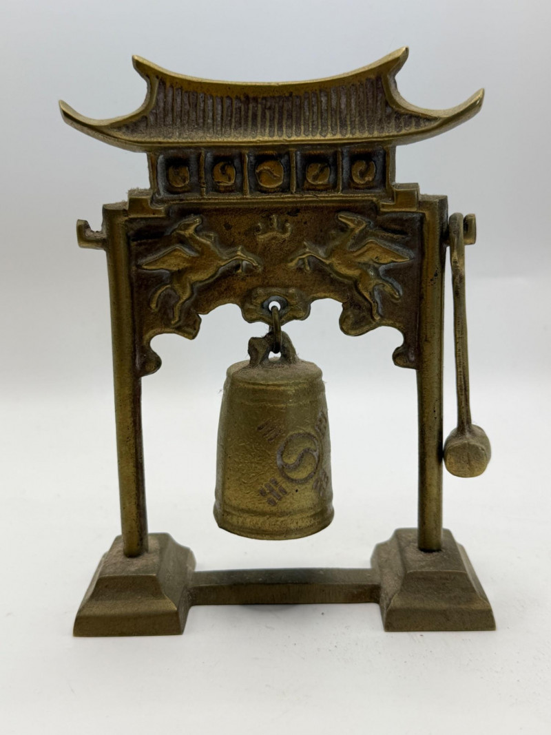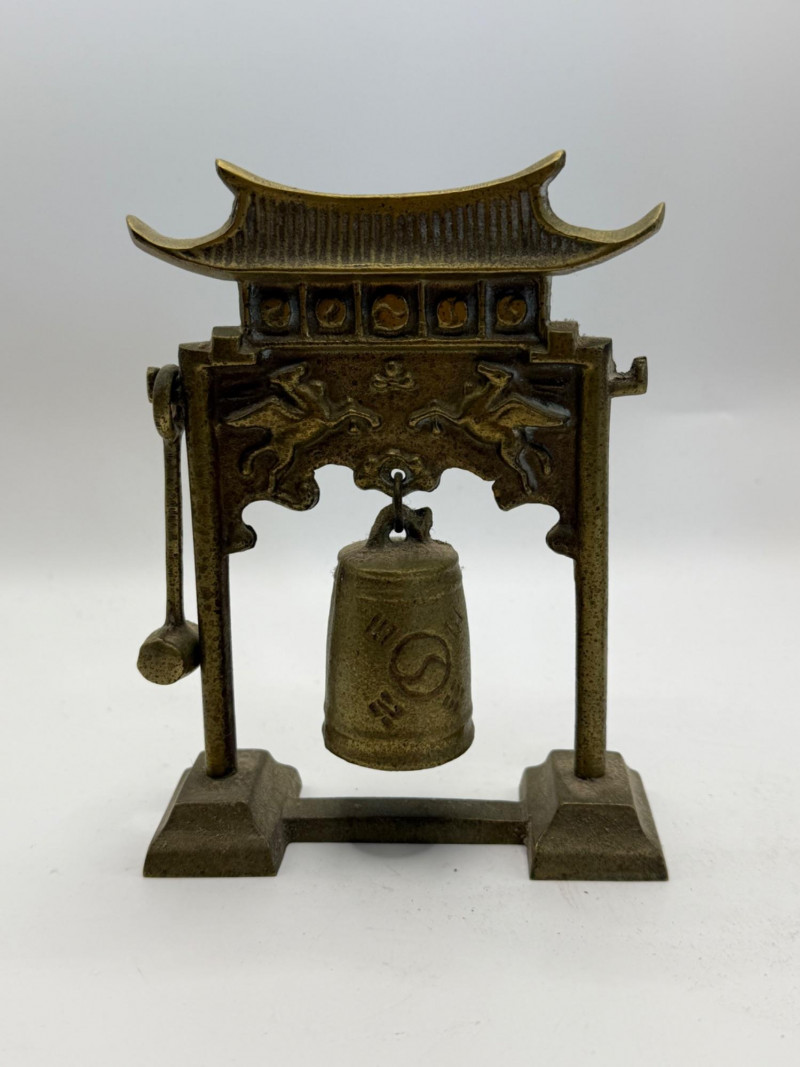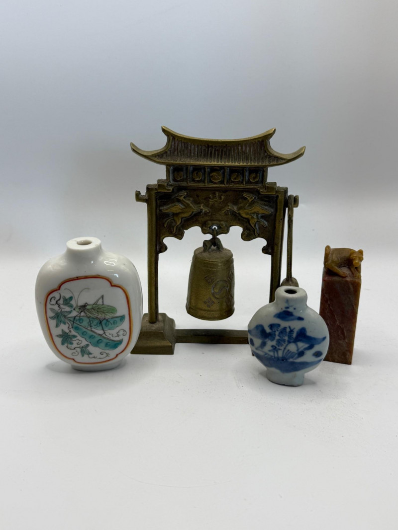 Group includes a small brass pagoda‑style bell shrine with hanging bell, a white snuff bottle with green pod design, a blue‑and‑white snuff bottle with floral pattern, and a carved stone seal topped with a small animal figure. All pieces are small decorative items in mixed materials. Snuff bottles are missing tops.
