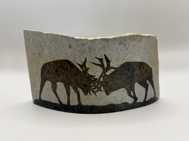 Carved stone piece featuring two deer or elk locked in antlers, cut through the surface to create a dark silhouette against the lighter stone. Natural curved rock form with a smooth front and rough edges. Handmade wildlife carving signed or attributed to Hughes.