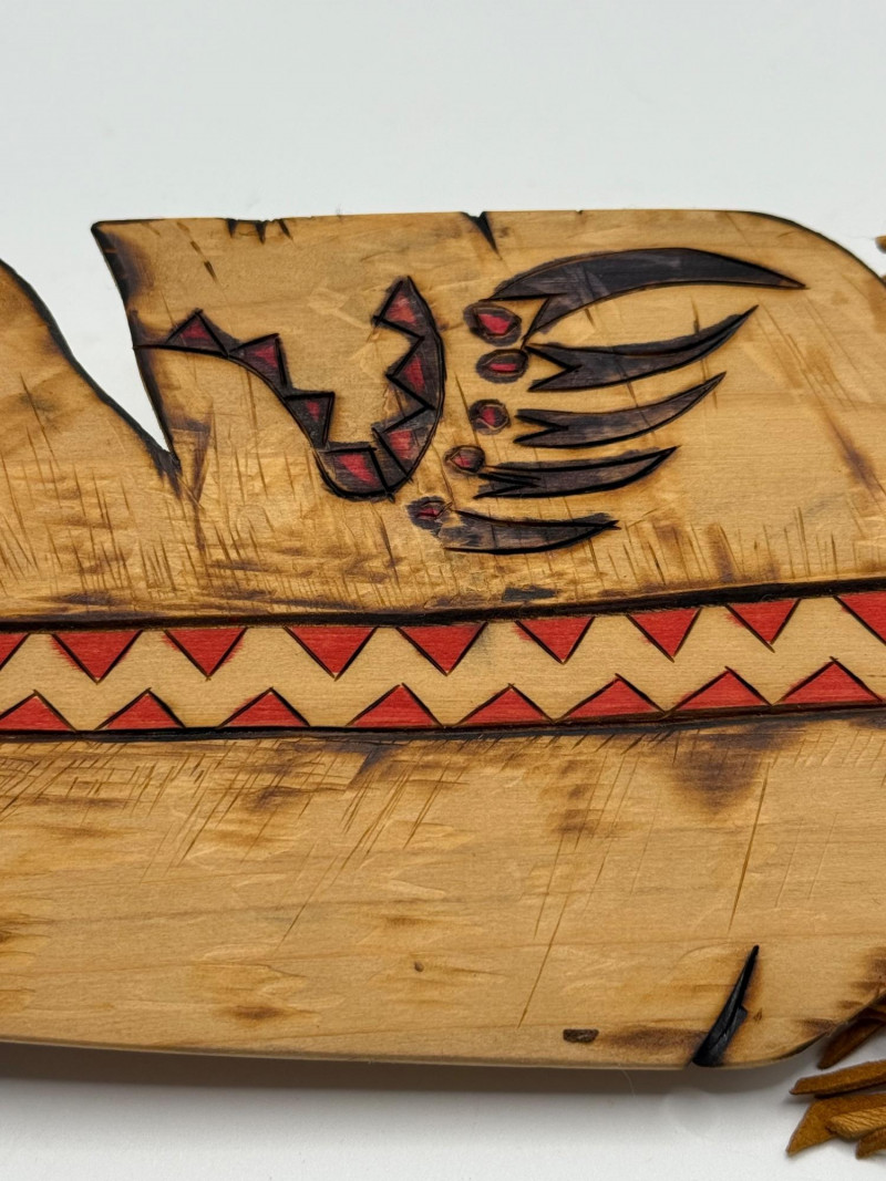 Hand‑carved wooden feather with etched and painted designs, including a red‑and‑white zigzag center pattern and a stylized animal motif near the base. The top is wrapped with tan leather ties and a small bead. Signed or attributed to artist Linda Silvas. Decorative handmade piece with a natural rustic finish.