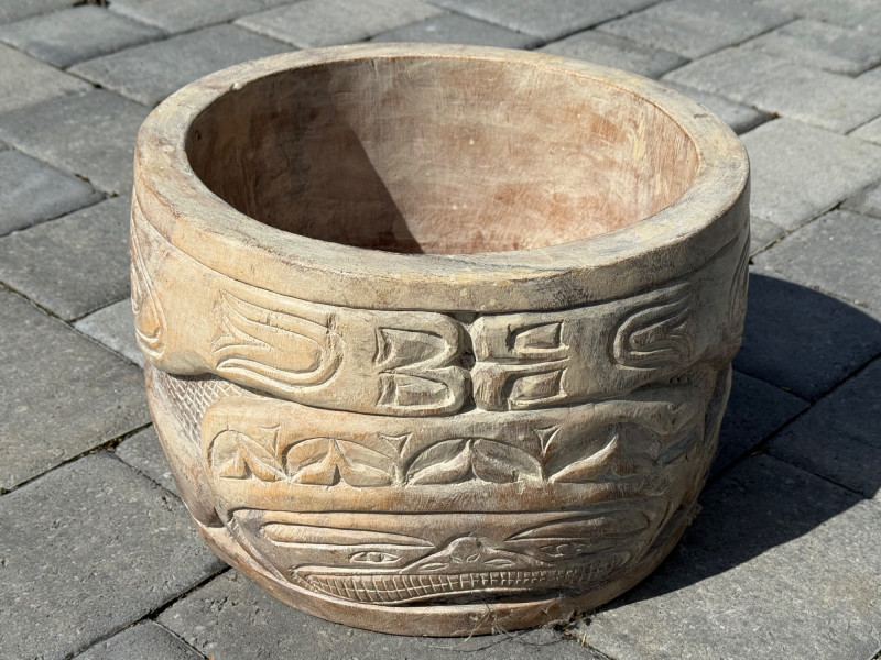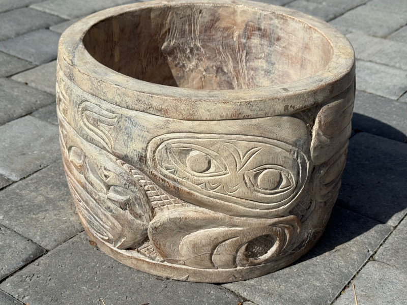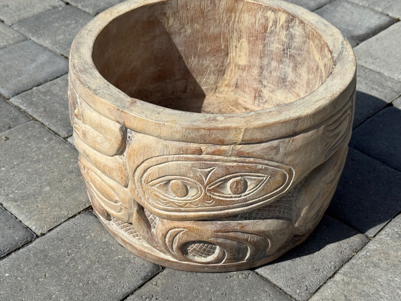 Hand‑carved wooden bowl featuring stylized human and animal forms in a Northwest Coast–inspired design. Deep relief carving with prominent eyes, faces, and flowing shapes. Natural wood finish with visible tool marks and traditional formline‑style motifs. Decorative handmade piece.