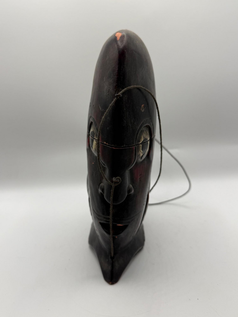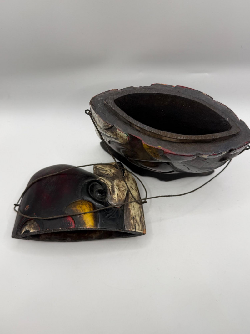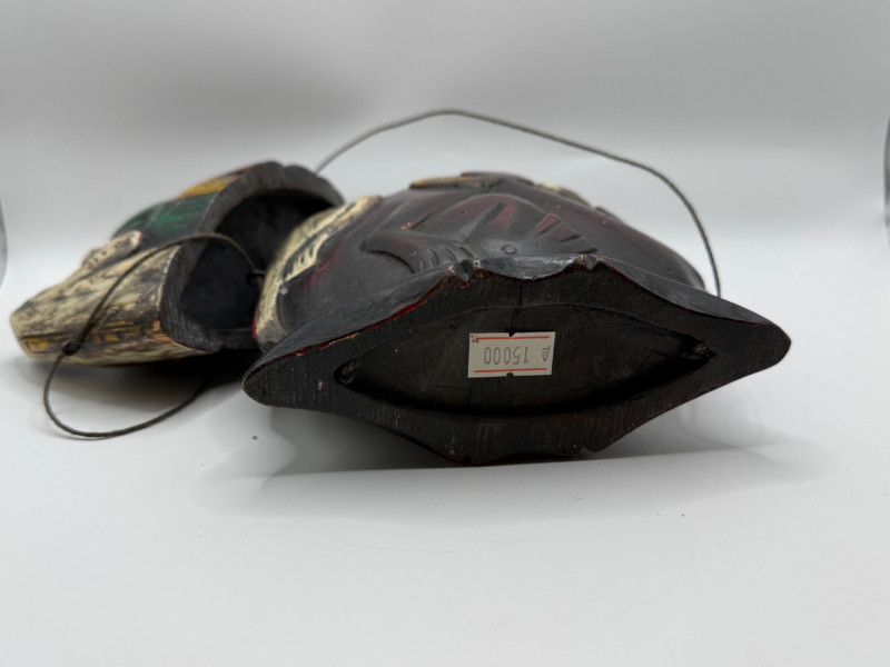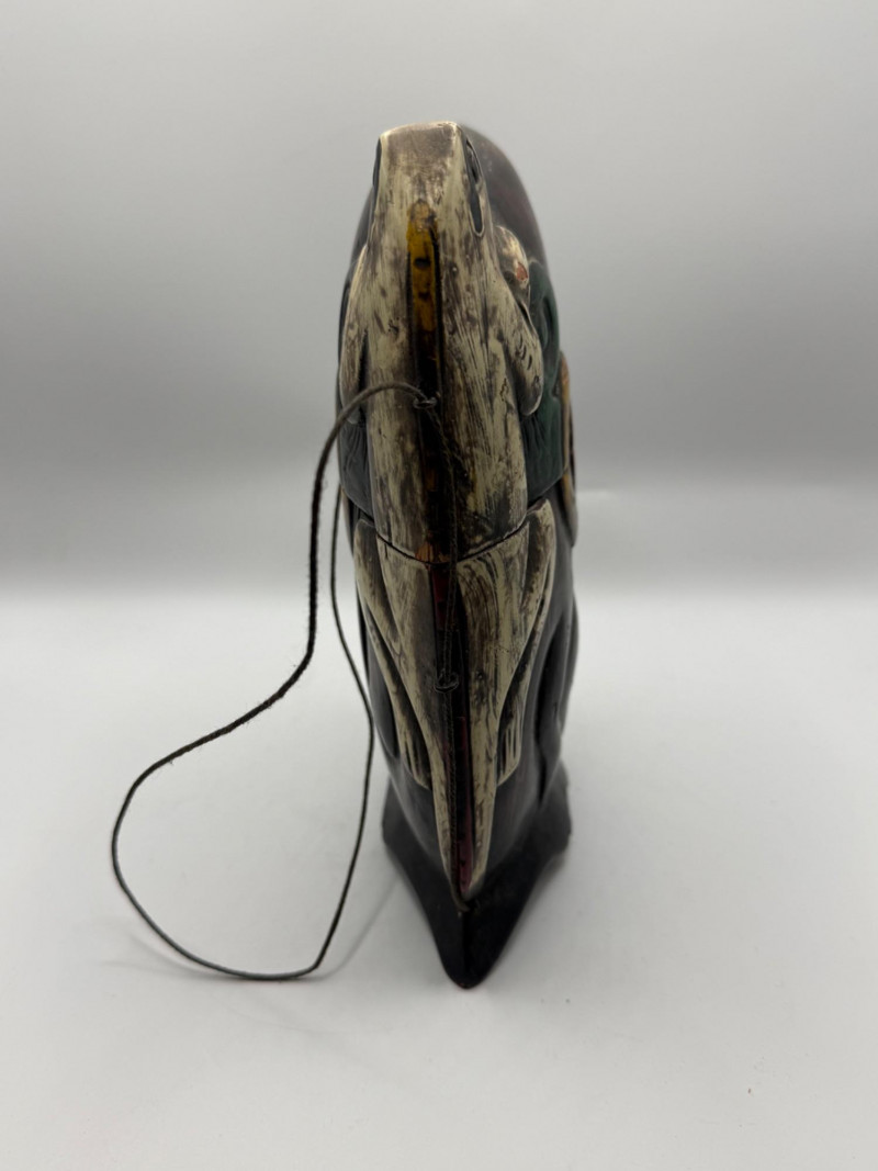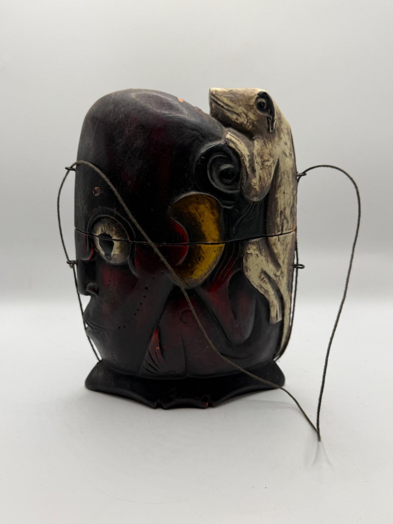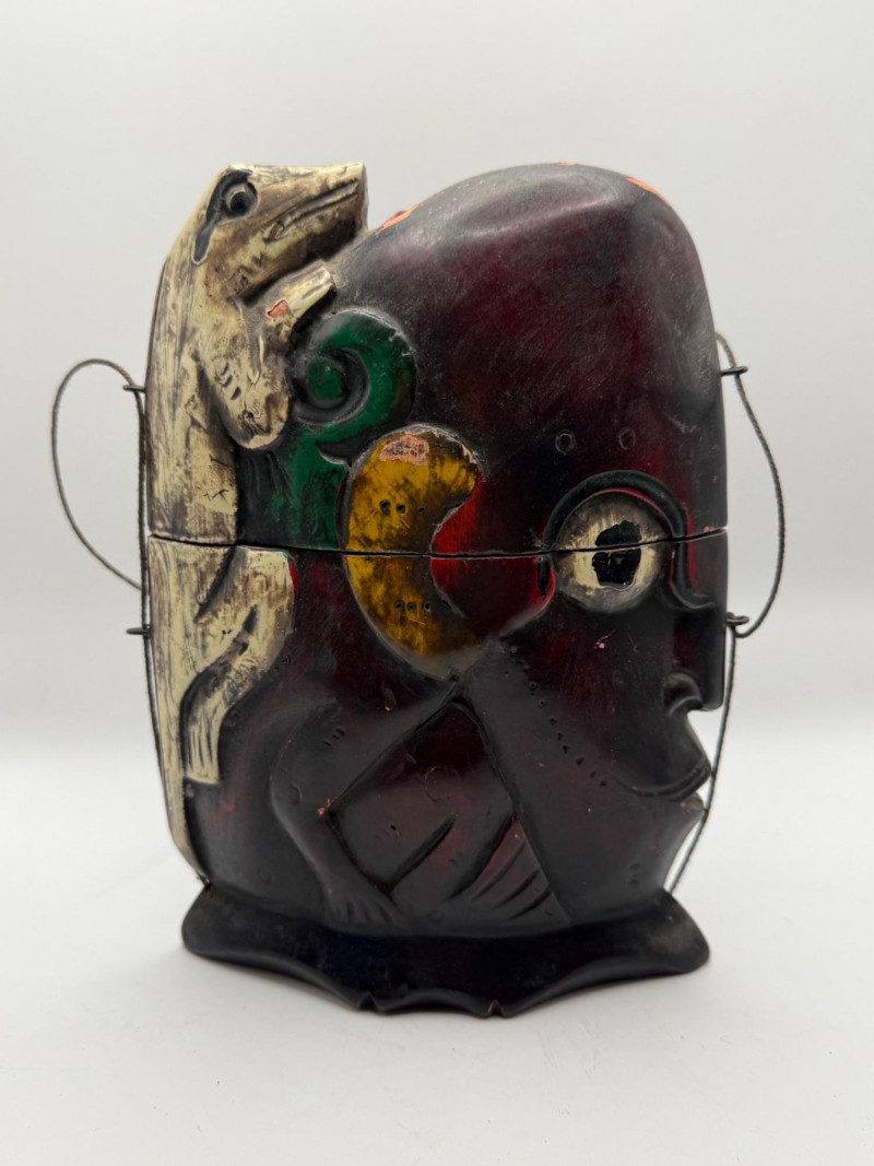 Hand‑carved wooden piece shaped like a stylized face with bold painted details in red‑brown, green, and yellow. Features a carved lizard figure climbing across the surface. Includes thin wire handles and a small curved base. Decorative folk‑art style carving with expressive form and color.