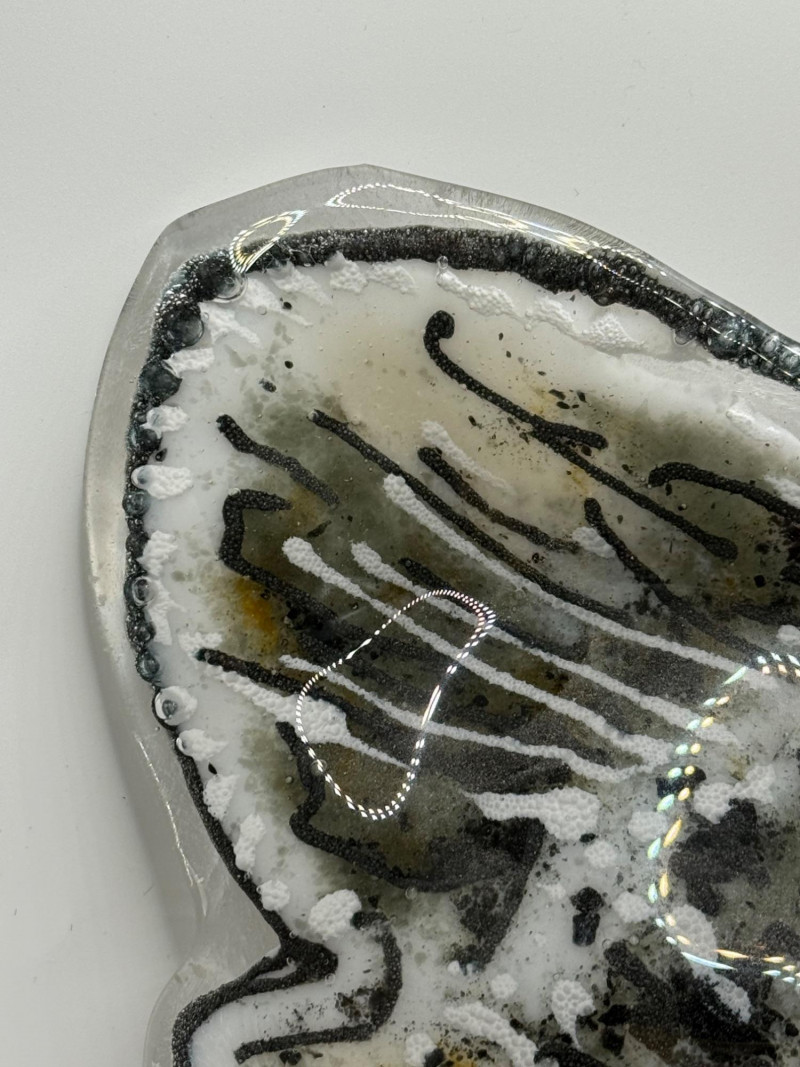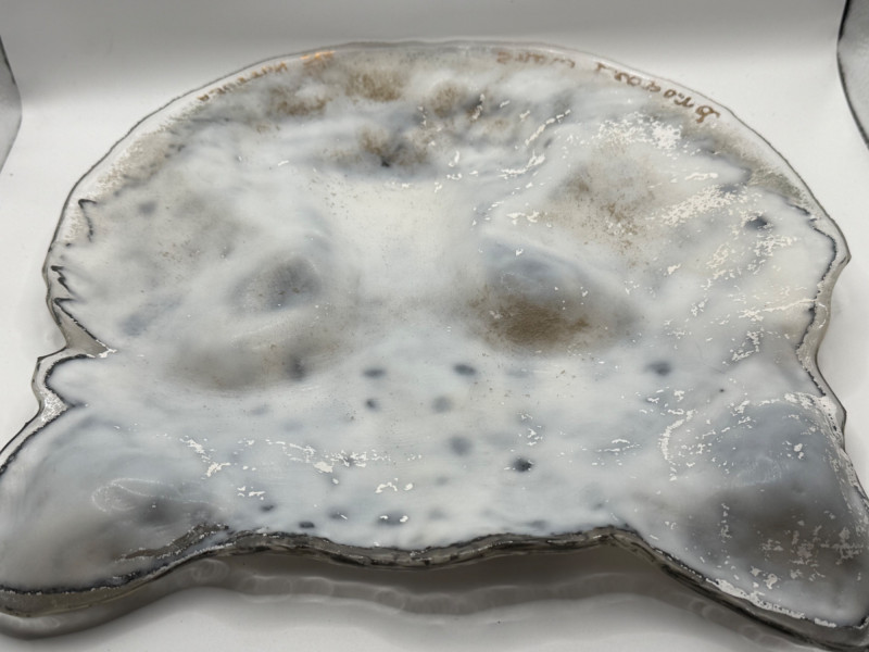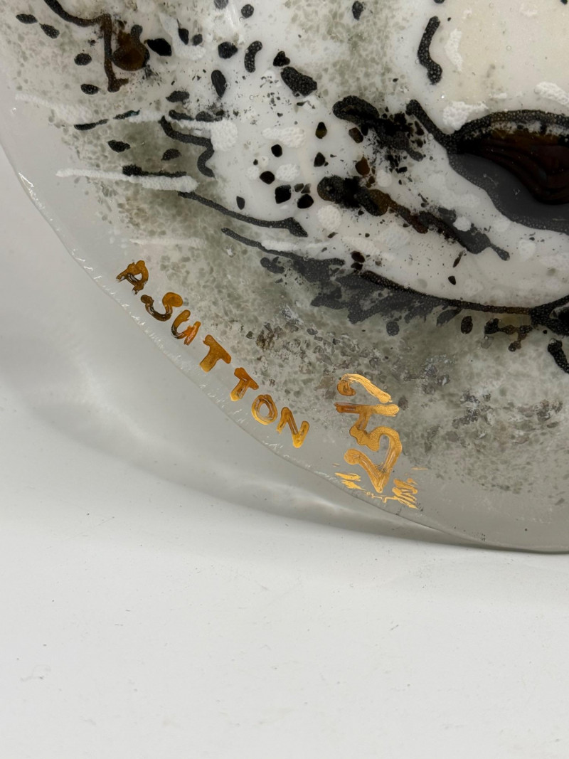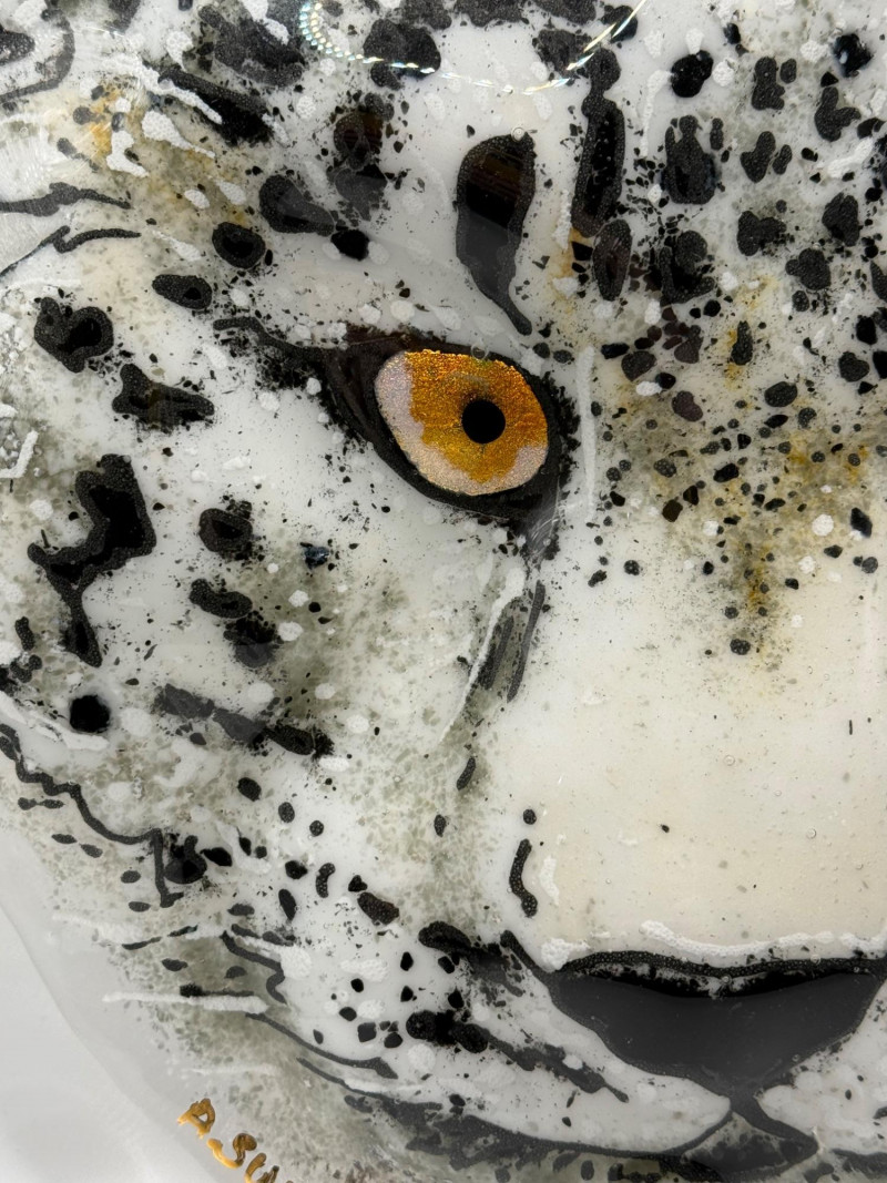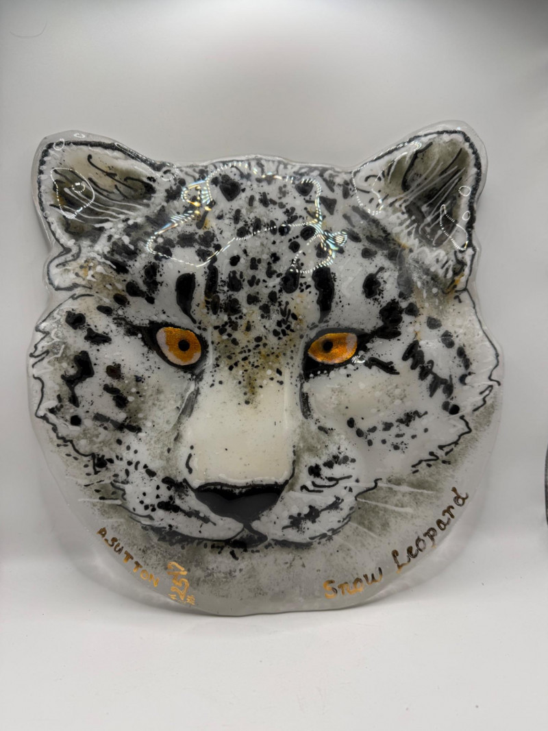 Decorative glass artwork featuring a detailed snow leopard face with black and gray markings and vivid yellow‑orange eyes. Signed A. Sutton and titled Snow Leopard. Textured and hand‑painted surface gives the piece a lifelike, expressive look. Suitable for display as wall or shelf art.
