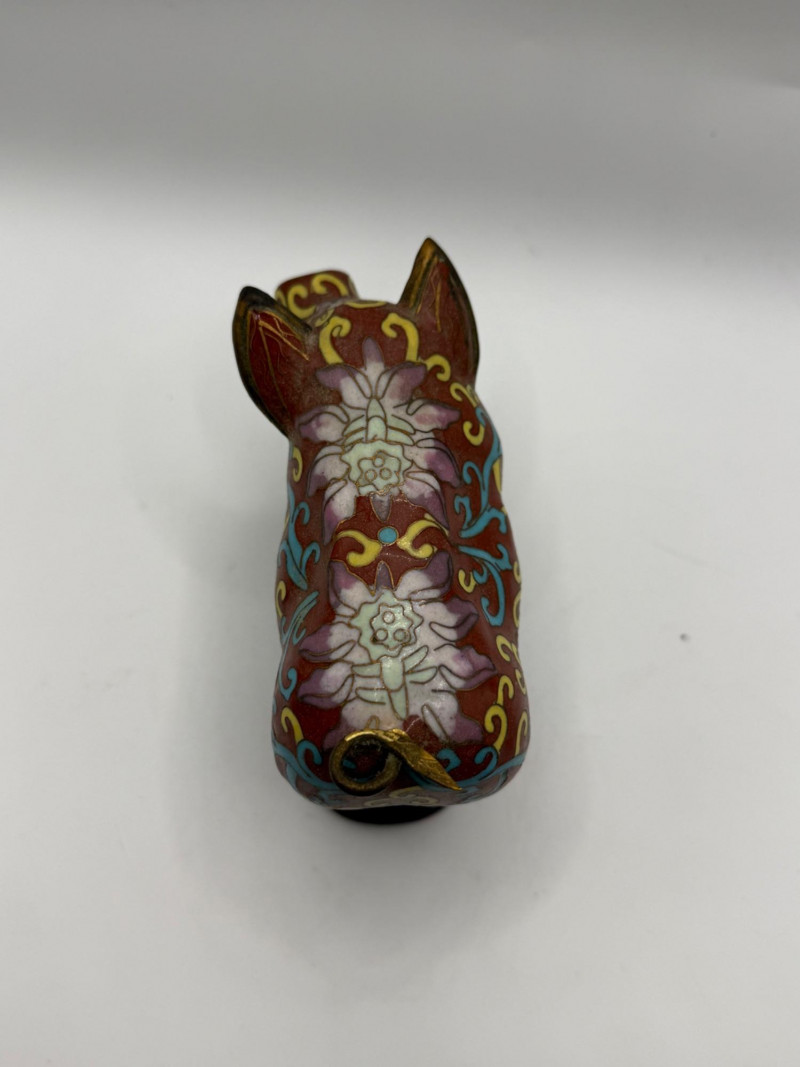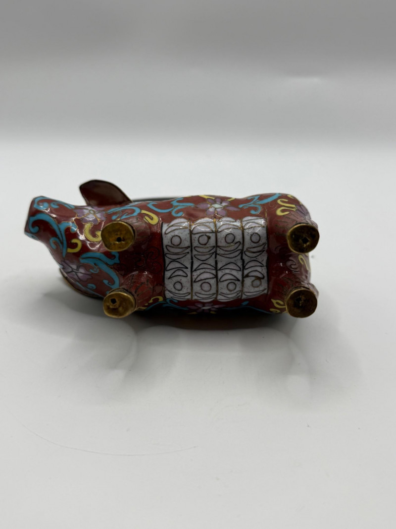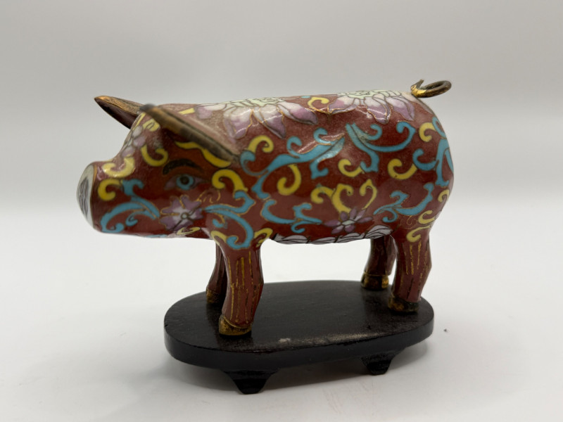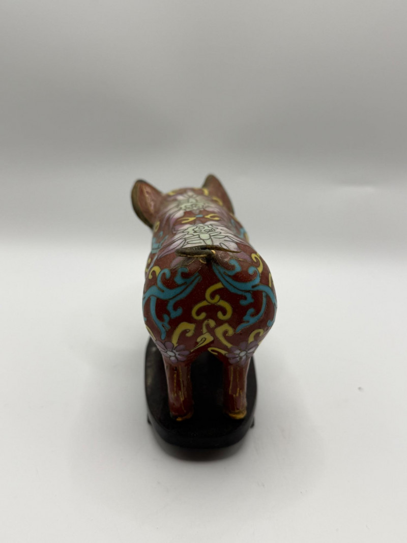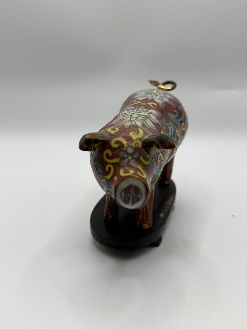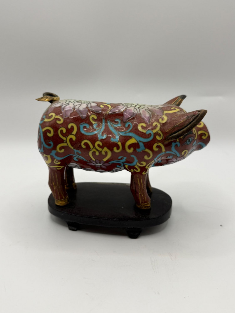 Small pig sculpture on a black base, covered in intricate multicolor designs in yellow, blue, and purple over a reddish‑brown ground. Features fine detailing including pointed ears and curled tail.
