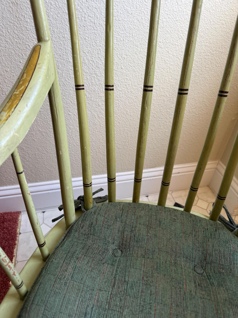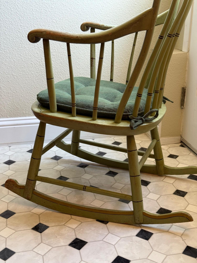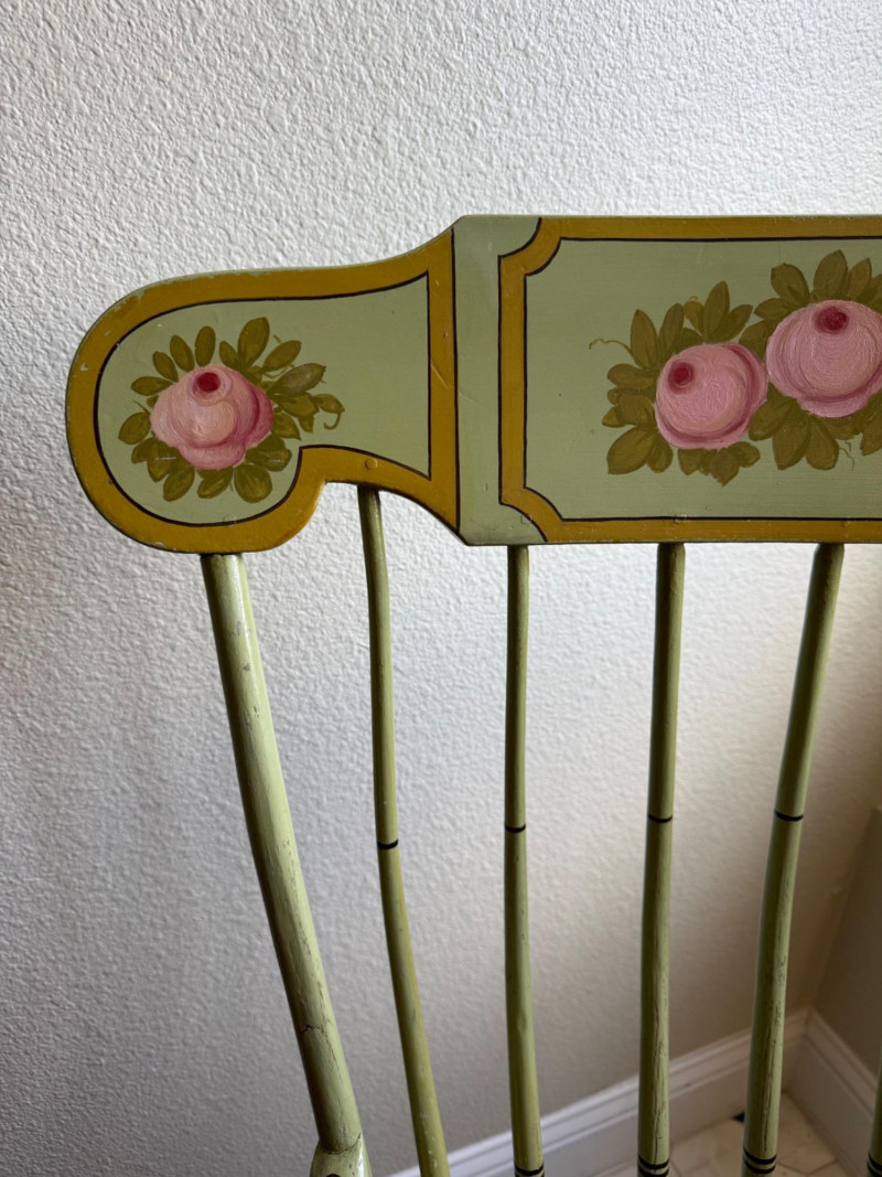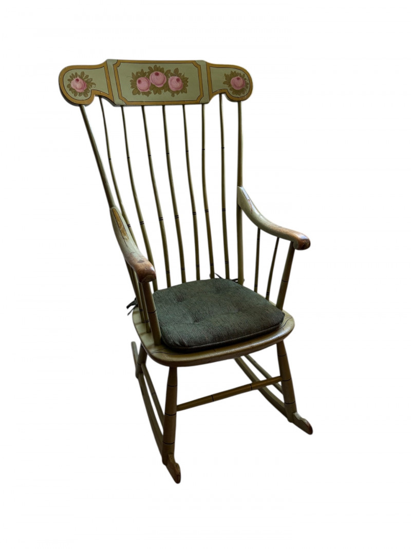 A charming antique rocking chair dating to the late 19th or early 20th century, executed in the American Colonial Revival taste. The chair features a gracefully shaped crest rail adorned with hand-painted floral decoration, set against a soft sage green ground with painted banding along the turned spindles. Its light yet sturdy construction, bamboo-style turnings, and classic rocker form reflect the period’s reinterpretation of early American furniture traditions. Retaining original surface wear and patina, the piece offers both decorative charm and authentic age. Overall height 44" x 25" wide. Seat height 17" x 14" wide.