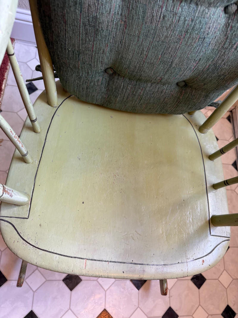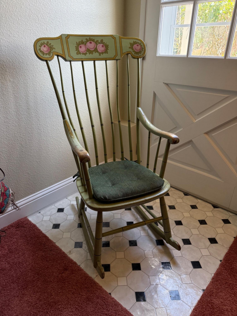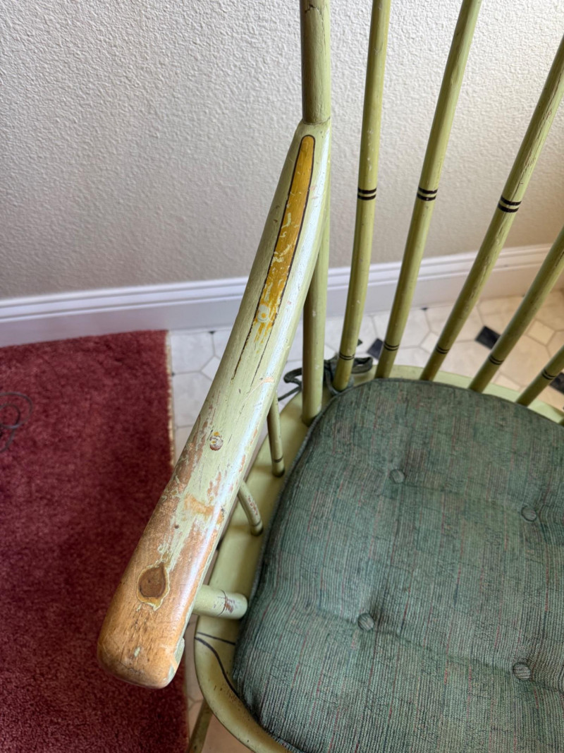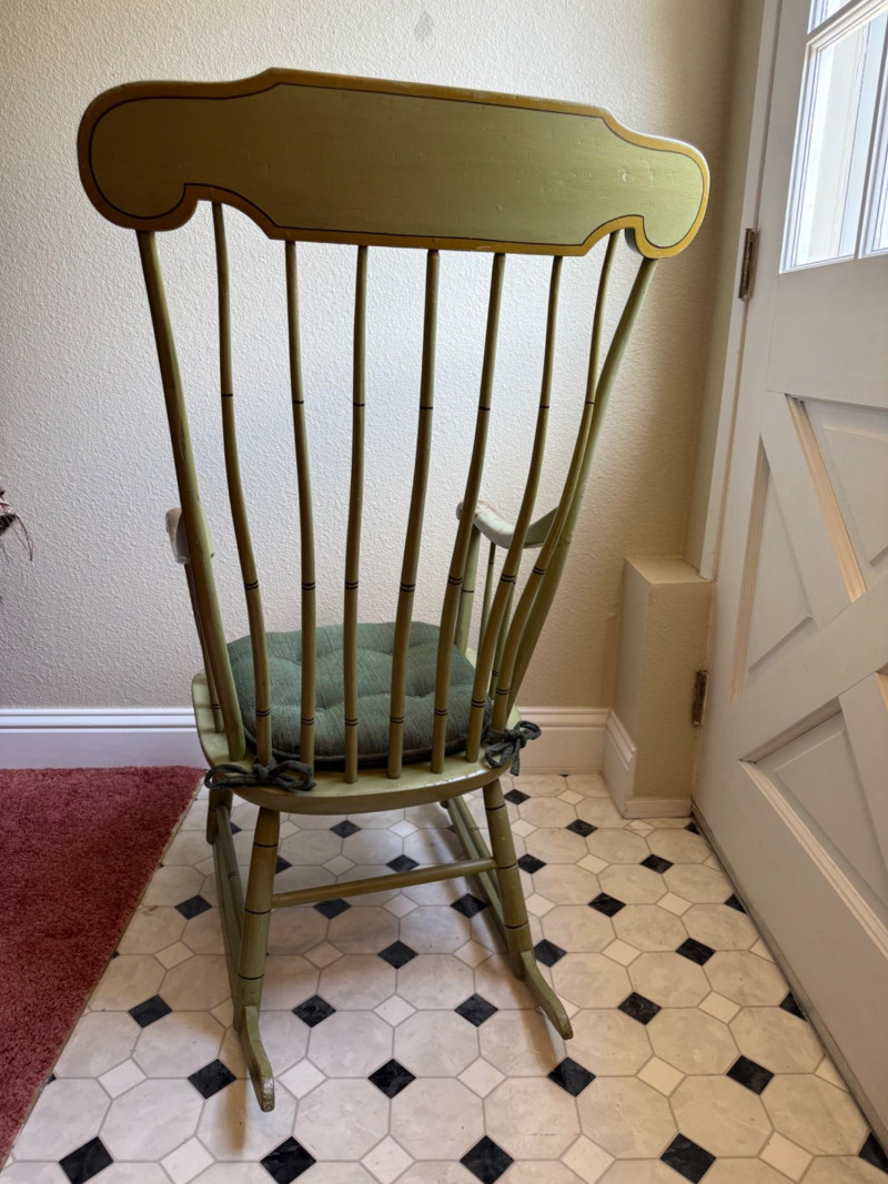 A charming antique rocking chair dating to the late 19th or early 20th century, executed in the American Colonial Revival taste. The chair features a gracefully shaped crest rail adorned with hand-painted floral decoration, set against a soft sage green ground with painted banding along the turned spindles. Its light yet sturdy construction, bamboo-style turnings, and classic rocker form reflect the period’s reinterpretation of early American furniture traditions. Retaining original surface wear and patina, the piece offers both decorative charm and authentic age. Overall height 44" x 25" wide. Seat height 17" x 14" wide.
