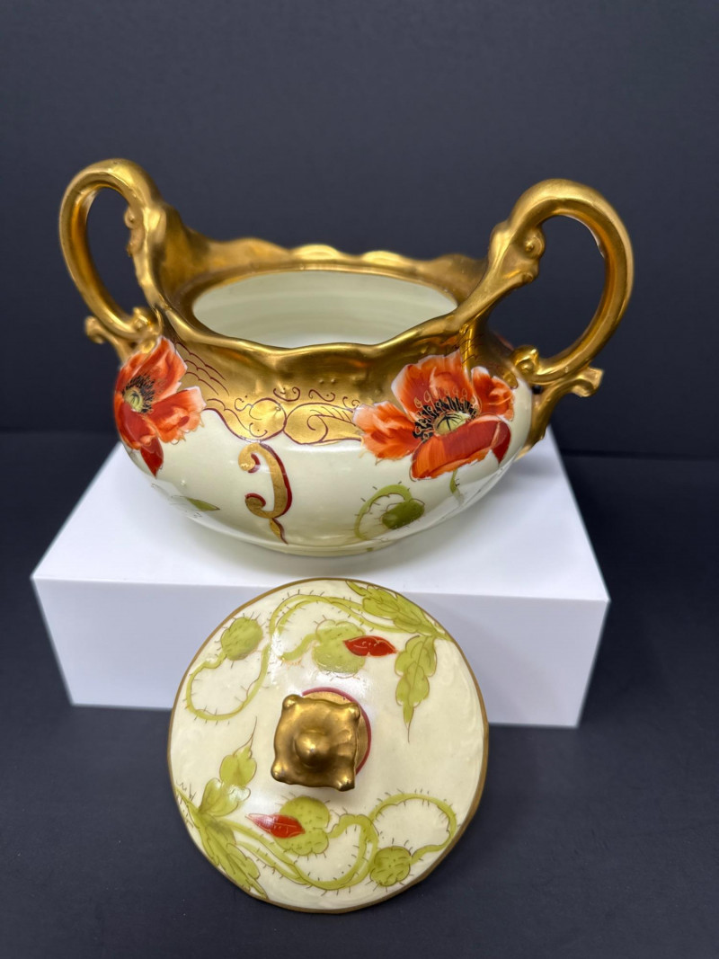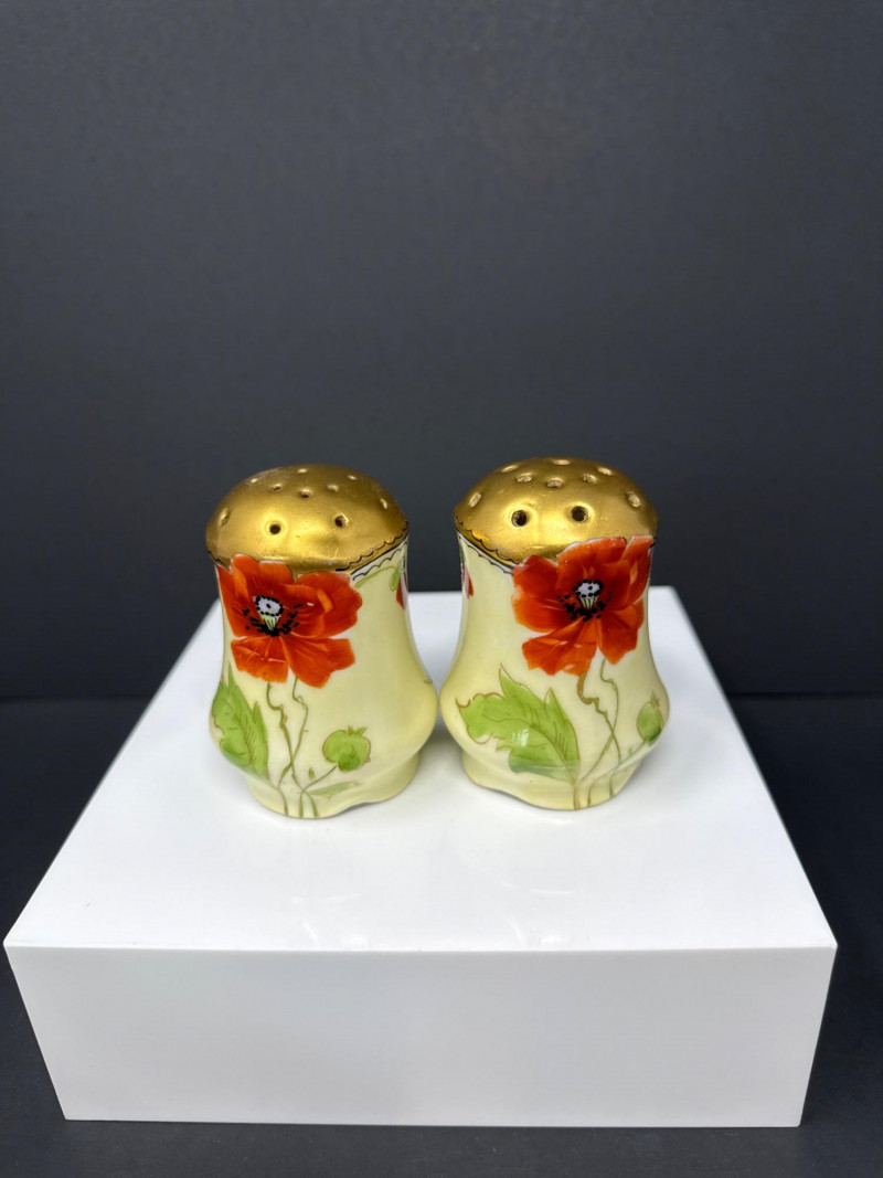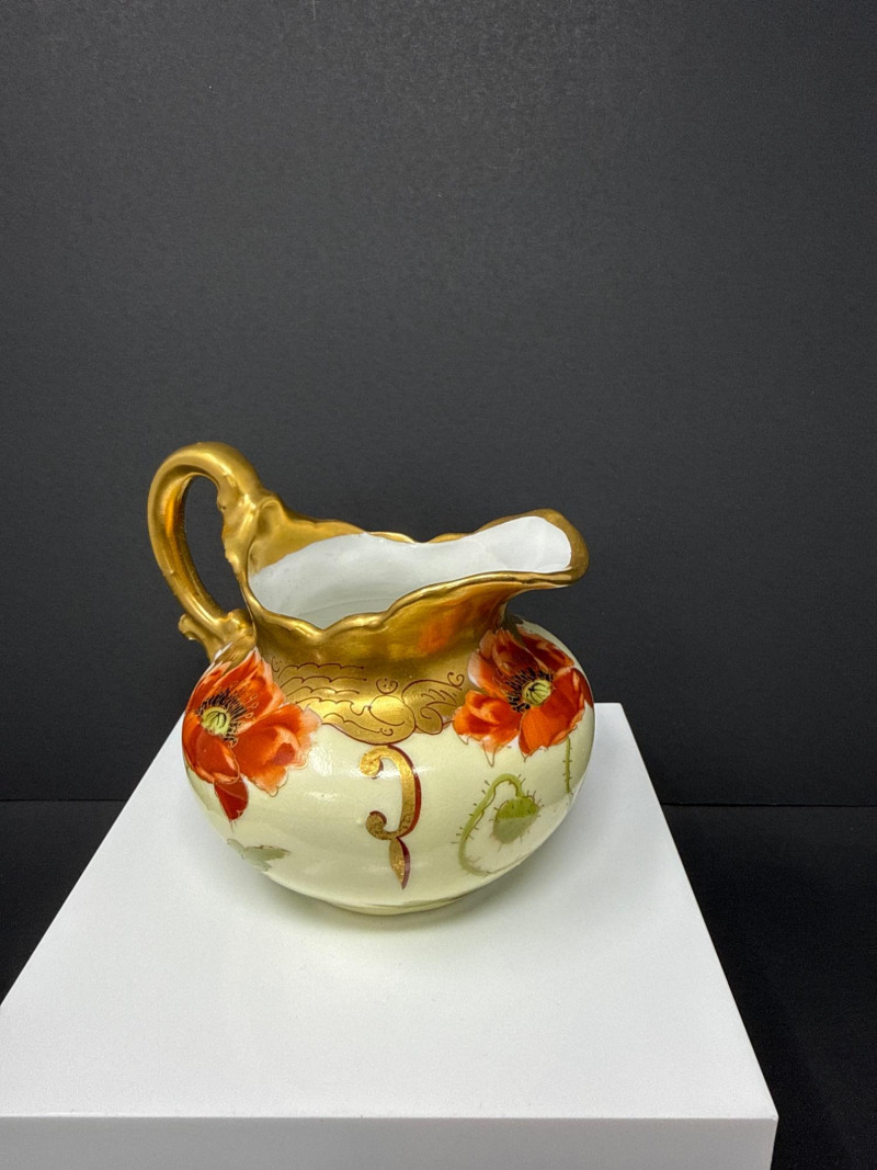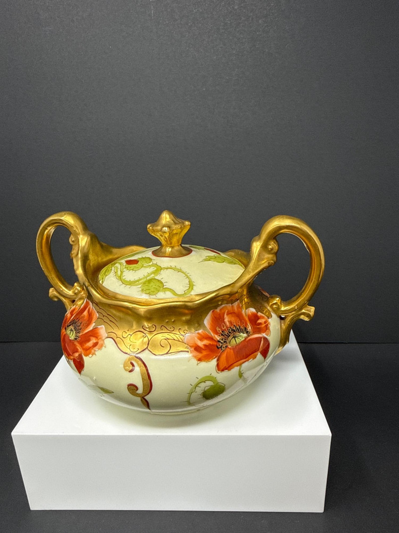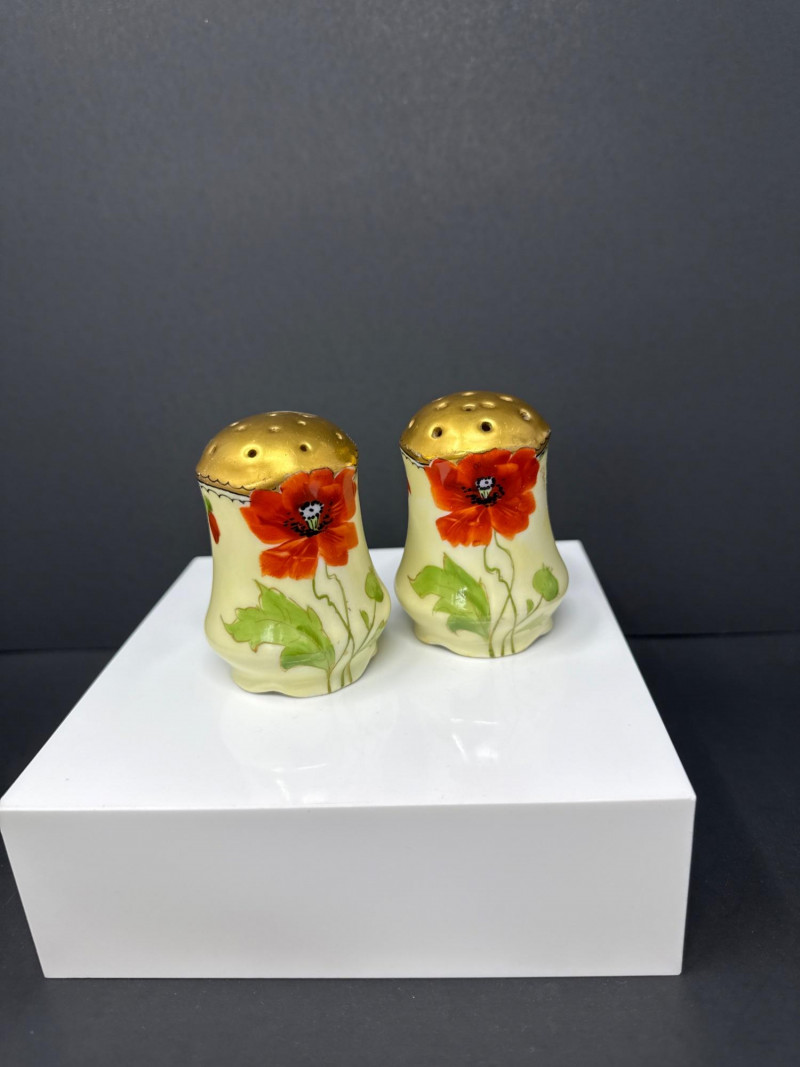 A beautifully coordinated Weimar Germany porcelain set featuring a lidded sugar bowl, creamer, and matching salt and pepper shakers. Each piece is hand‑painted with vivid red poppies and soft green foliage, accented by rich gilt detailing along the rims, handles, and shaker tops. The sugar bowl and creamer display elegant scalloped edges and ornate gold handles, while the shakers echo the same floral motif with domed gilt tops. A charming and cohesive grouping showcasing Weimar’s refined decorative porcelain work. S & P- 2.75 x 2 W sugar bowl- 6 (handle to handle) x 3.5 T ( top of handle) Creamer- 4.5 W x 4 T (handle to handle)