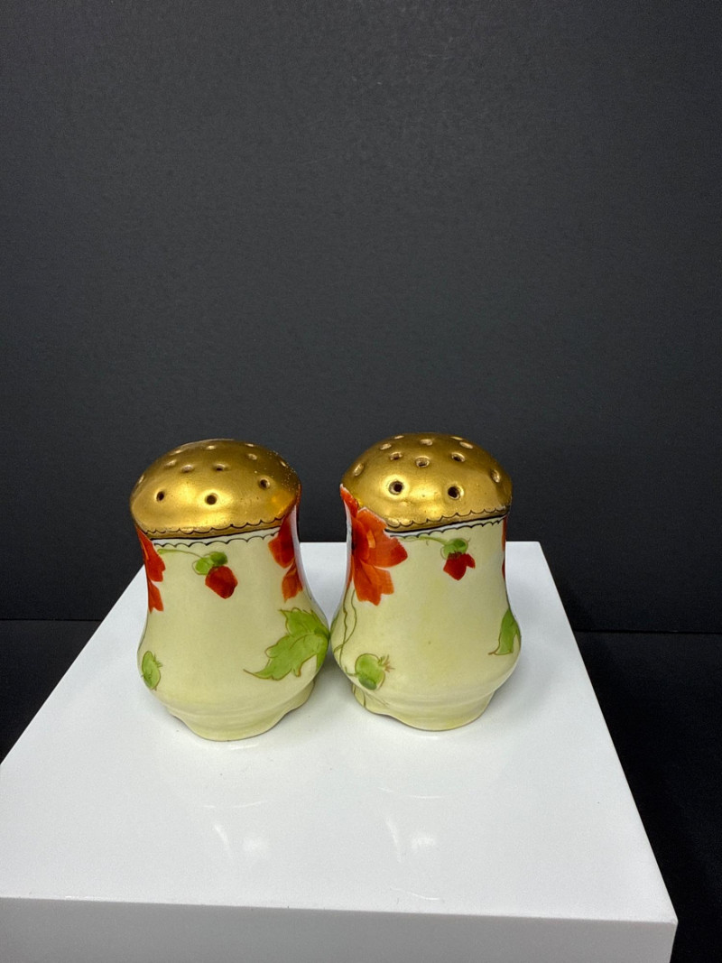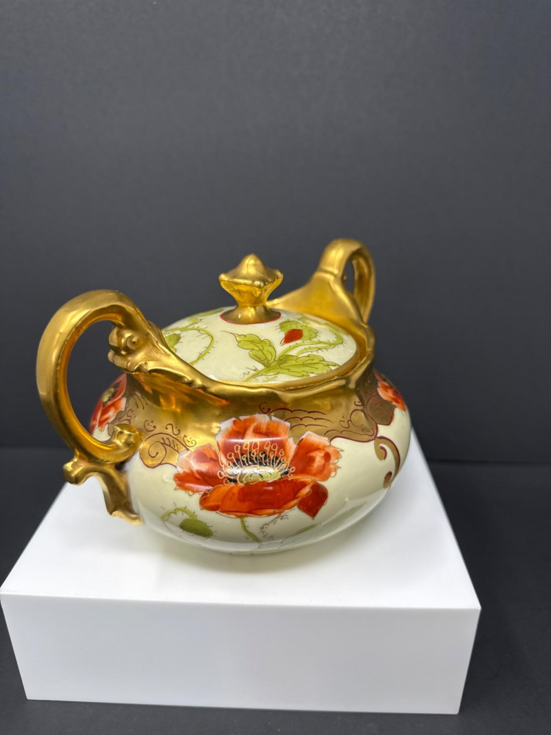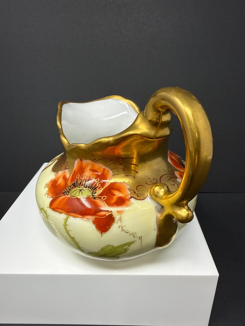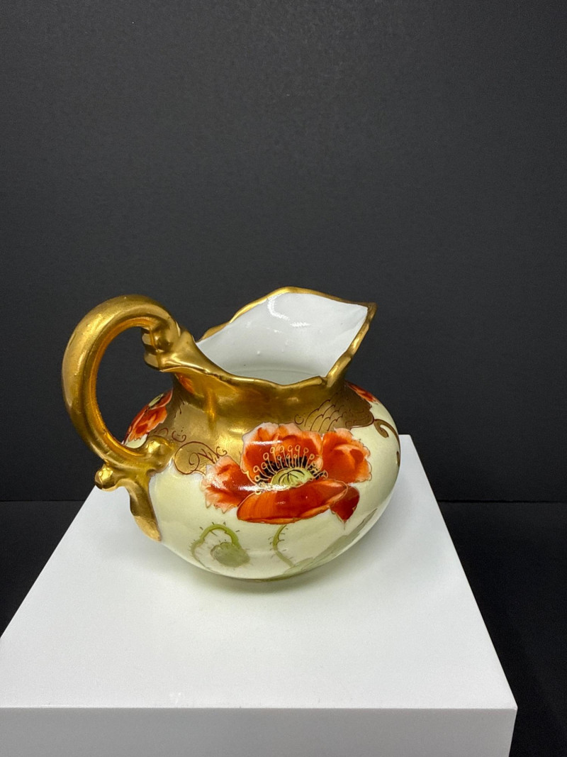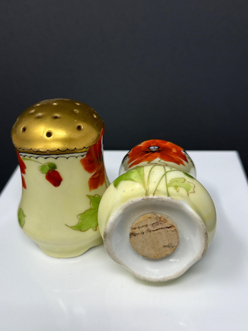 A beautifully coordinated Weimar Germany porcelain set featuring a lidded sugar bowl, creamer, and matching salt and pepper shakers. Each piece is hand‑painted with vivid red poppies and soft green foliage, accented by rich gilt detailing along the rims, handles, and shaker tops. The sugar bowl and creamer display elegant scalloped edges and ornate gold handles, while the shakers echo the same floral motif with domed gilt tops. A charming and cohesive grouping showcasing Weimar’s refined decorative porcelain work. S & P- 2.75 x 2 W sugar bowl- 6 (handle to handle) x 3.5 T ( top of handle) Creamer- 4.5 W x 4 T (handle to handle)