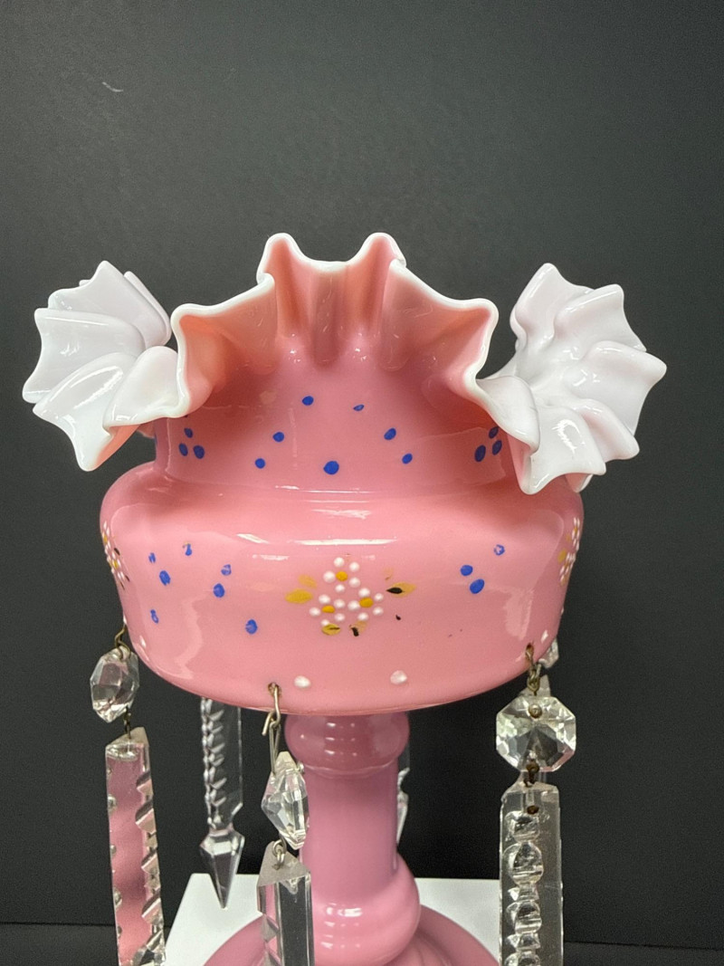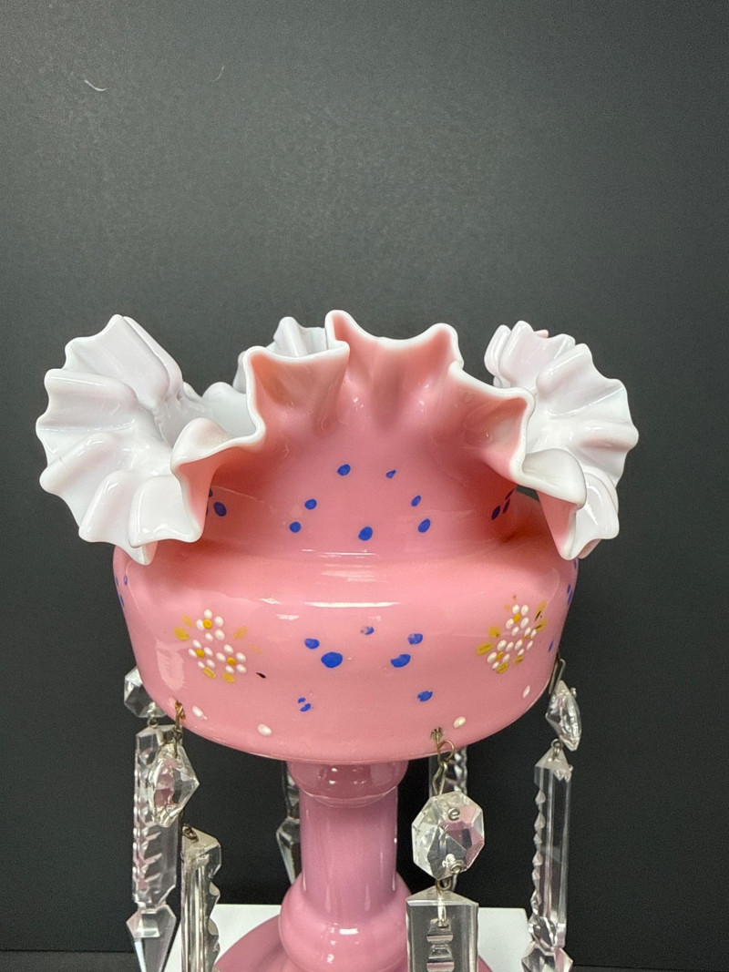 A charming Bohemian Victorian‑style pink lustre featuring a ruffled rim with white edging, hand‑painted floral accents in soft blues and yellows, and a classic satin‑glass body. Clear faceted prisms hang from the midsection, catching light beautifully and adding movement and sparkle. 10 T x 6 W
