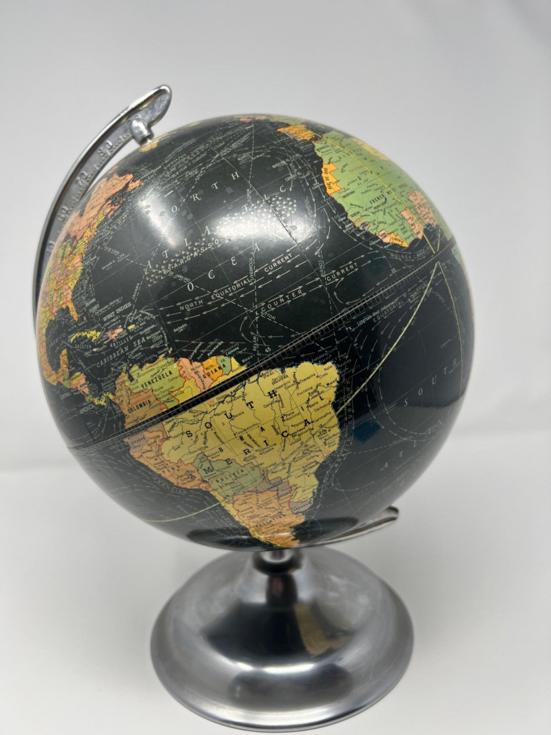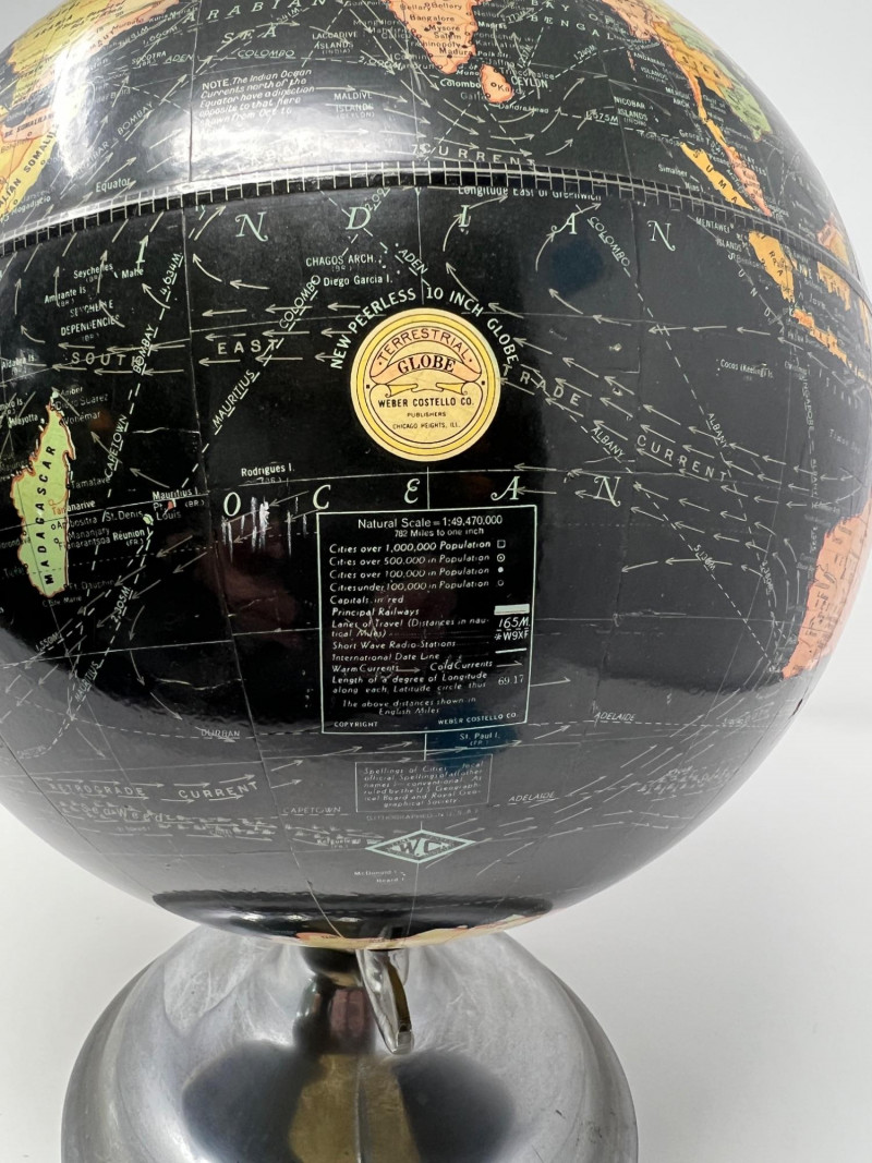 Vintage Weber Costello Peerless 10” terrestrial globe manufactured in Chicago Heights, Illinois. Features desirable black ocean cartography with ocean current charts and a brushed aluminum pedestal base. A classic mid-century academic globe commonly found in schools and libraries during the 1950s. Globe rotates smoothly and presents beautifully with minimal wear. Excellent decorative piece for an office, study, or library.