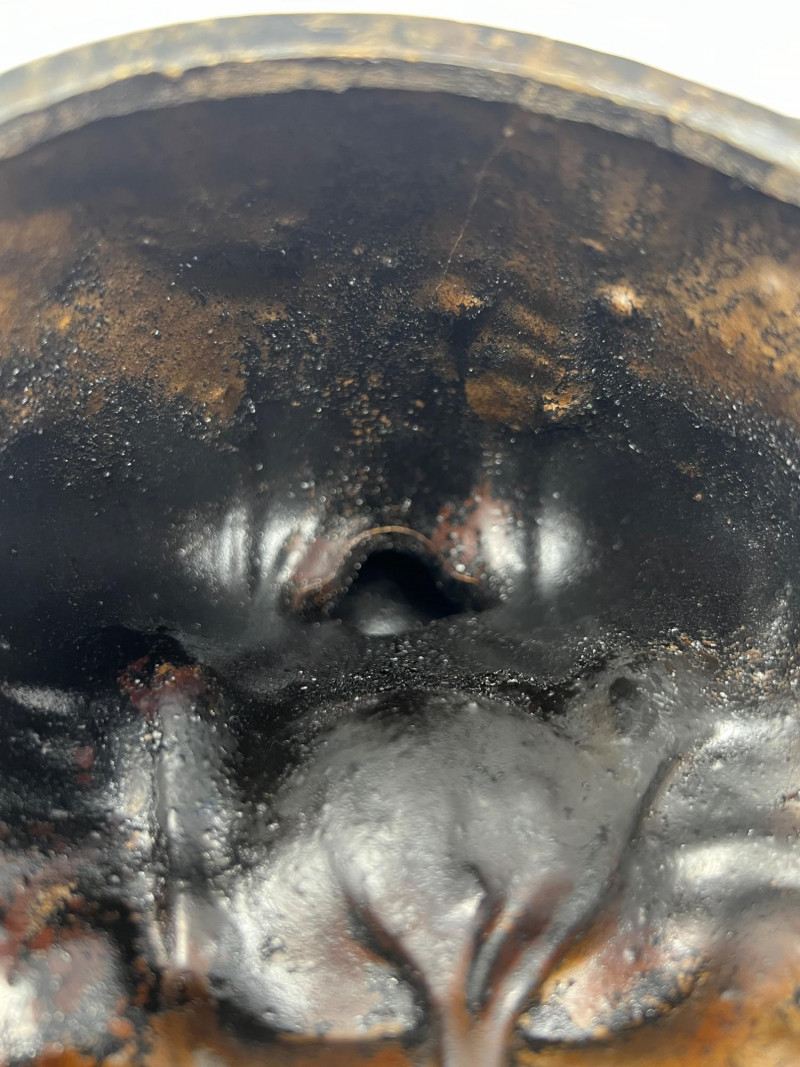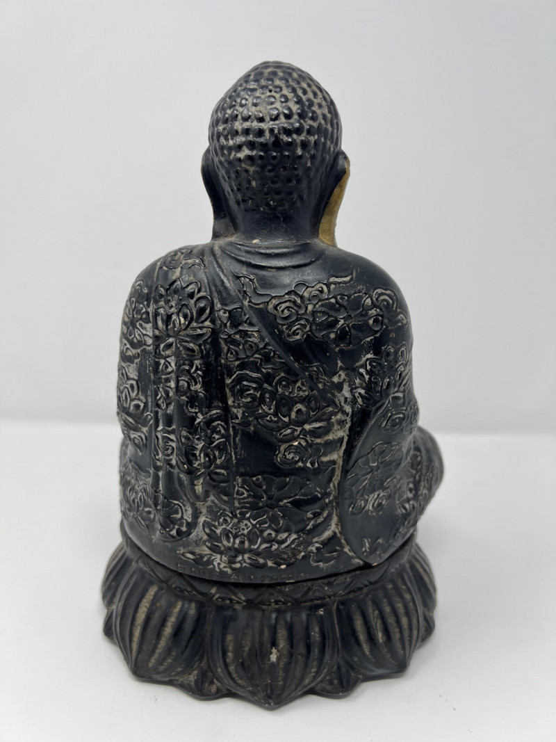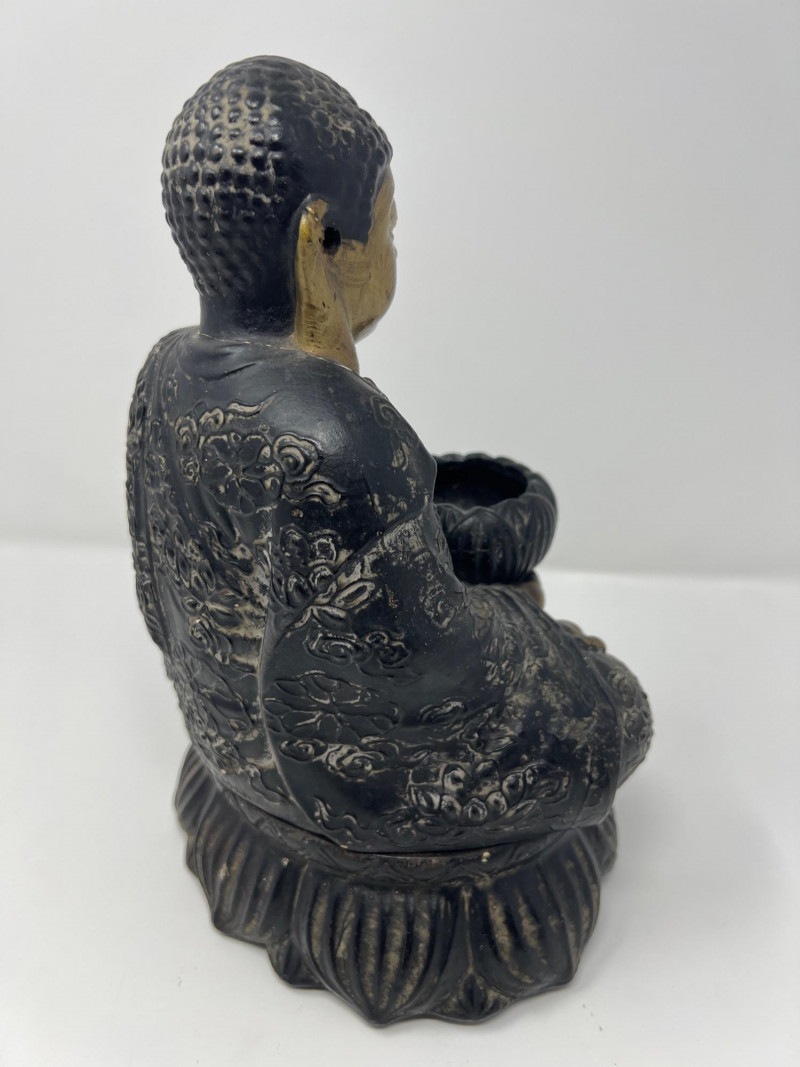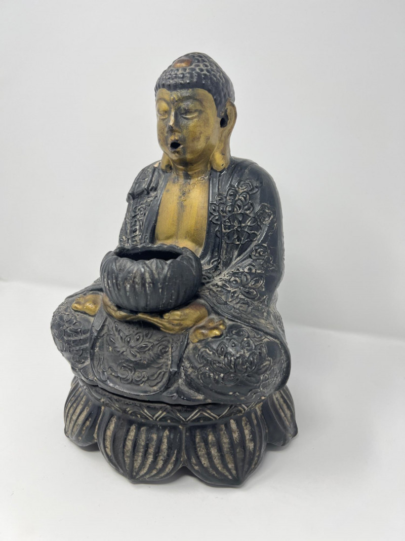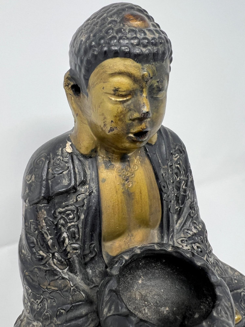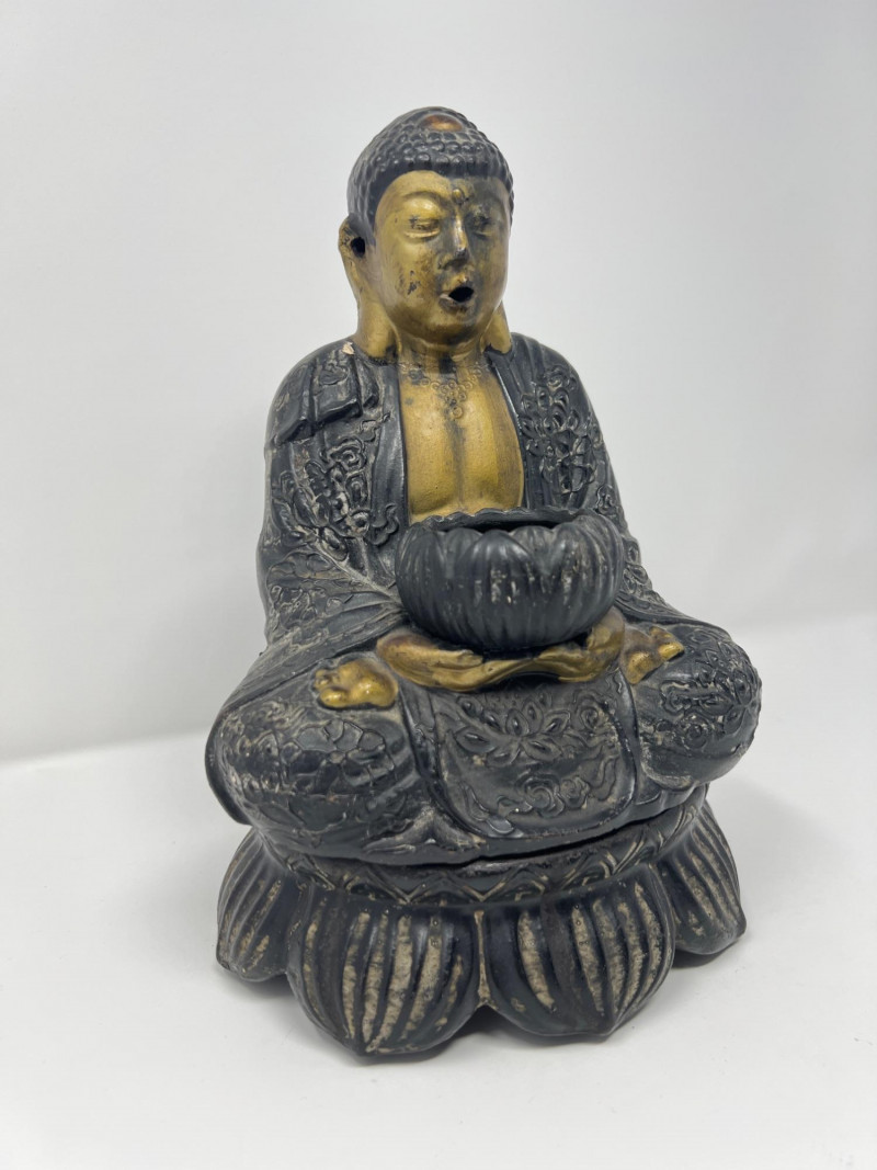 Vintage Chinese figural incense burner depicting Buddha seated in meditation on a lotus base. The figure holds a lotus-form censer bowl and smoke exits through the mouth when incense is burned, creating a dramatic visual effect. Cast metal with dark patinated finish and gilt highlights to the face and chest. Two-piece construction with removable base. Measures approximately 10 1/4 inches tall and 7 inches wide. Condition: surface wear consistent with age and use. The head was previously reattached and repair is visible at the neck (see photos). Displays very well.