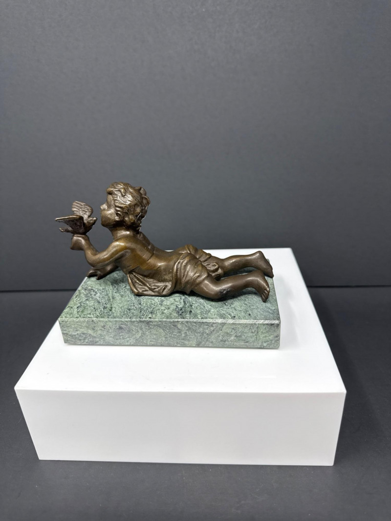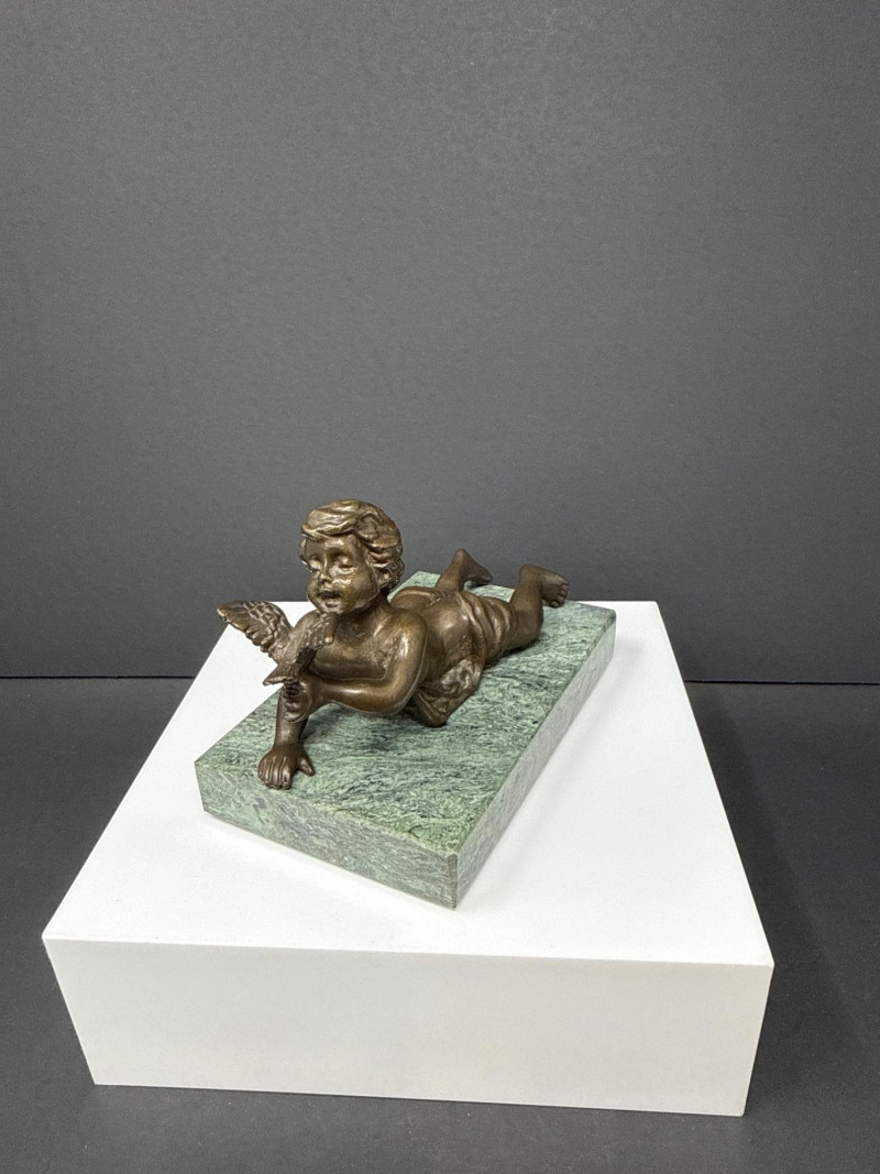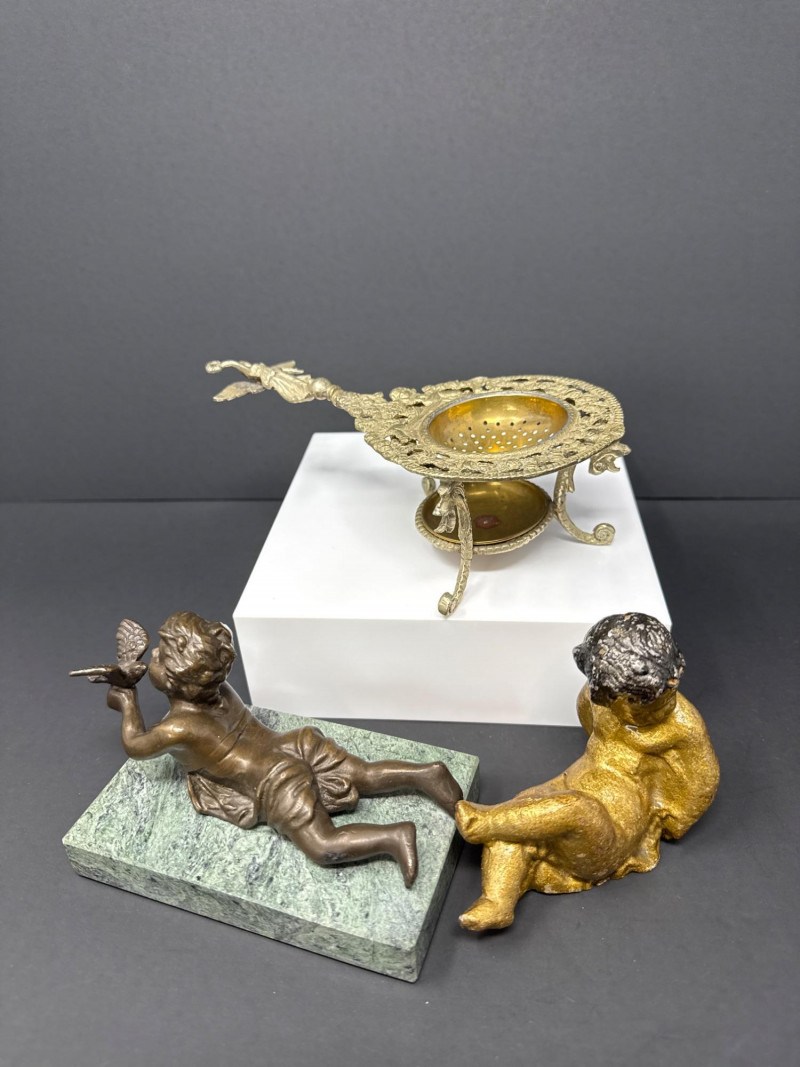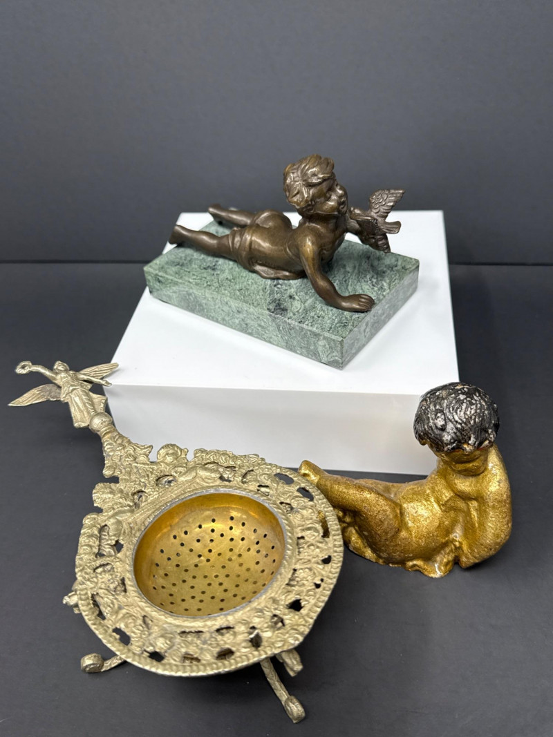 Charming decorative trio including an ornate brass tea strainer with pierced bowl and stand, accompanied by two classical cherub figures. The grouping features a bronze-tone putto reclining on a green marble base holding a butterfly and a gilded cherub figurine with antiqued finish. A lovely Victorian-inspired vignette suitable for display or collection. Light wear consistent with age and decorative use. Sold as a group. Marble base with cherub measures 4.5" x 3", tea strainer with stand measures 6.5" in width and stands 2" in height.