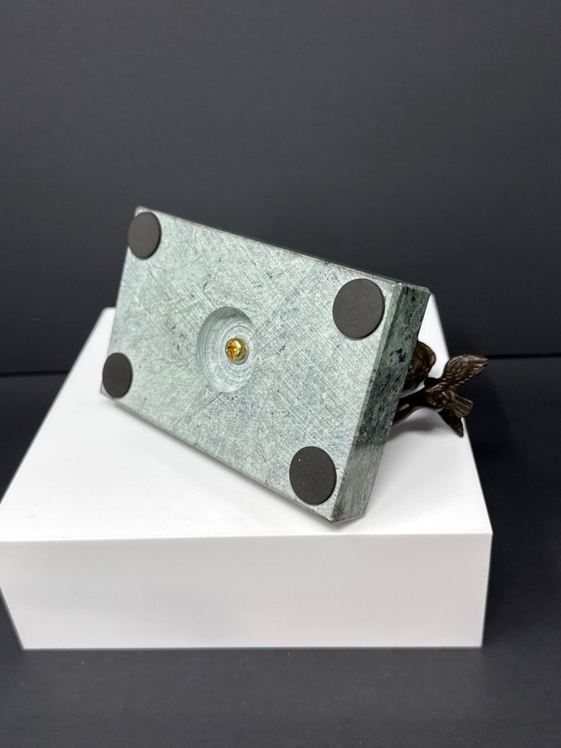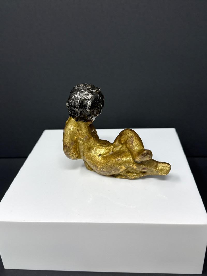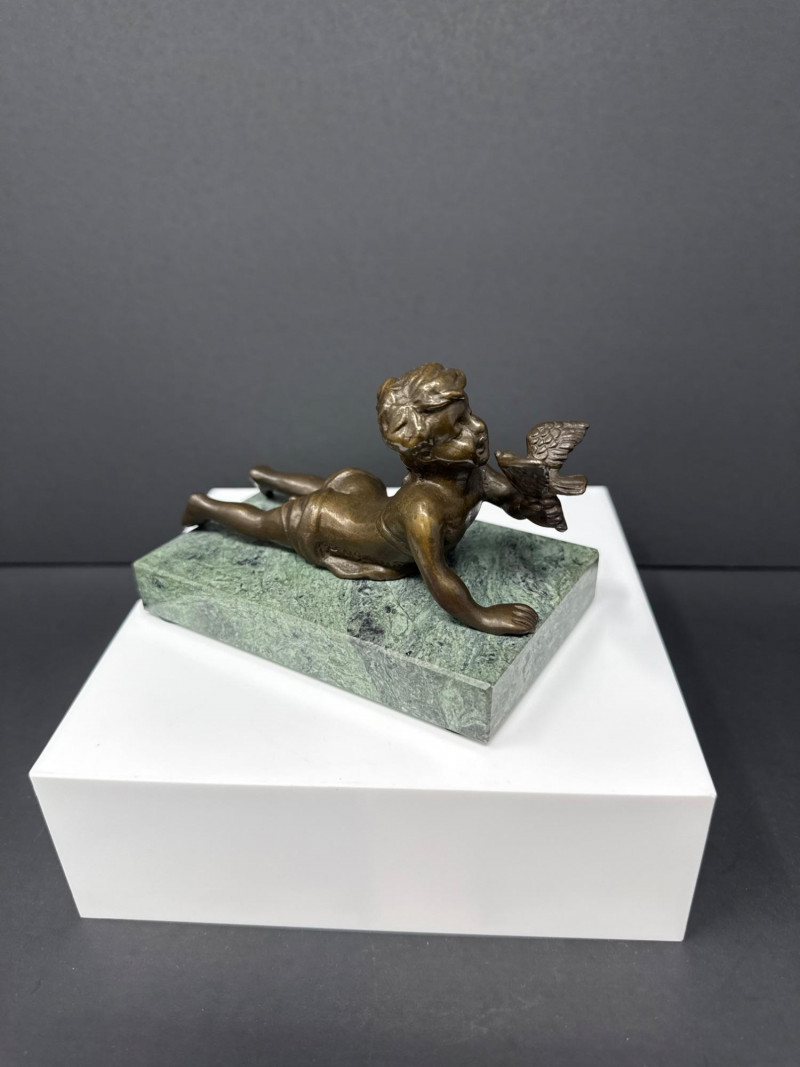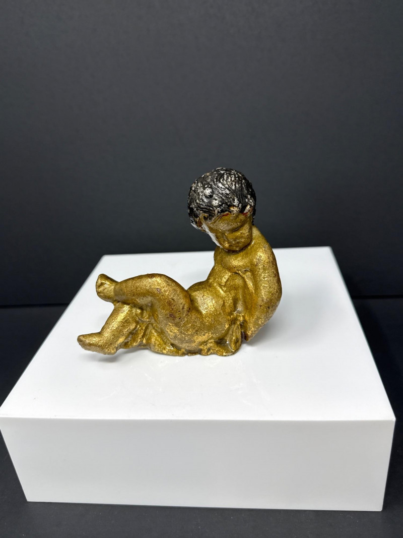 Charming decorative trio including an ornate brass tea strainer with pierced bowl and stand, accompanied by two classical cherub figures. The grouping features a bronze-tone putto reclining on a green marble base holding a butterfly and a gilded cherub figurine with antiqued finish. A lovely Victorian-inspired vignette suitable for display or collection. Light wear consistent with age and decorative use. Sold as a group. Marble base with cherub measures 4.5" x 3", tea strainer with stand measures 6.5" in width and stands 2" in height.