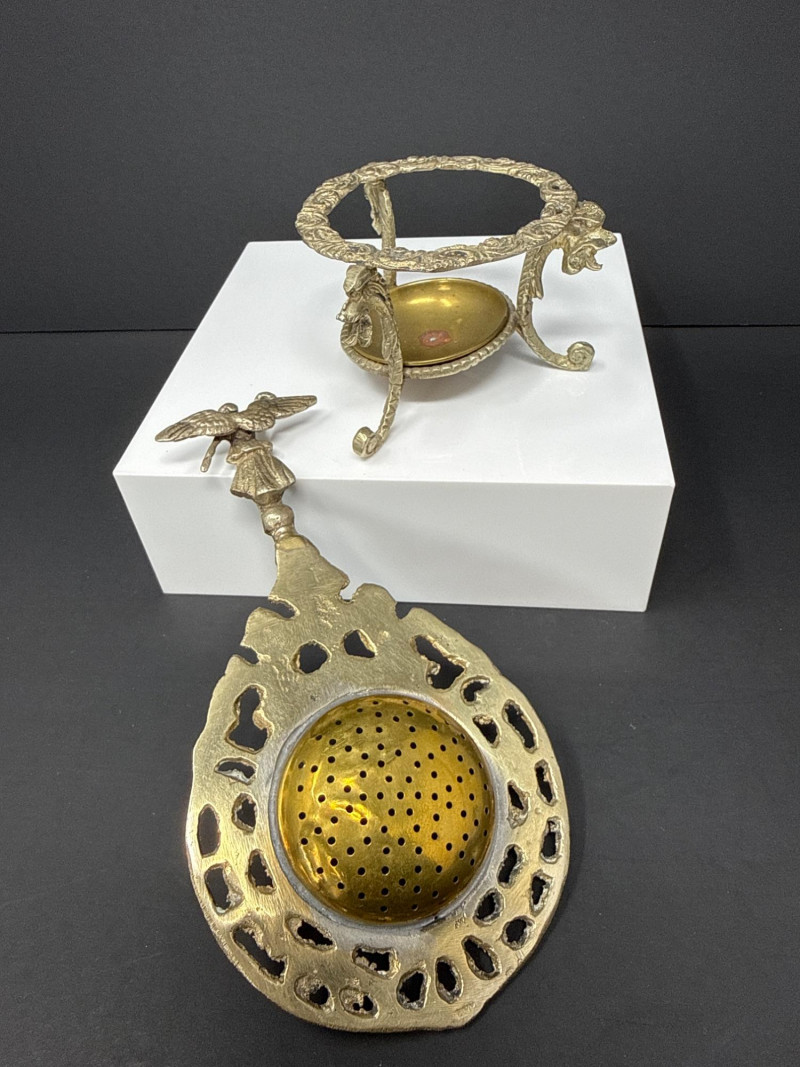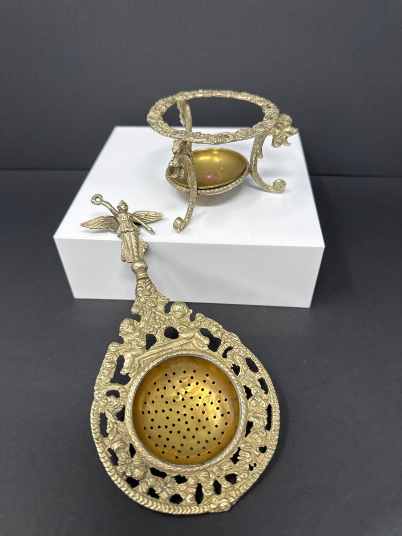 Lot # 15 - Victorian Style Brass Tea Strainer Stand & Cherub Figure