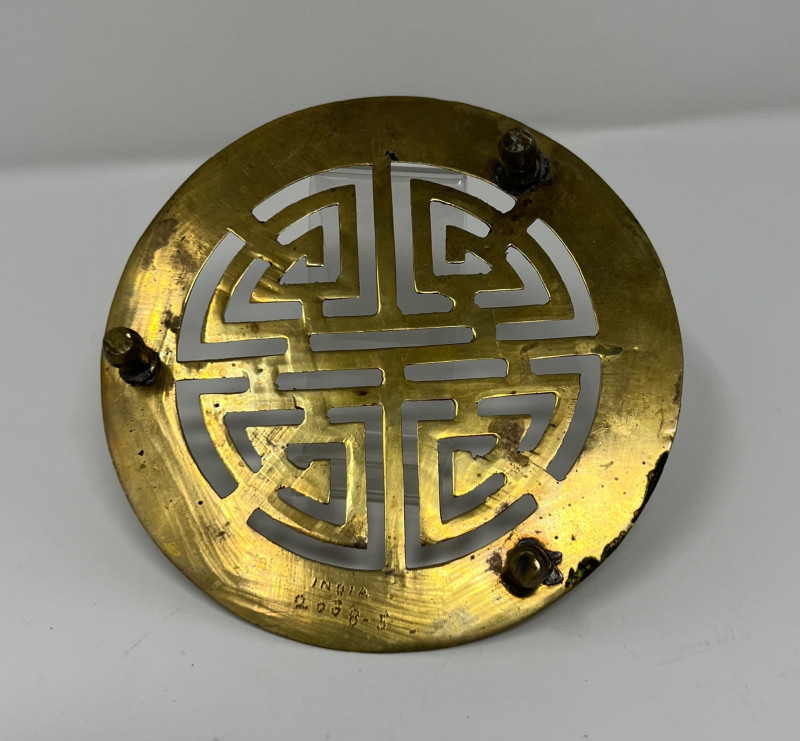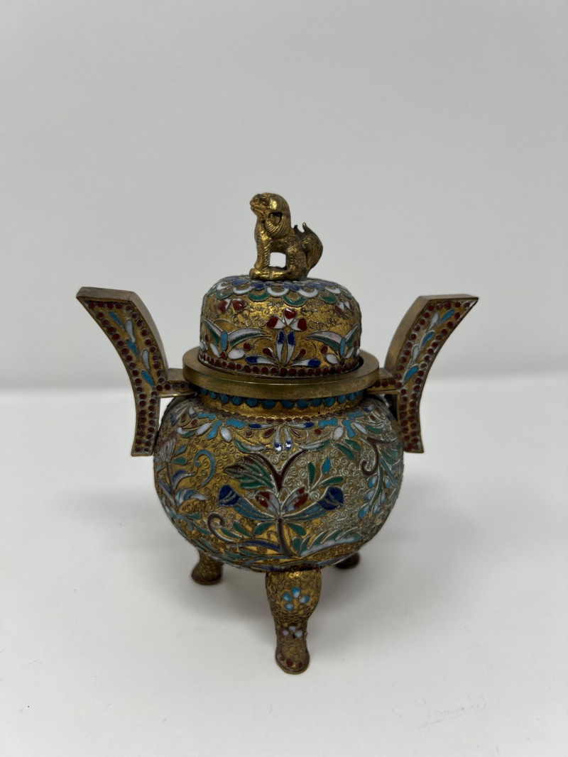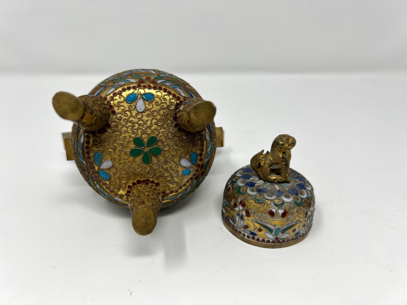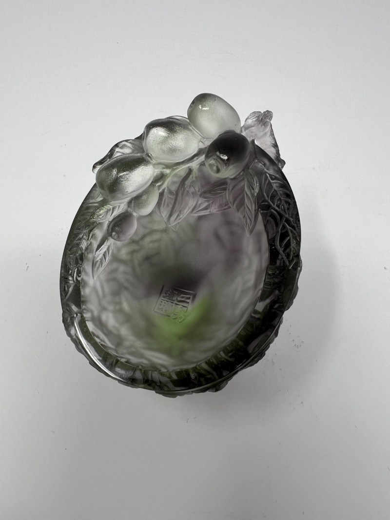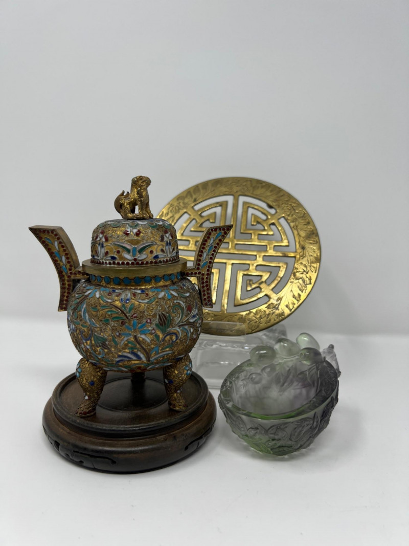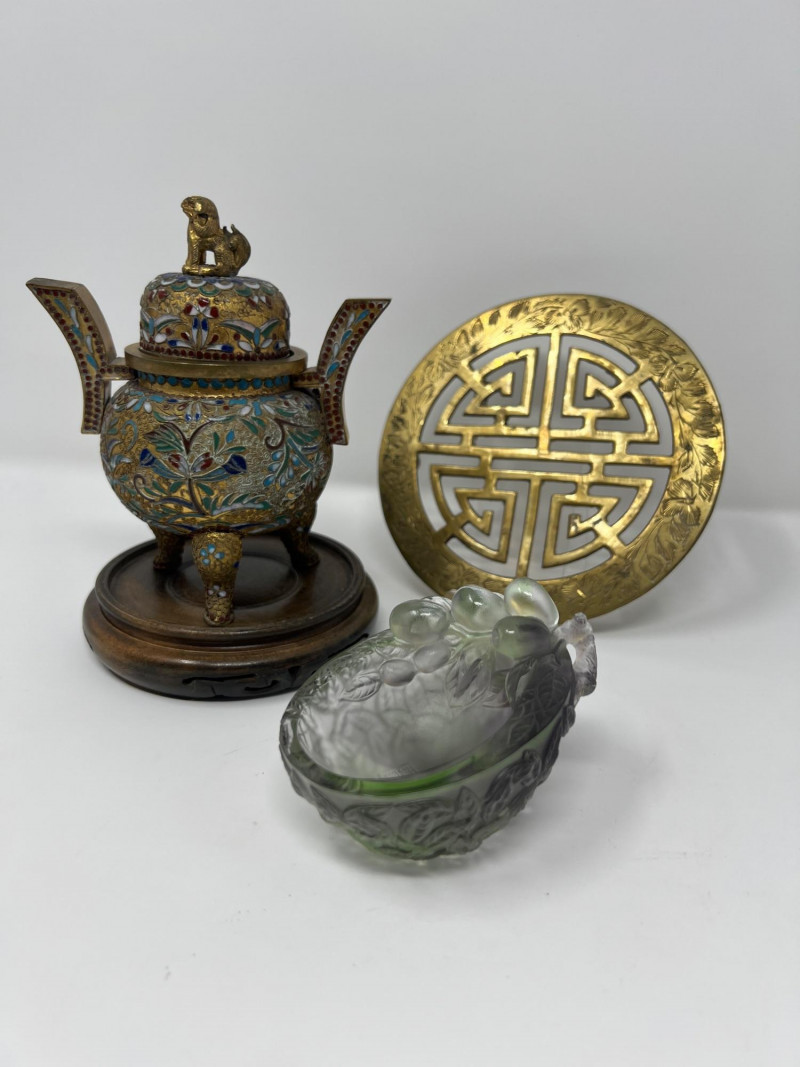 Asian decorative grouping including a colorful cloisonné enamel lidded jar with foo dog finial and tripod feet displayed on a carved wooden stand, a Chinese brass trivet featuring the traditional longevity (Shou) symbol, and a petite frosted crystal trinket or ring dish with sculpted grape motif. The cloisonné jar is decorated with intricate floral enamel work and makes an attractive display piece. The brass trivet displays the auspicious longevity character commonly associated with prosperity and long life in Chinese decorative arts. The small crystal dish provides an elegant accent suitable for jewelry, rings, or vanity display. Together these pieces create a charming decorative vignette for a shelf, console table, or curio cabinet. Condition: Overall good vintage condition with light age-appropriate wear. From a well-collected estate. Lidded jar 5.25" in height. Brass trivet 5" in diameter.