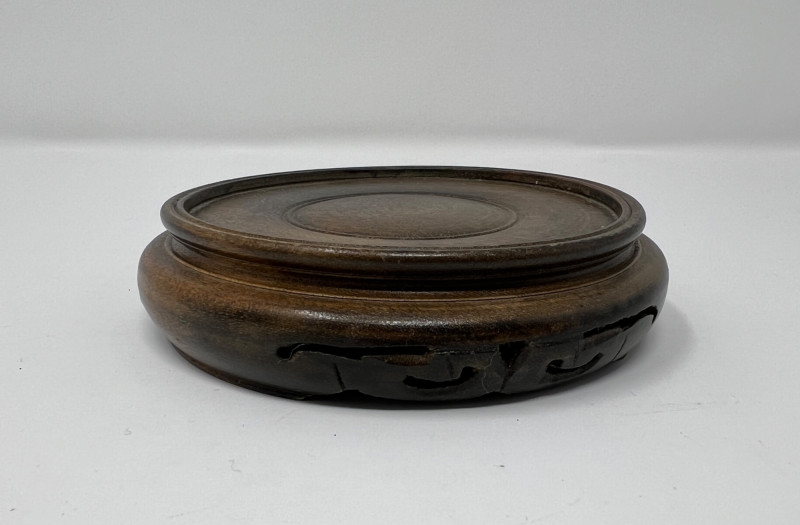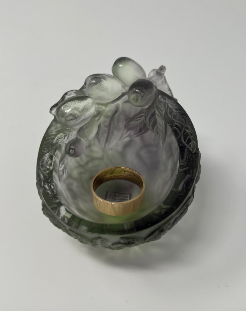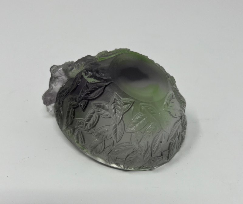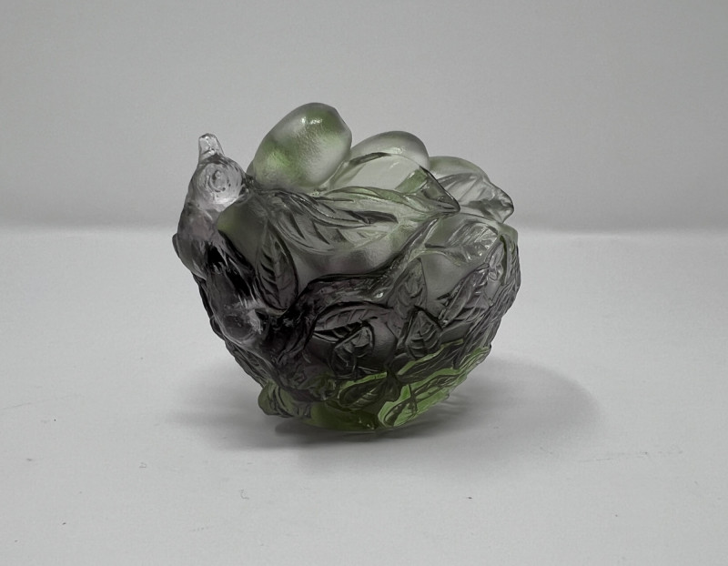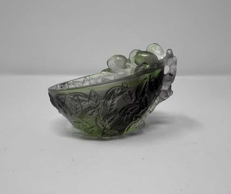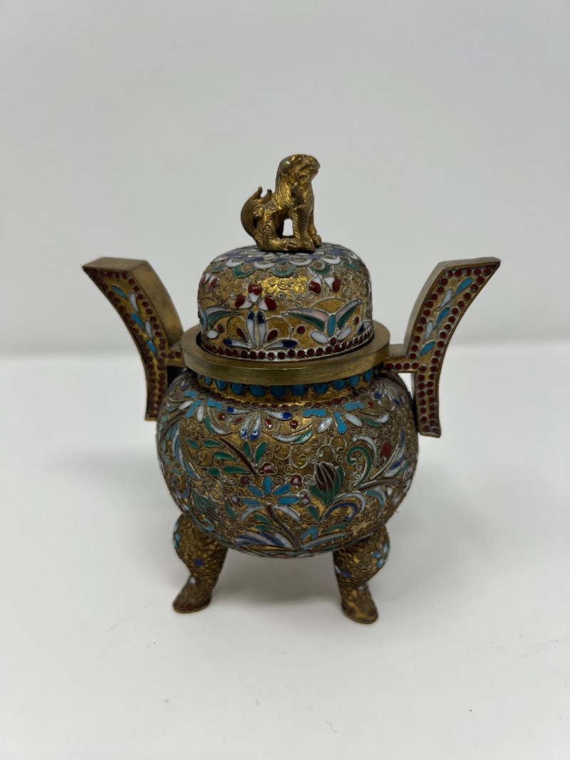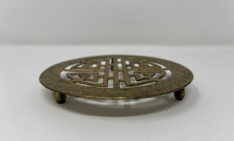 Asian decorative grouping including a colorful cloisonné enamel lidded jar with foo dog finial and tripod feet displayed on a carved wooden stand, a Chinese brass trivet featuring the traditional longevity (Shou) symbol, and a petite frosted crystal trinket or ring dish with sculpted grape motif. The cloisonné jar is decorated with intricate floral enamel work and makes an attractive display piece. The brass trivet displays the auspicious longevity character commonly associated with prosperity and long life in Chinese decorative arts. The small crystal dish provides an elegant accent suitable for jewelry, rings, or vanity display. Together these pieces create a charming decorative vignette for a shelf, console table, or curio cabinet. Condition: Overall good vintage condition with light age-appropriate wear. From a well-collected estate. Lidded jar 5.25" in height. Brass trivet 5" in diameter.