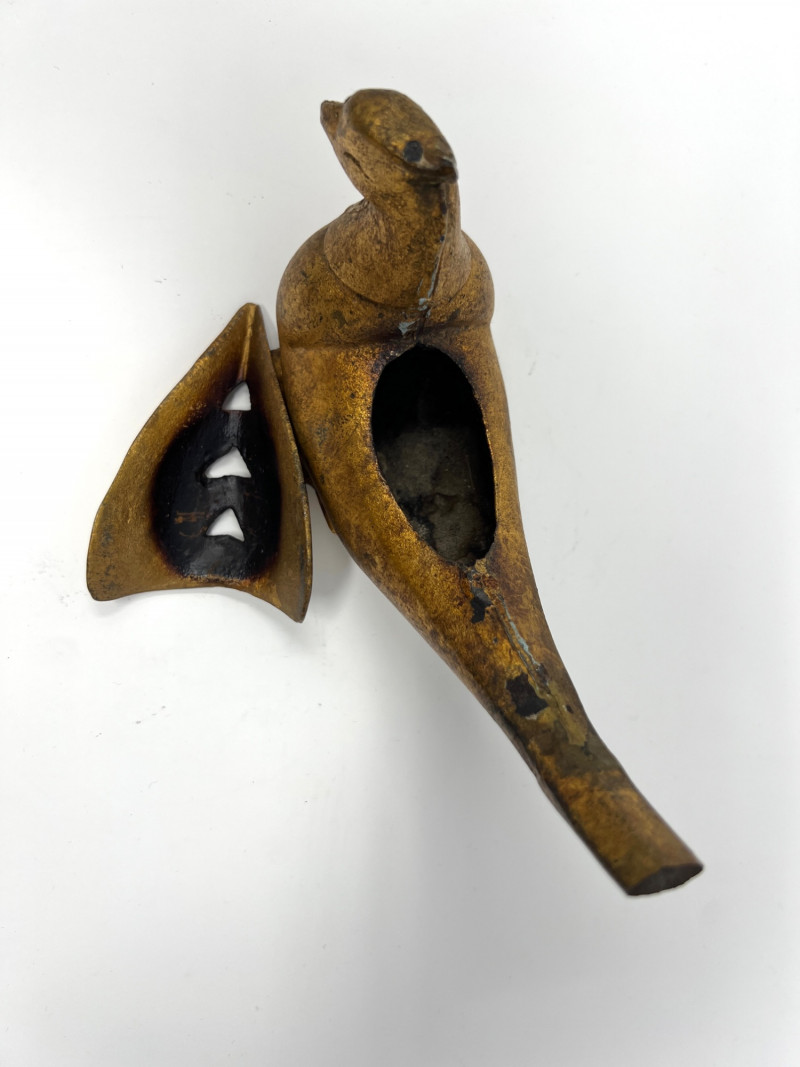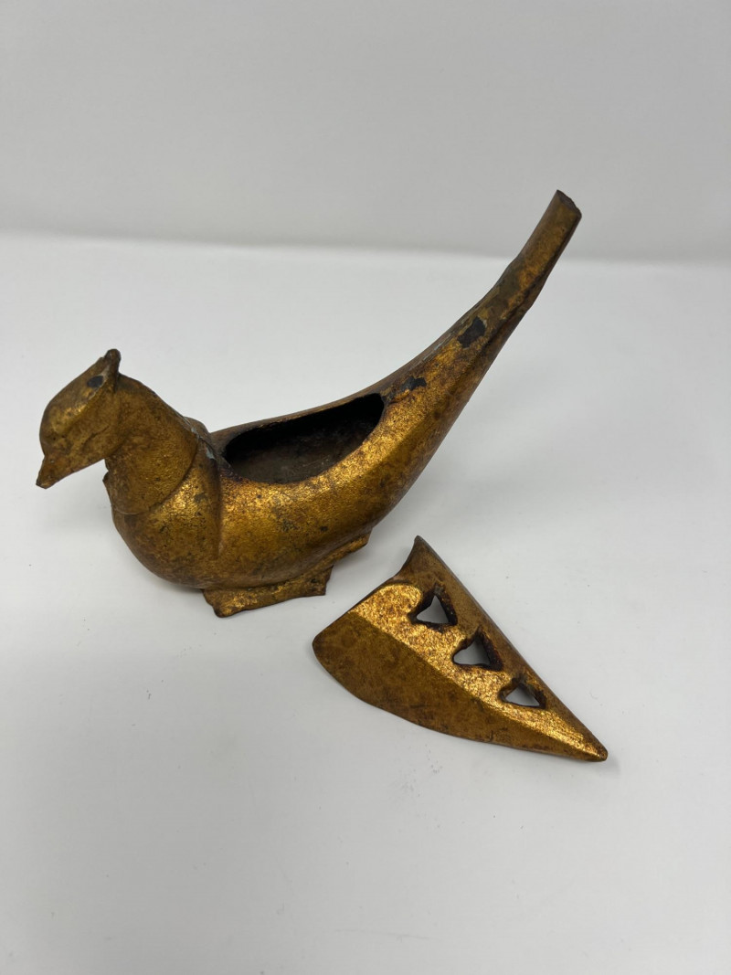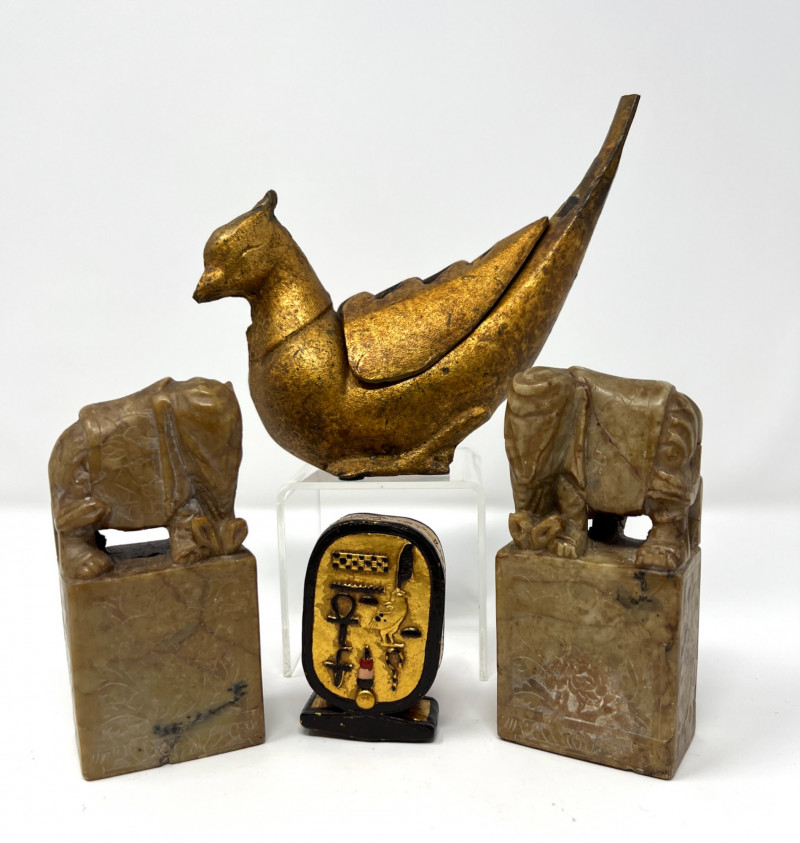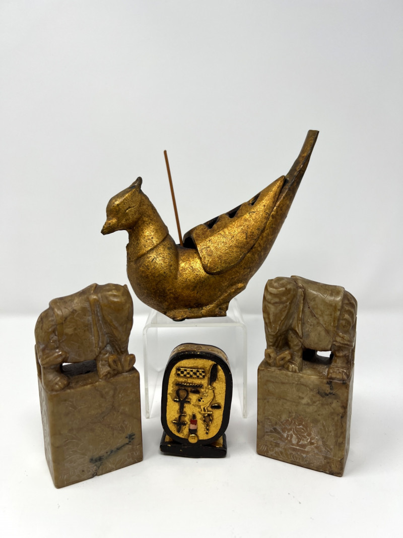 Vintage Global Decorative Object Group An eclectic grouping of vintage decorative objects from an estate collection including a gilt finished cast iron bird-form incense burner, a carved stone pair of elephant bookends, and a small Egyptian revival decorative plaque with raised hieroglyphic motifs. The bird censer features a stylized pheasant form with aged gilt surface and vented lid designed for incense cones or sticks. The elephant bookends are hand carved from stone (likely soapstone or marble) depicting elephants standing on rectangular bases with natural stone veining. Completing the group is a small Egyptian themed decorative sculpture with gilt and painted details. A charming assortment of mid-century decorative objects ideal for bookshelves, desks, or global inspired interiors. Condition consistent with age including light surface wear and natural patina. Bird censer 5.5"T x 6.5"W, Bookends 4.5" H, Egyptian decor 2.75"T.