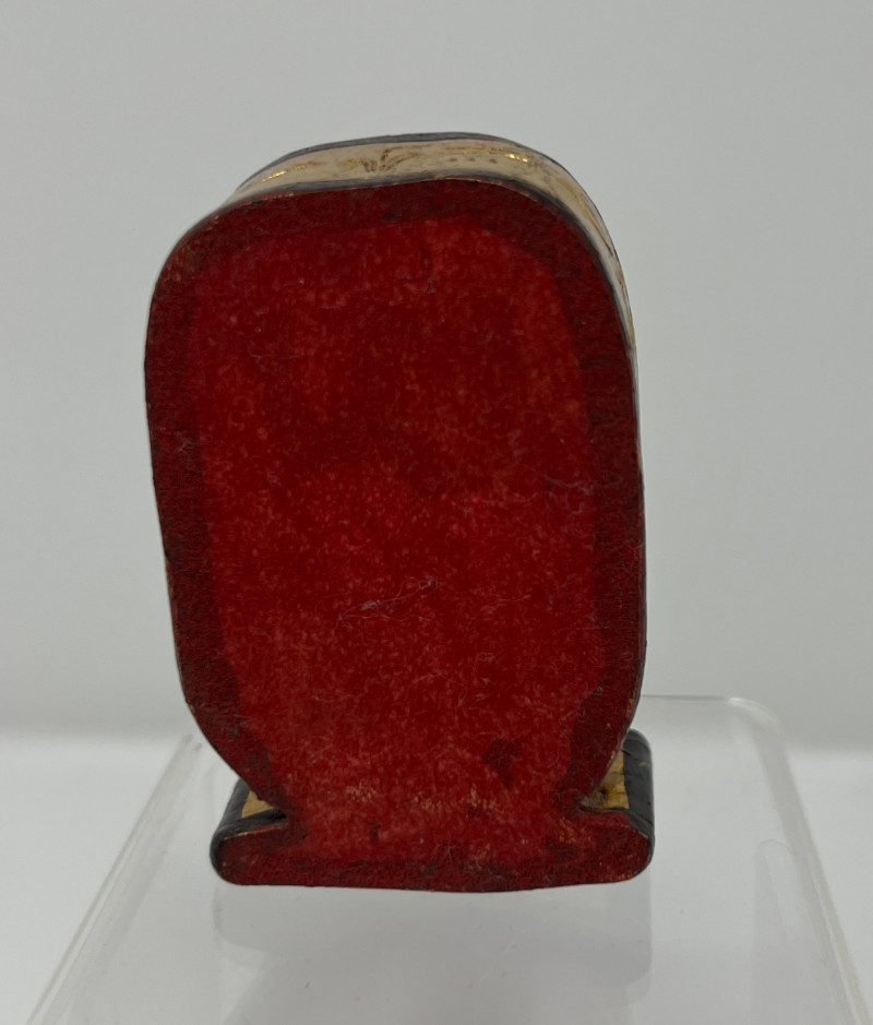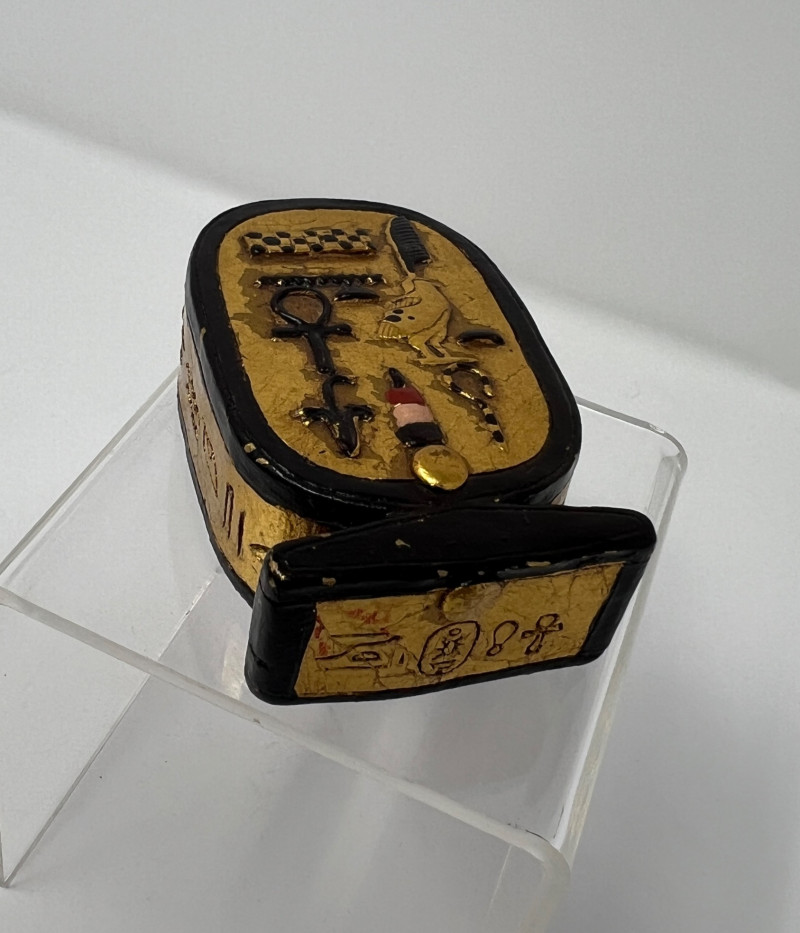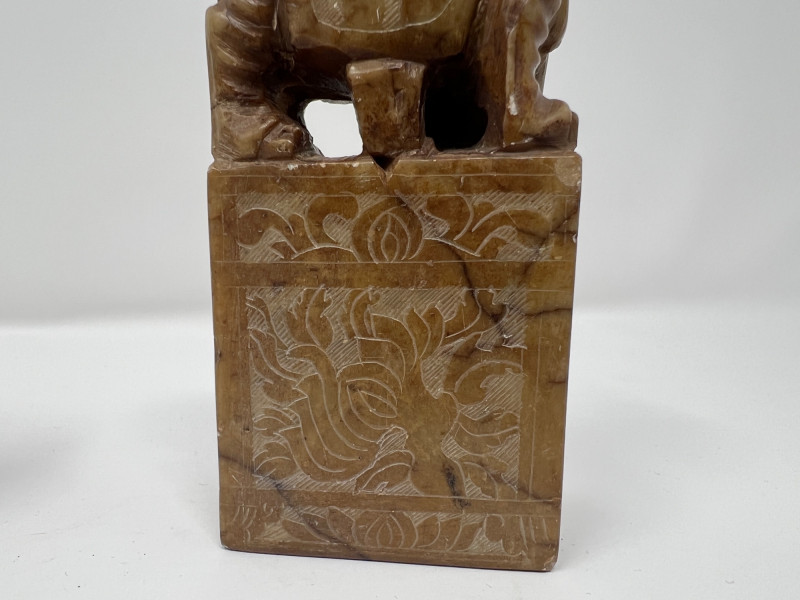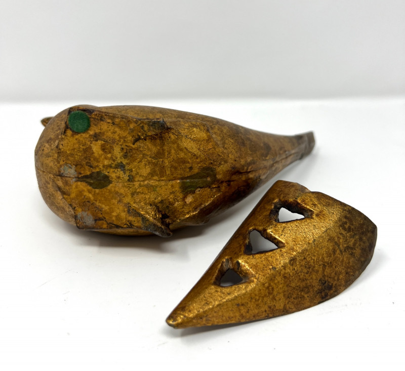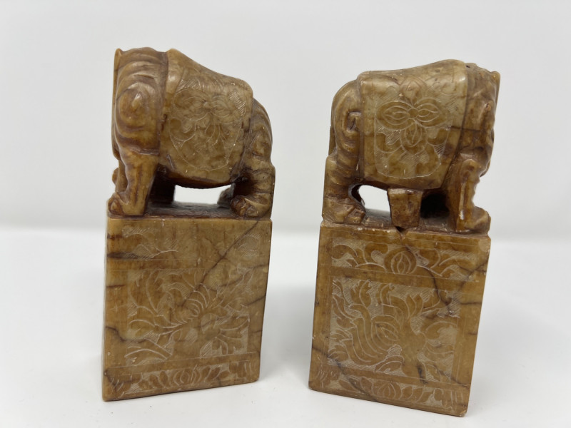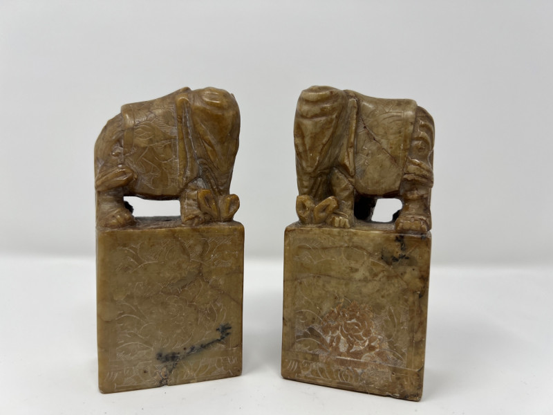 Vintage Global Decorative Object Group An eclectic grouping of vintage decorative objects from an estate collection including a gilt finished cast iron bird-form incense burner, a carved stone pair of elephant bookends, and a small Egyptian revival decorative plaque with raised hieroglyphic motifs. The bird censer features a stylized pheasant form with aged gilt surface and vented lid designed for incense cones or sticks. The elephant bookends are hand carved from stone (likely soapstone or marble) depicting elephants standing on rectangular bases with natural stone veining. Completing the group is a small Egyptian themed decorative sculpture with gilt and painted details. A charming assortment of mid-century decorative objects ideal for bookshelves, desks, or global inspired interiors. Condition consistent with age including light surface wear and natural patina. Bird censer 5.5"T x 6.5"W, Bookends 4.5" H, Egyptian decor 2.75"T.