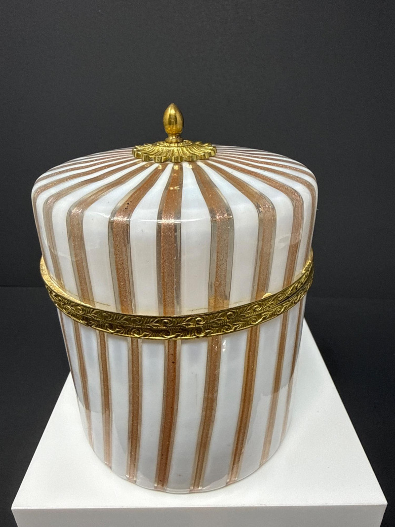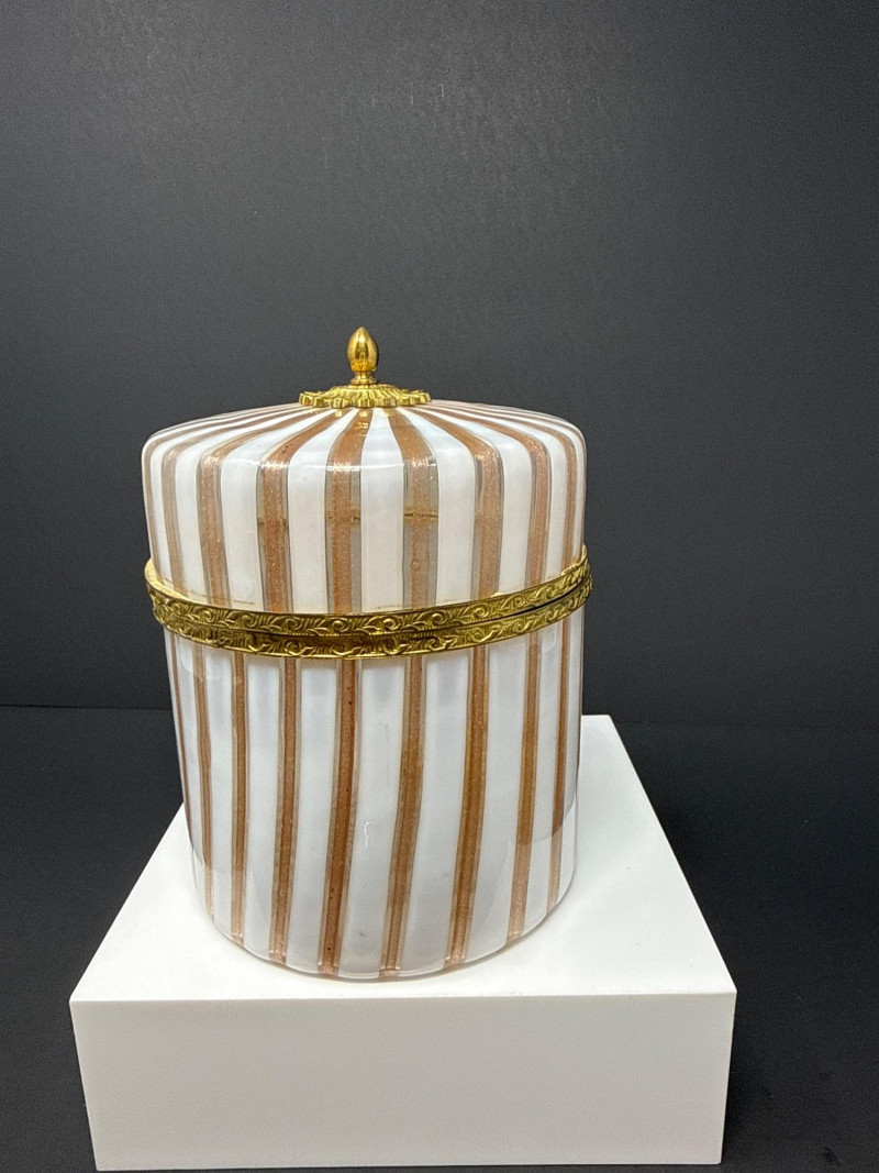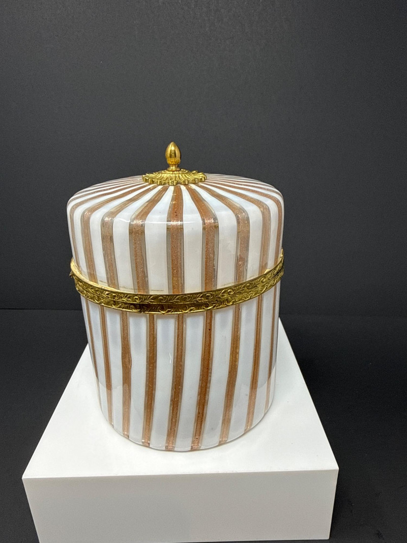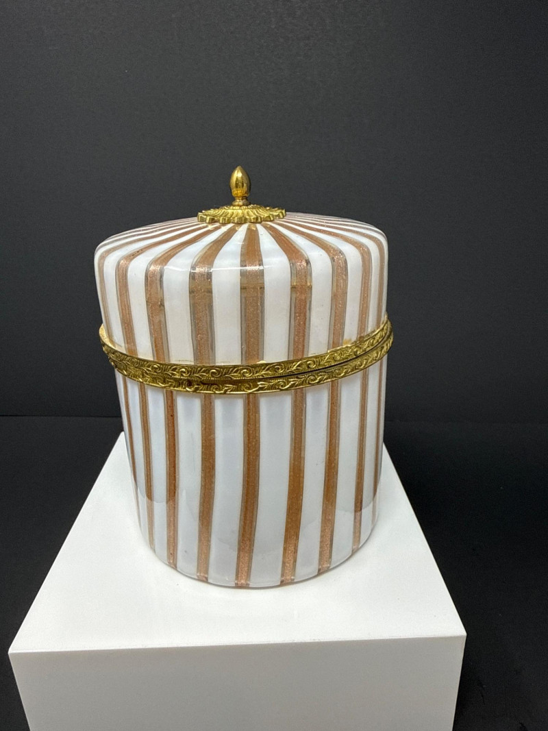 A luxurious opaline glass hinged box attributed to Mottahedeh, crafted in Murano and finished with ornate ormolu mounts. The cylindrical form features alternating vertical white, pink and gold striping, topped with a domed lid crowned by a gilt finial. A decorative gilt band encircles the upper body, adding richness and architectural definition. The opaline glass glows softly through the gilded accents, creating a refined interplay of translucence and metallic detail. A striking example of Italian decorative glass with high‑end Mottahedeh styling and exceptional craftsmanship. 5” T x 4.5 W