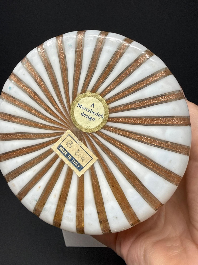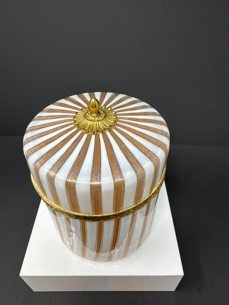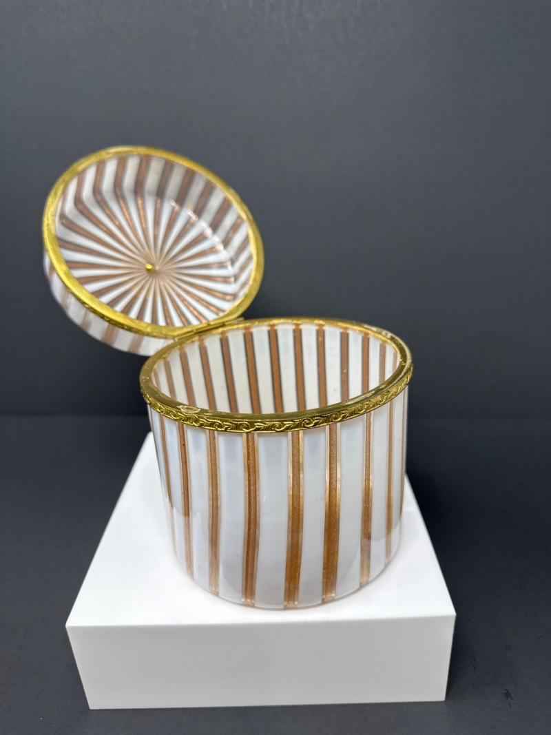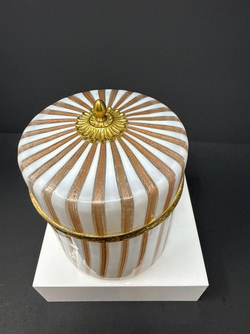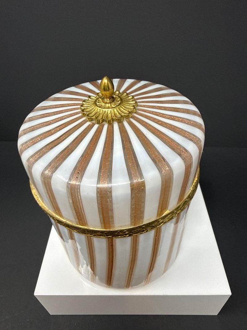 A luxurious opaline glass hinged box attributed to Mottahedeh, crafted in Murano and finished with ornate ormolu mounts. The cylindrical form features alternating vertical white, pink and gold striping, topped with a domed lid crowned by a gilt finial. A decorative gilt band encircles the upper body, adding richness and architectural definition. The opaline glass glows softly through the gilded accents, creating a refined interplay of translucence and metallic detail. A striking example of Italian decorative glass with high‑end Mottahedeh styling and exceptional craftsmanship. 5” T x 4.5 W