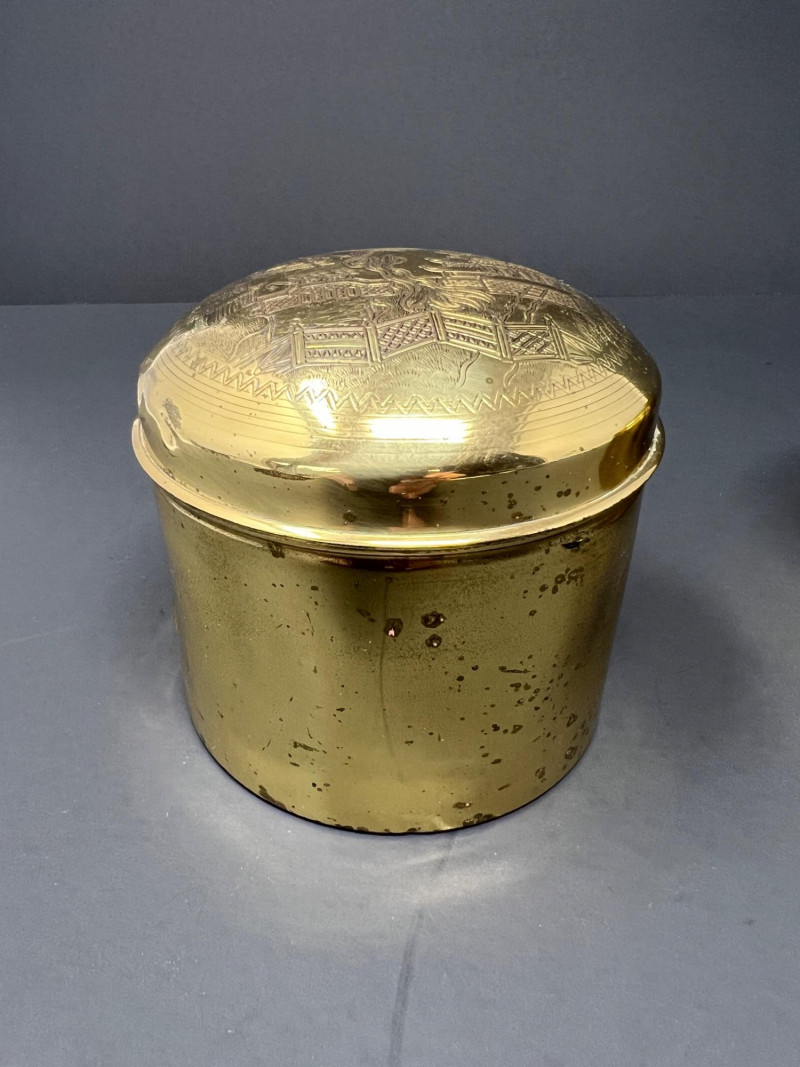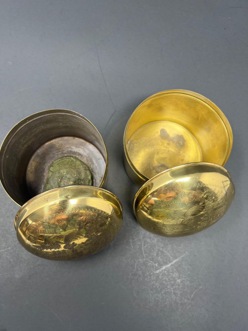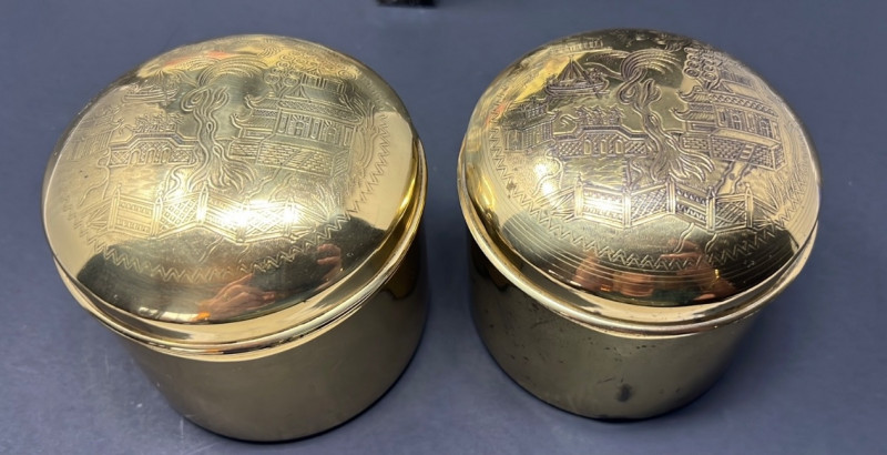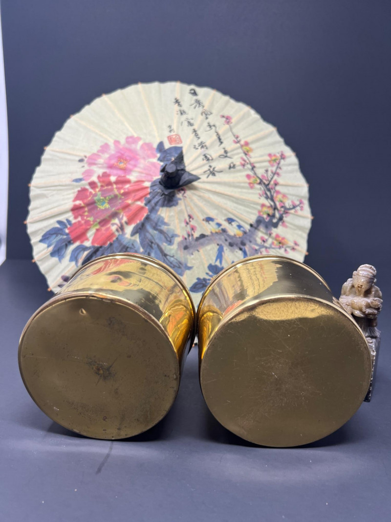 A charming grouping of Asian decorative pieces including a pair of engraved brass containers, a carved soapstone monk figure, and a hand-painted decorative parasol. The matching brass boxes feature detailed engraved landscape scenes with pagodas, bridges, and stylized trees within a geometric border. These classic mid-20th-century Chinese export pieces were commonly used as tea caddies, tobacco containers, or decorative trinket boxes and display a warm aged patina. Also included is a small carved soapstone figure depicting a robed monk or scholar holding a small animal, mounted on a square base, along with a decorative painted paper parasol featuring floral and calligraphy motifs. A lovely decorative grouping ideal for shelf styling, desk display, or Asian-inspired interiors. The tea caddies are 3.75" in both height & diameter. The parasol is 11.75" in diameter when open & the handle is 10" in overall length. The soapstone monk figure is almost 4" in height.