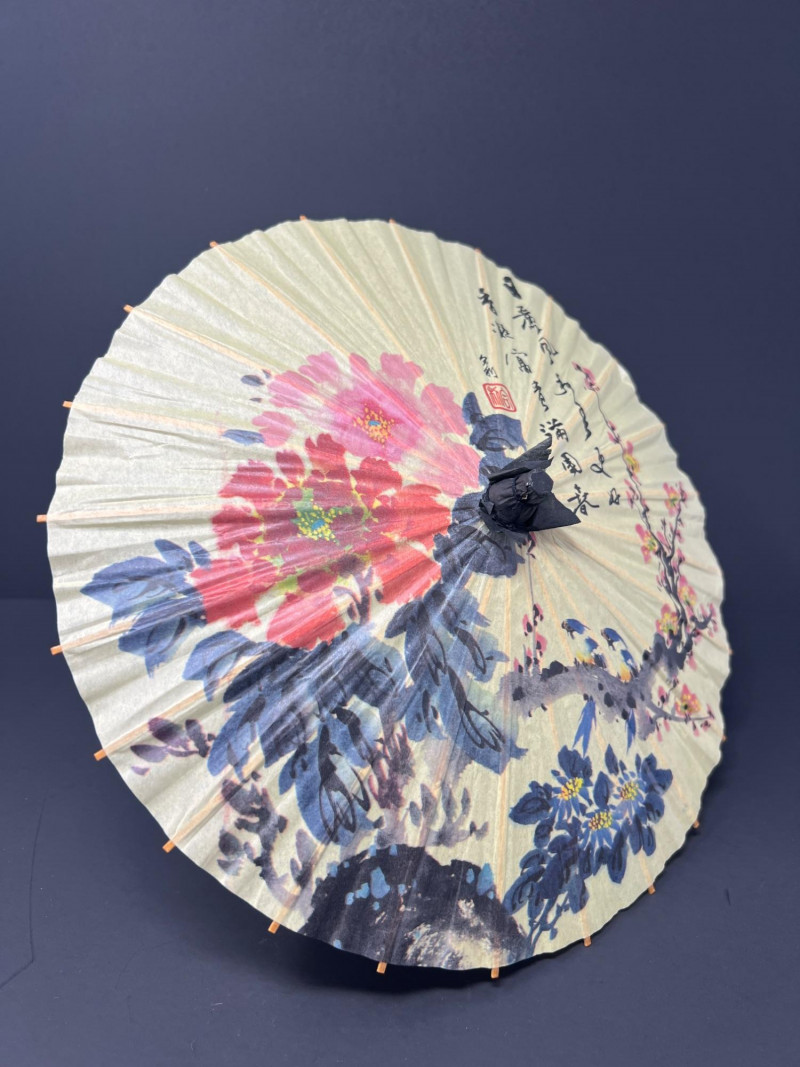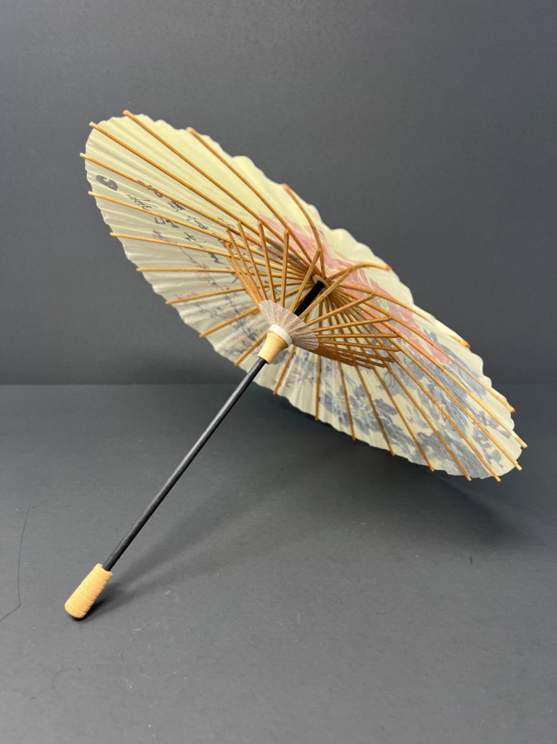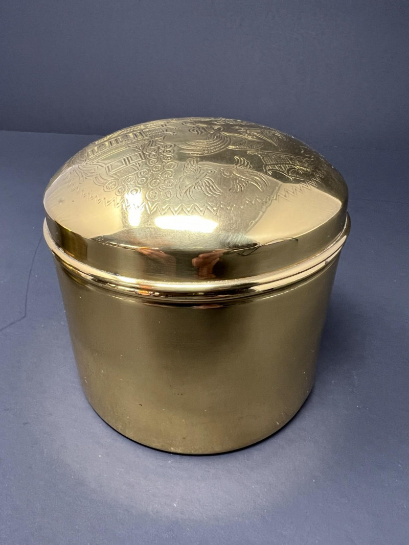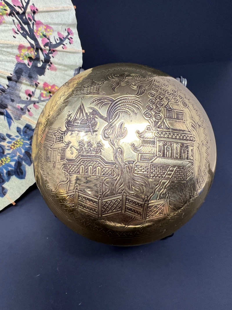 A charming grouping of Asian decorative pieces including a pair of engraved brass containers, a carved soapstone monk figure, and a hand-painted decorative parasol. The matching brass boxes feature detailed engraved landscape scenes with pagodas, bridges, and stylized trees within a geometric border. These classic mid-20th-century Chinese export pieces were commonly used as tea caddies, tobacco containers, or decorative trinket boxes and display a warm aged patina. Also included is a small carved soapstone figure depicting a robed monk or scholar holding a small animal, mounted on a square base, along with a decorative painted paper parasol featuring floral and calligraphy motifs. A lovely decorative grouping ideal for shelf styling, desk display, or Asian-inspired interiors. The tea caddies are 3.75" in both height & diameter. The parasol is 11.75" in diameter when open & the handle is 10" in overall length. The soapstone monk figure is almost 4" in height.