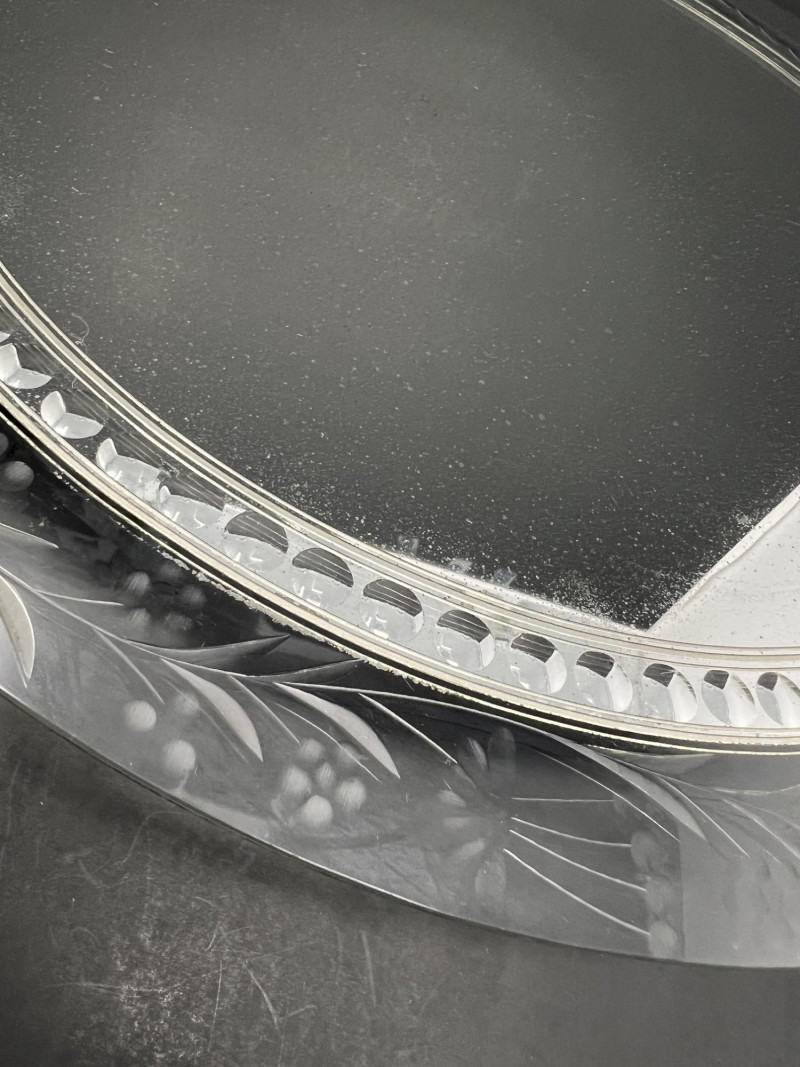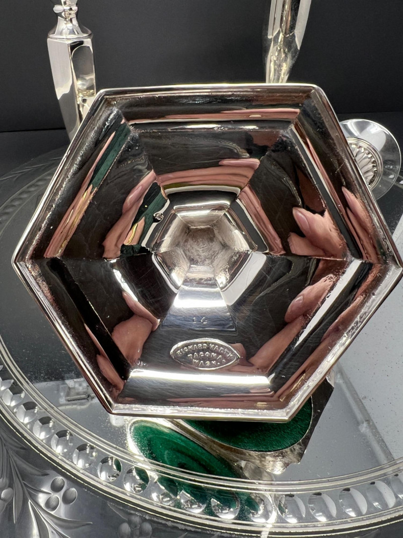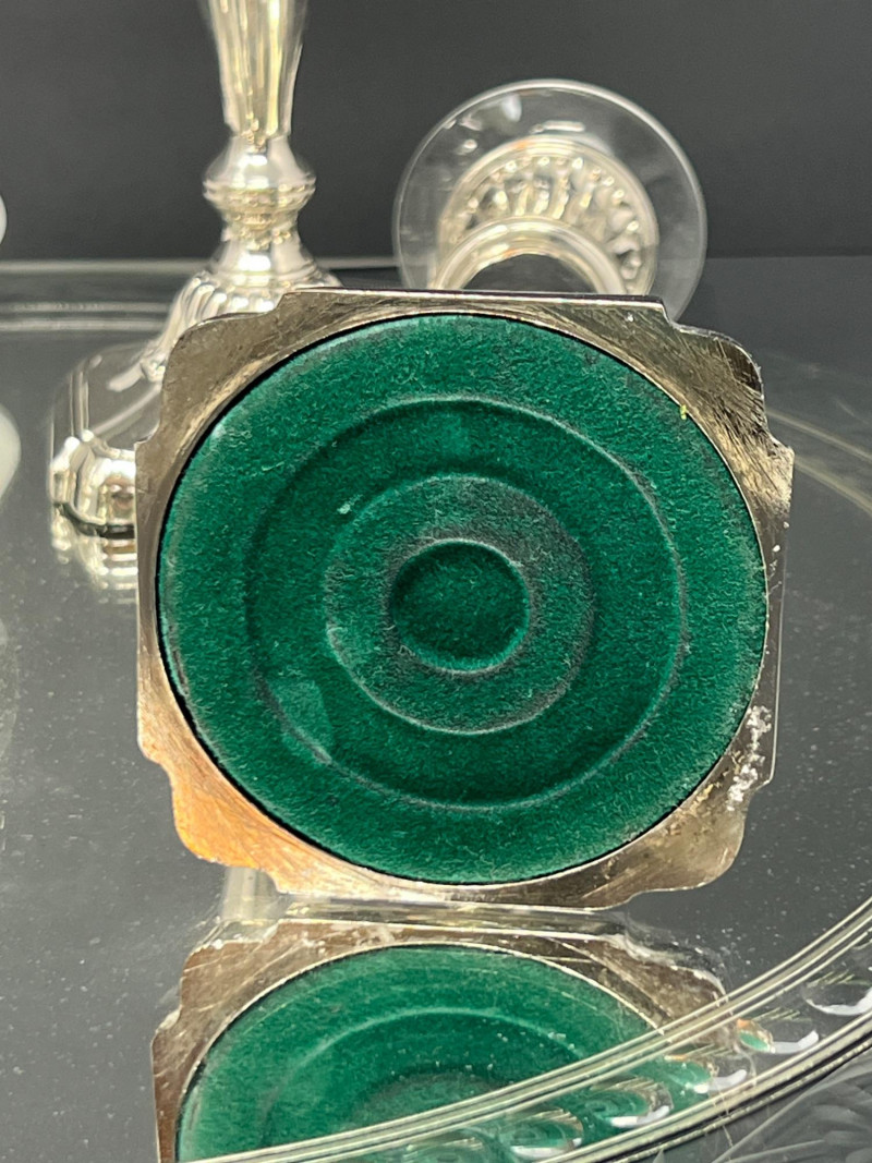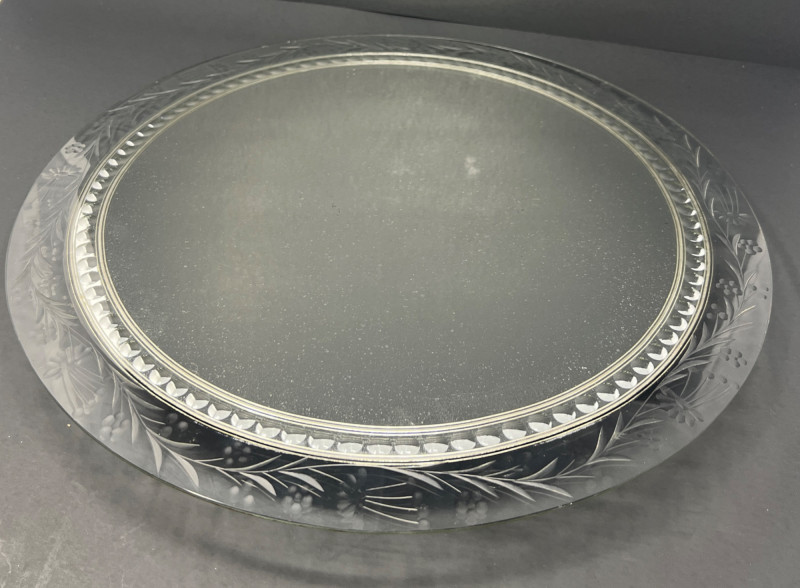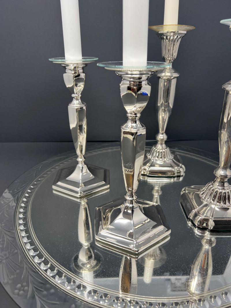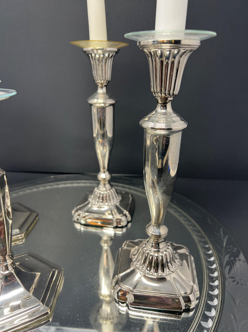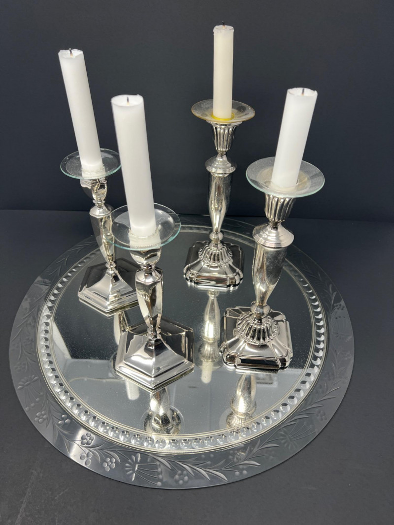 Elegant traditional table décor featuring two pairs of silver-plated candlesticks displayed on an etched glass mirrored centerpiece plateau. One pair is marked Tacoma Washington from a regional jeweler, typical of mid-20th-century silverplate retailed through American jewelry stores. The candlesticks feature classic faceted stems and weighted bases, one pair with green felt undersides. Each candlestick retains its clear glass bobeche drip guard. The glass plateau has a beautifully etched floral border with mirrored center, perfect for displaying candles, florals, or seasonal décor. A lovely ready-to-use centerpiece for formal dining, weddings, or traditional interiors. Includes: • Two pairs silverplate candlesticks (4 total) • Etched glass mirrored centerpiece plateau Condition consistent with age including light surface wear to plate and mirror. Glass centerpiece is 18" in diameter, candlesticks are 8" & 9" in height.
