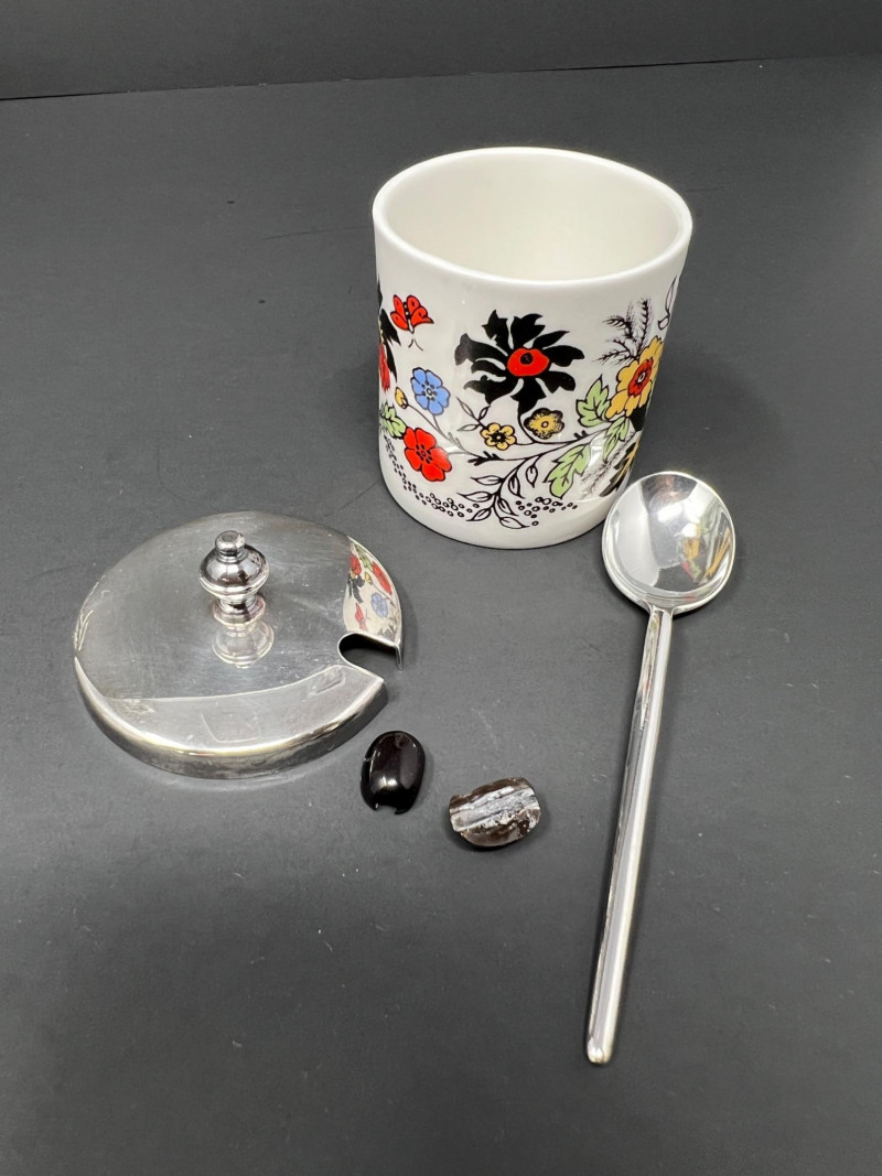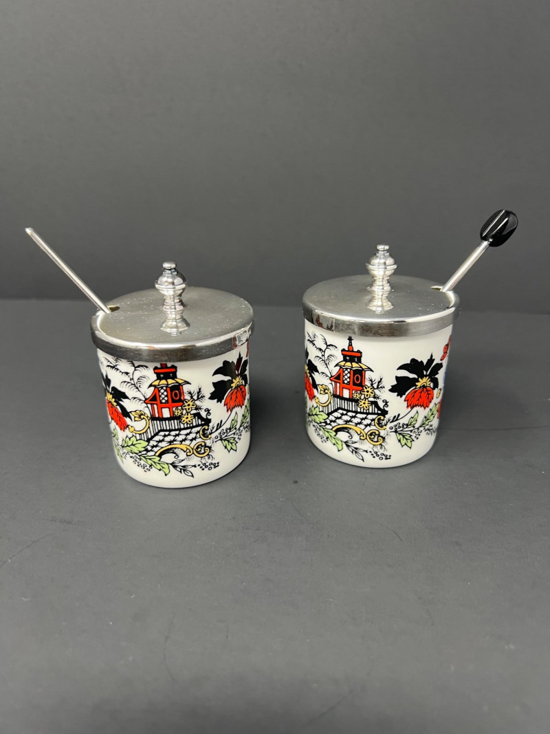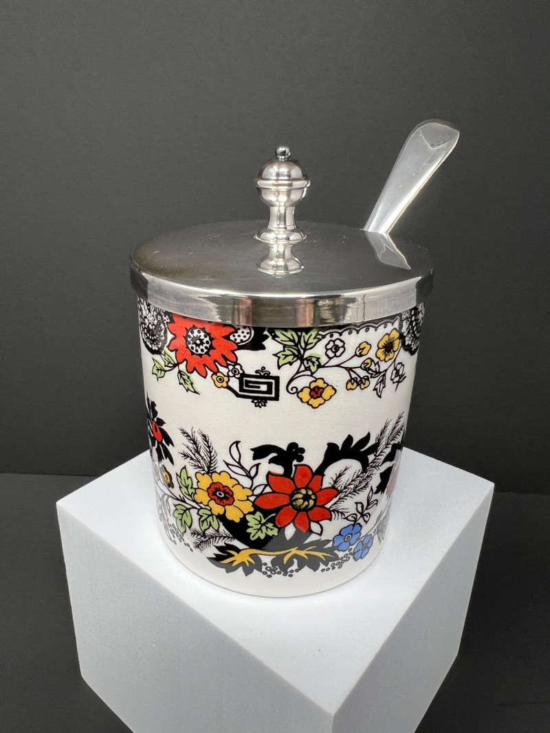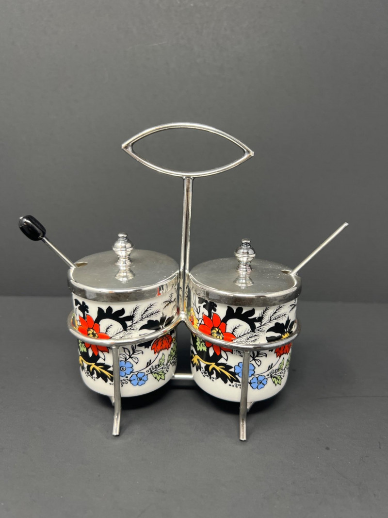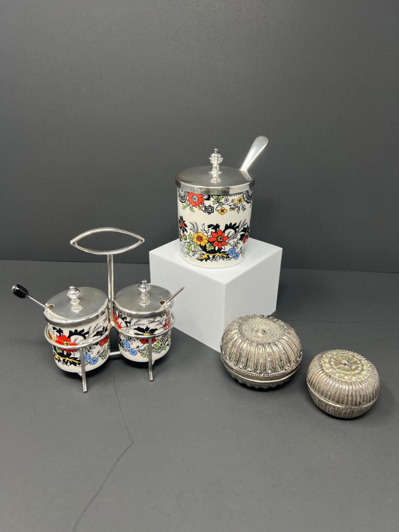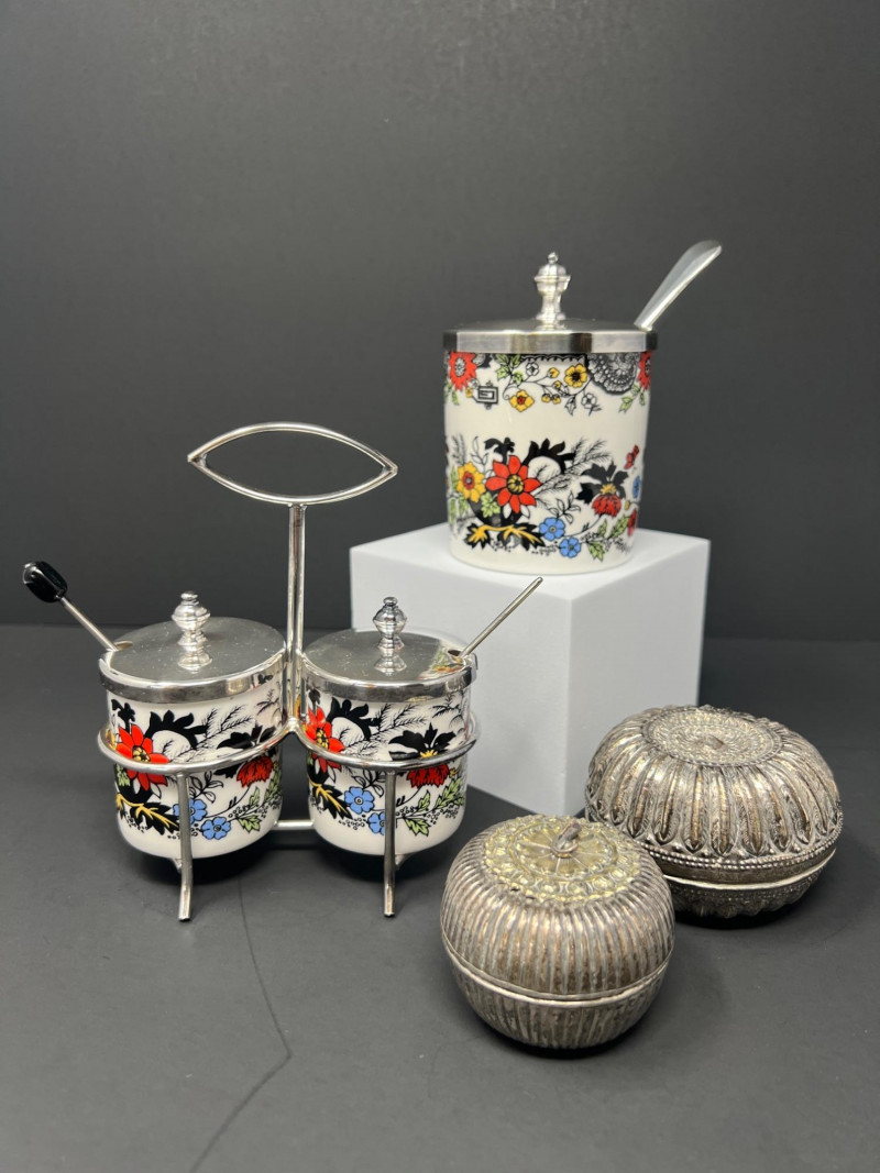 Vintage decorative table lot featuring a colorful English fine bone china condiment set marked John Anton – Made in England. The set includes two lidded condiment pots in a silver-tone stand along with a matching covered condiment jar with spoon. The porcelain features a bright floral motif in red, yellow, blue and black. Also included are two ornate silver-tone ribbed trinket boxes, likely Indian export pieces with decorative domed lids and finial handles. A charming grouping suitable for kitchen display, vanity use, or decorative storage. Condition consistent with age and use. One of the finials on a spoon in one of the smaller containers broke in half, but is present for repair. Large condiment jar is 3" dia. 4" OAH, caddy w/2 containers 5" OAH. Trinket boxes 2.75" & 3" diameter.