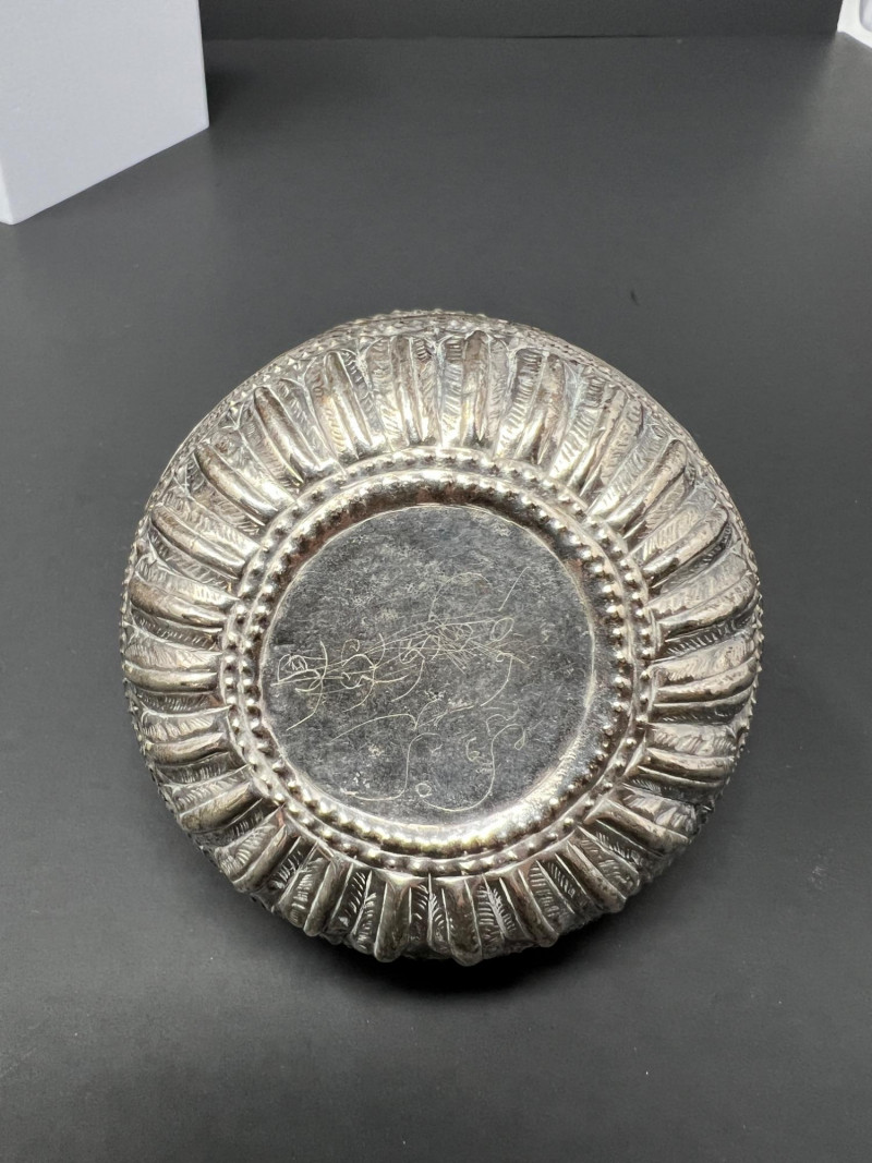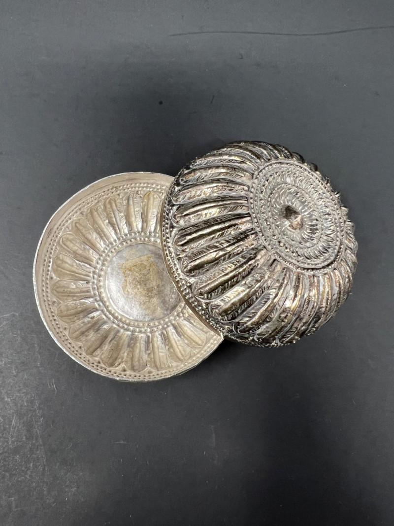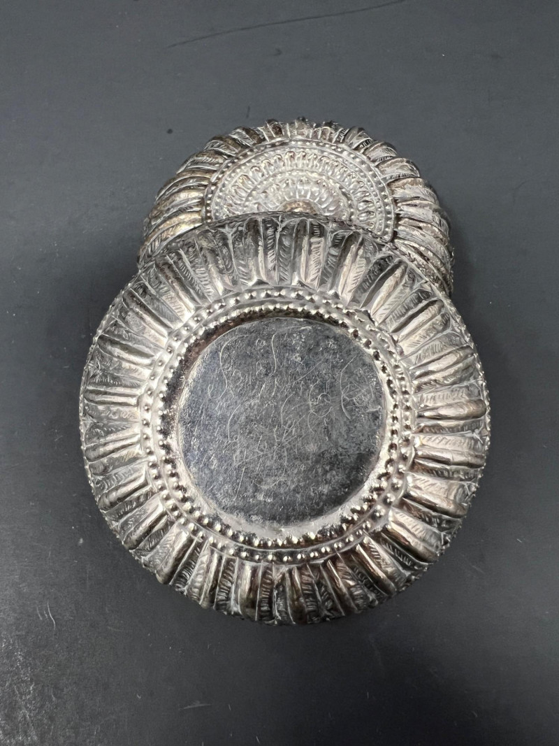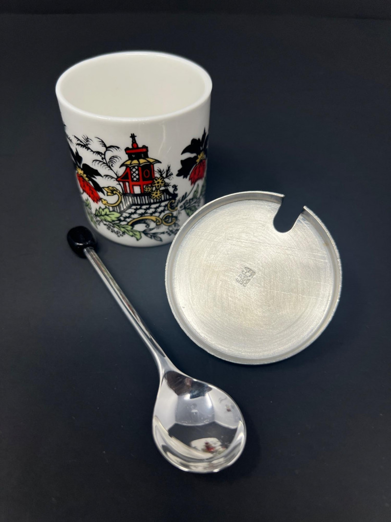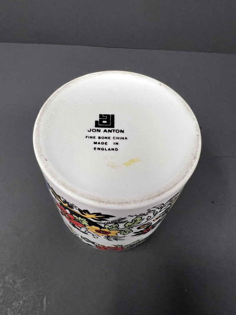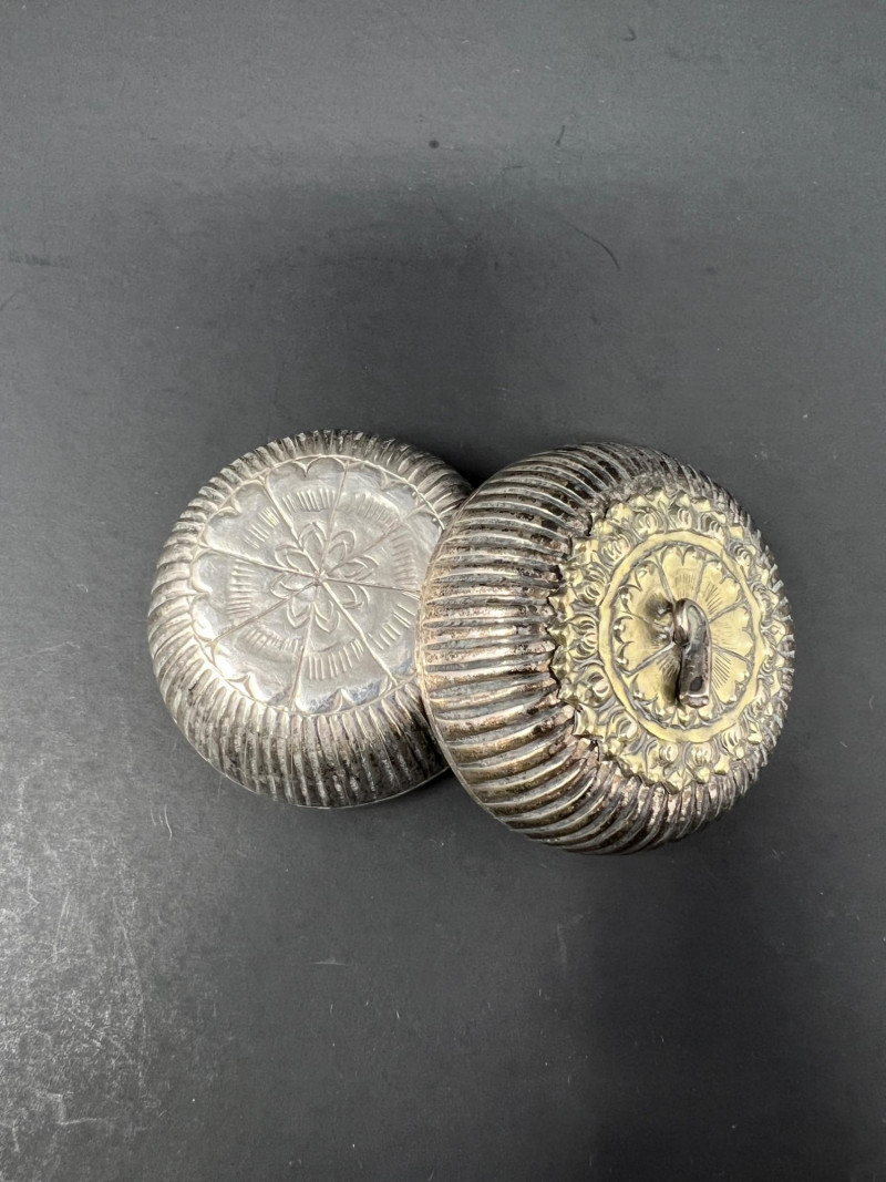 Vintage decorative table lot featuring a colorful English fine bone china condiment set marked John Anton – Made in England. The set includes two lidded condiment pots in a silver-tone stand along with a matching covered condiment jar with spoon. The porcelain features a bright floral motif in red, yellow, blue and black. Also included are two ornate silver-tone ribbed trinket boxes, likely Indian export pieces with decorative domed lids and finial handles. A charming grouping suitable for kitchen display, vanity use, or decorative storage. Condition consistent with age and use. One of the finials on a spoon in one of the smaller containers broke in half, but is present for repair. Large condiment jar is 3" dia. 4" OAH, caddy w/2 containers 5" OAH. Trinket boxes 2.75" & 3" diameter.